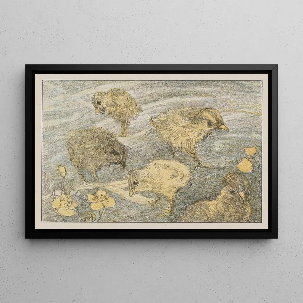 Cinq poussins : une tendresse aviaire à découvrir Dans cette œuvre délicate, Theo van Hoytema capture l'innocence et la curiosité des jeunes poussins. La composition, subtilement équilibrée, met en avant les petites créatures aux plumes duveteuses, baignées dans une lumière douce et chaleureuse. Les teintes pastel, allant du jaune pâle au beige, créent une atmosphère apaisante, presque onirique. La technique de l'aquarelle, utilisée avec finesse, permet de rendre les textures délicates des plumes et de la terre, tout en insufflant une vie vibrante à ces petits êtres. Cette reproduction de "Cinq poussins" invite à une contemplation sereine, évoquant la beauté simple de la nature. Theo van Hoytema : un pionnier de l'art animalier Theo van Hoytema, né en 1863 aux Pays-Bas, est reconnu pour son approche unique de l'art animalier, mêlant réalisme et impressionnisme. Influencé par les grands maîtres de son époque, il développe un style qui met en avant la beauté des animaux dans leur environnement naturel. Actif principalement à la fin du XIXe siècle et au début du XXe siècle, il se distingue par sa capacité à capturer l'essence des sujets qu'il peint. Son œuvre se situe à la croisée des chemins entre l'art traditionnel et les nouvelles tendances artistiques, faisant de lui une figure importante dans le paysage artistique néerlandais. Une acquisition décorative aux multiples atouts La reproduction de "Cinq poussins" de Theo van Hoytema constitue un choix décoratif idéal pour divers espaces de vie. Que ce soit dans un salon, une chambre d'enfant ou même un bureau, cette toile apporte une touche de douceur et de sérénité. Sa qualité d'impression garantit une fidélité aux couleurs et aux détails de l'œuvre originale, tout en offrant un attrait esthétique indéniable. En intégrant cette reproduction dans votre décoration, vous invitez non seulement la nature dans votre intérieur, mais vous créez également un point focal qui suscite la curiosité et l'émerveillement.