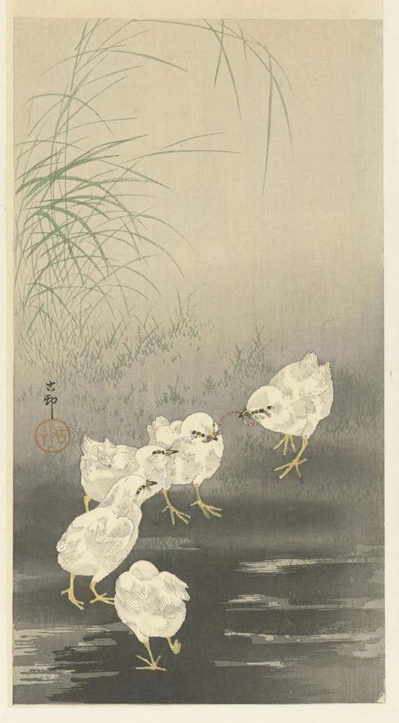 Druk artystyczny | Poussins et ver - Ohara Koson