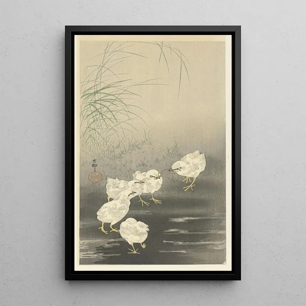Druk artystyczny dzieła "Poussins et ver" Ohara Koson przenosi nas w świat pełen łagodności i spokoju. Pisklęta, przedstawione z niezwykłą precyzją, wydają się wyłaniać z spokojnego świata, podczas gdy robak, symbol natury, harmonijnie wpisuje się w tę scenę. Kolory pastelowe, zdominowane przez delikatne odcienie żółci i zieleni, tworzą kojącą atmosferę. Technika druku na drewnie, charakterystyczna dla japońskiego artystycznego rzemiosła, nadaje tej reprodukcji unikalną teksturę, niemal dotykową, zachęcając widza do zanurzenia się w tej delikatnej prezentacji dzikiego życia.
