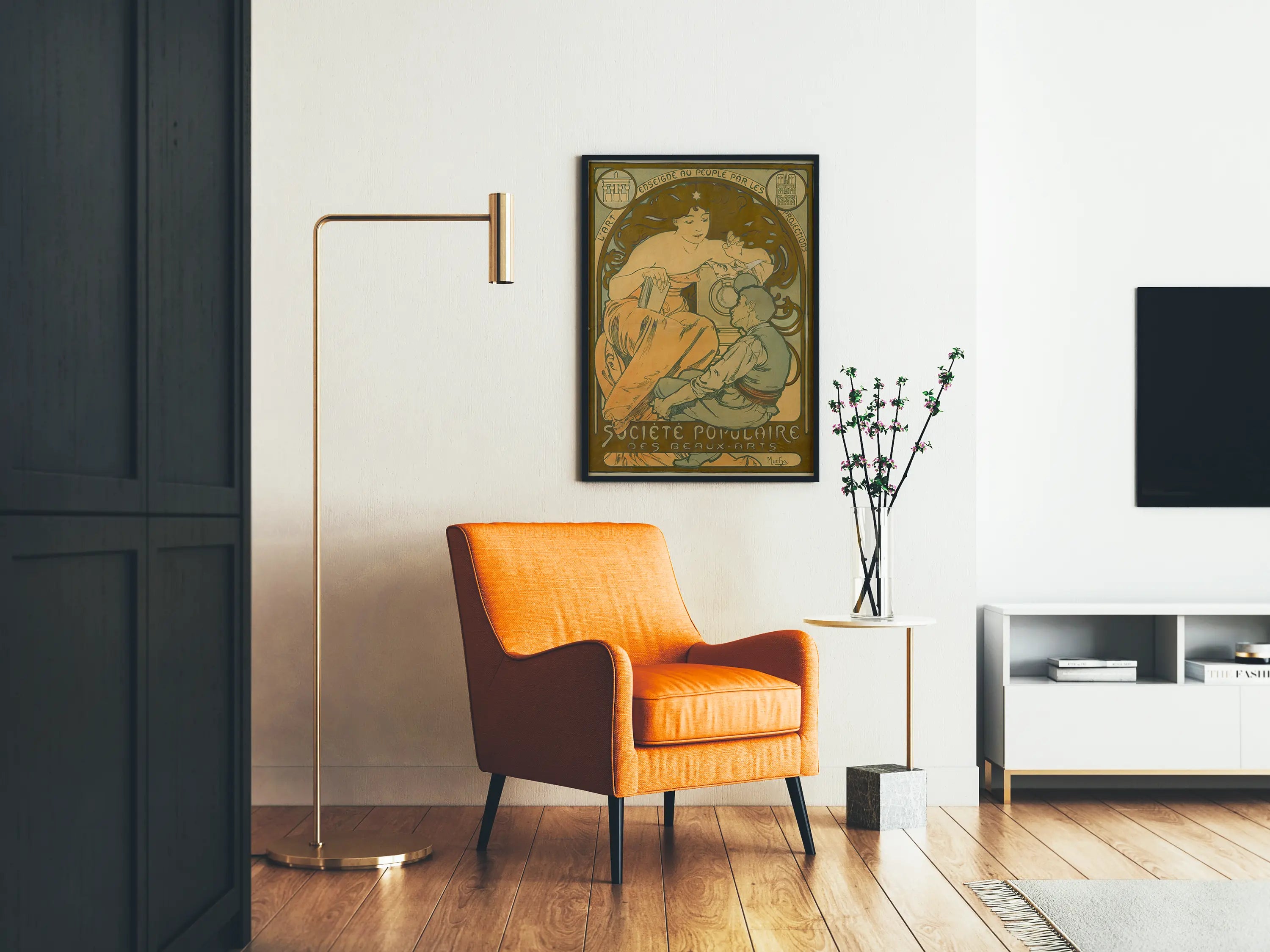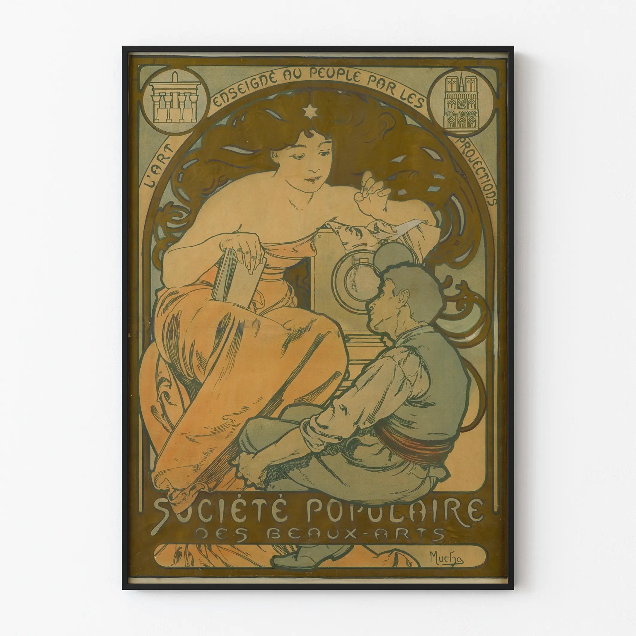 Ta ikona plakatu Towarzystwa Popularnych Sztuk Pięknych jest prawdziwym dziełem dekoracji ściennej inspirowanym stylem secesyjnym, zilustrowanym przez Alphonse'a Muchę. Ukazuje kobietę o łagodnej twarzy i unoszących się włosach, symbol przekazywania wiedzy artystycznej ludowi, co podkreśla tekst na górze: „SZTUKA NAUCZA LUD OD PROJEKCJI”. Scena centralna przedstawia tę postać kobiecą trzymającą książkę i obsługującą urządzenie projekcyjne, podczas gdy młody chłopiec, siedzący u jej stóp, wydaje się uważny, symbolizując edukacyjną i popularyzującą rolę tego stowarzyszenia artystycznego. Dwa medaliony w lewym i prawym górnym rogu otaczają obraz, przedstawiając klasyczne architektury i katedrę, symbole dziedzictwa kulturowego i artystycznego. Ramka dekoracyjna, bogata w krzywizny i faliste linie, jest typowa dla stylu secesyjnego, dodając całości płynności i elegancji. Ta plakatowa ilustracja prezentuje się jako mural w ciepłych, naturalnych odcieniach, idealny do vintage’owej lub artystycznej dekoracji ściennej, doskonały dla miłośników sztuki i historii kulturowej. Wzbudza zarówno zaangażowanie społeczne i artystyczne, pedagogikę obrazem, jak i piękno organicznych form charakterystycznych dla tego okresu. Ten drukowany mural jest zaproszeniem do ponownego odkrywania sztuki w sposób dostępny i popularny, będąc wizualnym ucieleśnieniem związku między sztuką a publicznością.