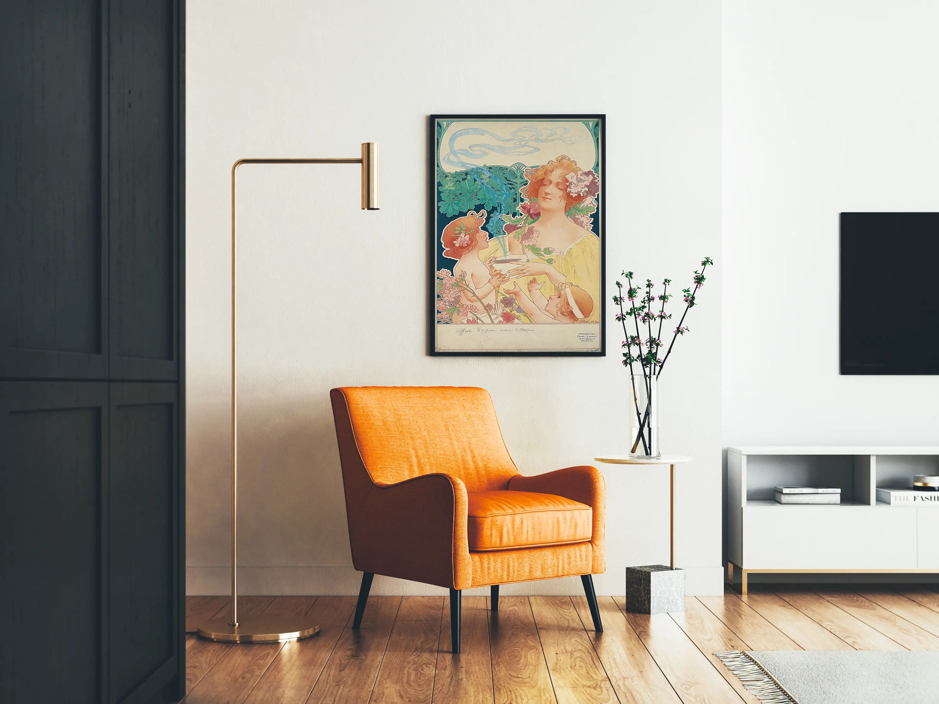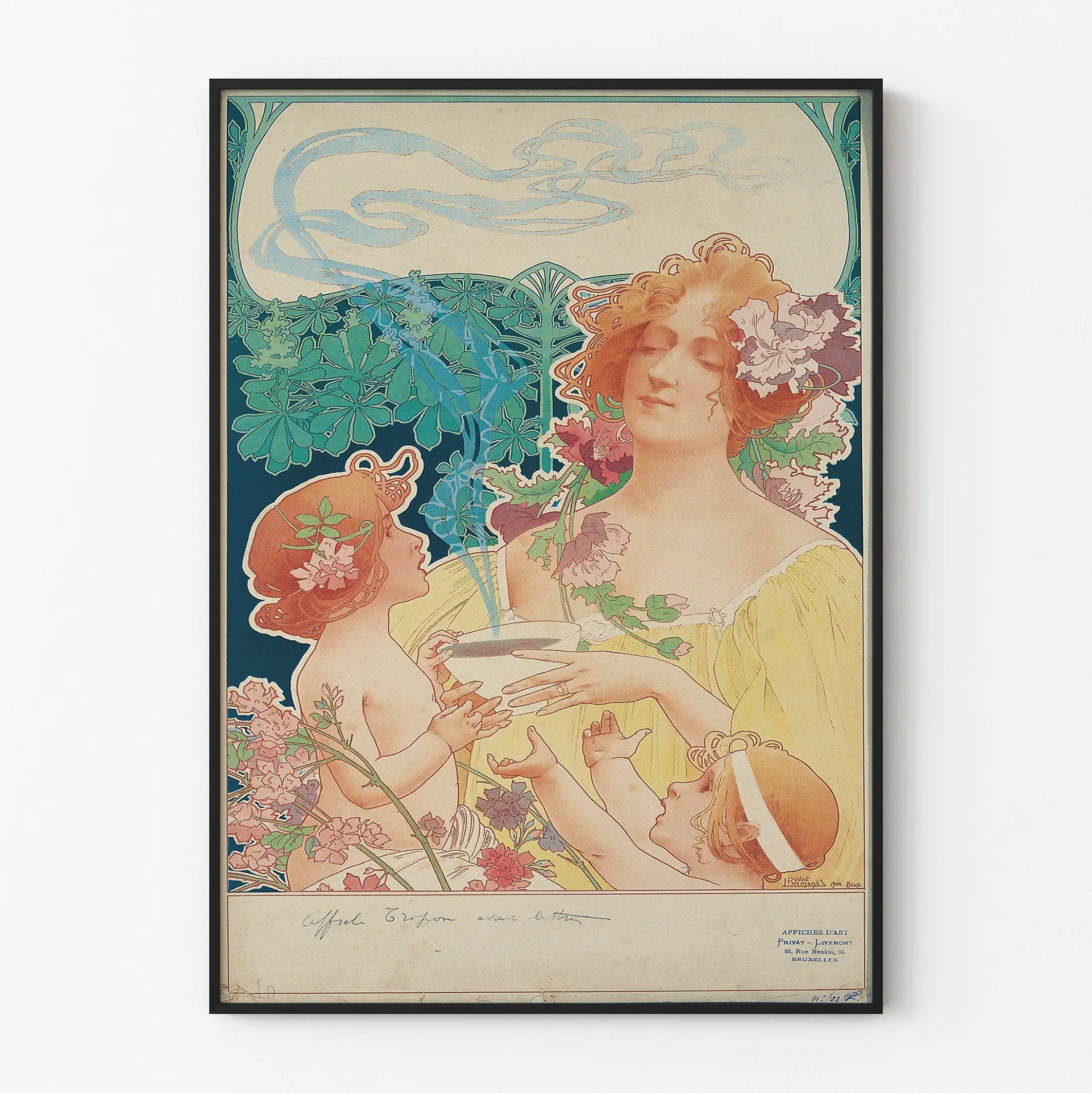 Poznaj tę dekoracyjną plakat art nouveau przedstawiający subtelną scenę wokół czekolady i kakao. Ta ścienna ozdoba, typowa dla stylu końca XIX i początku XX wieku, ukazuje spokojną kobietę otoczoną dwójką dzieci, wszyscy zaangażowani w chwilę dzielenia się i cieszenia się parzącym, gorącym napojem. Rysunek podkreśla delikatność linii i wyrafinowanie detali kwiatowych zdobiących postacie, symboli harmonii i natury, charakterystycznych dla ruchu art nouveau.