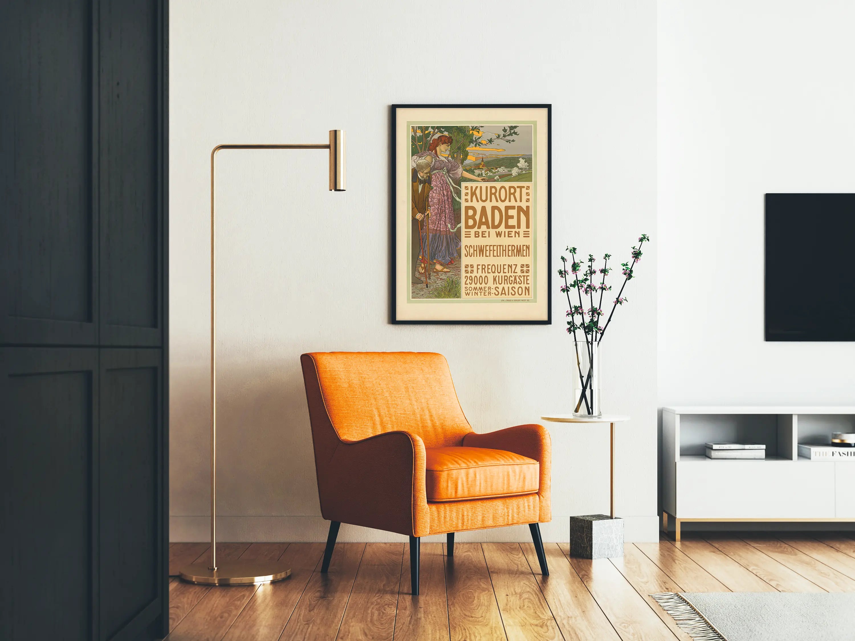 Poznaj tę vintage plakat w stylu secesyjnym, przedstawiający Kurort Baden — słynną uzdrowiskową miejscowość położoną niedaleko Wiednia. Ta dekoracja ścienna zachwyci miłośników klasycznej sztuki i starych plakatów reklamowych. Ramka tego plakatu ukazuje dwóch bohaterów, mężczyznę i kobietę w strojach z epoki, podziwiających kojący pejzaż natury w ciepłych, szczegółowych tonacjach. Kobieta, ubrana w długą suknię ozdobioną motywami kwiatowymi, kieruje wzrok na malowniczą wioskę z kościołem z czerwonym dachem, położoną pośród zielonych, kwitnących wzgórz, pod niebem o odcieniach pomarańczy, przypominającym zachód słońca. Tekst, napisany wielkimi literami i w charakterystycznym dla epoki stylu typograficznym, informuje o uzdrowisku Baden niedaleko Wiednia, słynącym z źródeł siarkowych, oraz o rocznej liczbie odwiedzających — 29 000 turystów w sezonie letnim i zimowym. Ten vintage plakat to doskonała propozycja do podkreślenia wnętrza z nutą historii i retro uroku. Niezależnie od tego, czy to salon, biuro czy przestrzeń kulturalna, ten obraz wprowadza relaksującą i elegancką atmosferę, idealną dla miłośników dekoracji ściennych pełnych nostalgii i autentyczności. Wprowadź unikalną estetykę dzięki temu plakatowi, który harmonijnie łączy sztukę i historię w elegancki sposób.