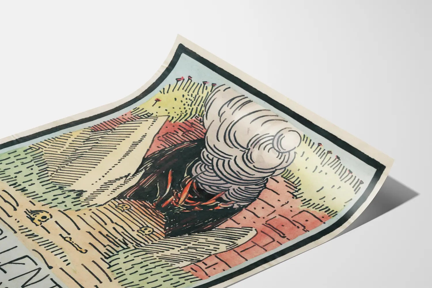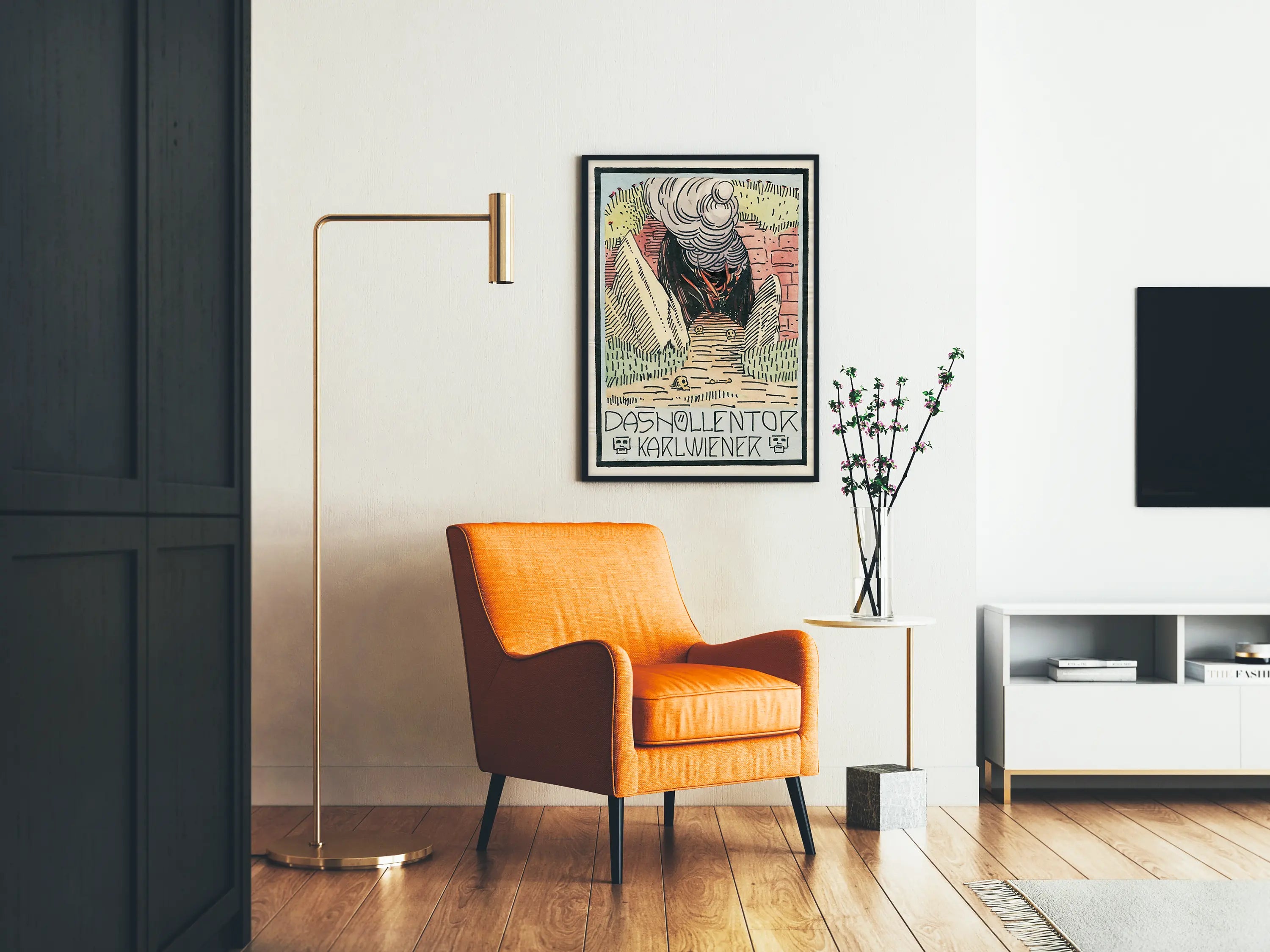 Plakat zatytułowany „Das Hollentor” przedstawia tajemniczą i dramatyczną ilustrację, idealną do oryginalnej i sugestywnej dekoracji ściennej. Rysunek ukazuje łuk lub bramę otoczoną wysokimi murami, przy której na ścieżce leżą czaszki i kości, podkreślając mroczną i intrygującą atmosferę. Z tej bramy unosi się wirujący obłok, sugerujący obecność mistyczną lub piekielną, przyciągając wzrok ku centrum kompozycji. Paleta użytych barw, łącząca pastelowe odcienie zieleni, czerwieni, żółci i czerni, podkreśla kontrast między otaczającą naturą a zagrożeniem wyłaniającym się z bramy. Styl graficzny, zarazem liniowy i wyrazisty, tworzy dramatyczną i symboliczną atmosferę charakterystyczną dla plakatów artystycznych, które chcą zapadać w pamięć. U dołu plakatu stylizowany napis w języku niemieckim informuje „DAS HOLLENTOR” i „KARL WIENER”, dodając dziełu historycznego i kulturowego charakteru. Ten plakat to doskonały element do wnętrza, które pragnie ozdobić się unikalną dekoracją ścienną, łączącą sztukę, tajemnicę i historię. Idealnie wpasuje się w salon, biuro lub galerię sztuki, przyciągając uwagę swoją siłą wizualną i wyrazistym stylem. Wybór tego plakatu to wprowadzenie do przestrzeni elementu wizualnego ekspresjonizmu z nutą gotyku i symbolizmu, tworząc atmosferę zarówno intelektualną, jak i estetyczną.