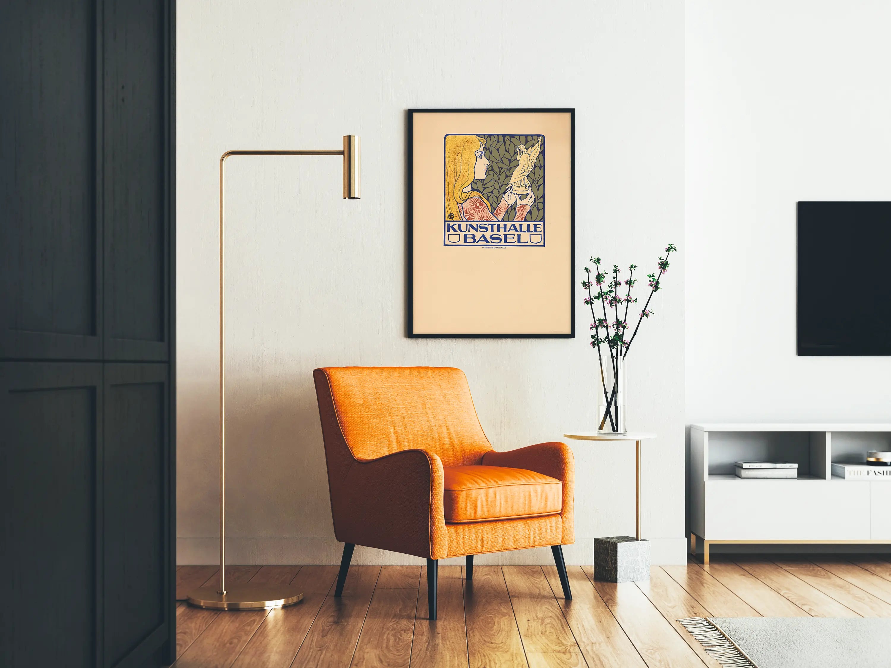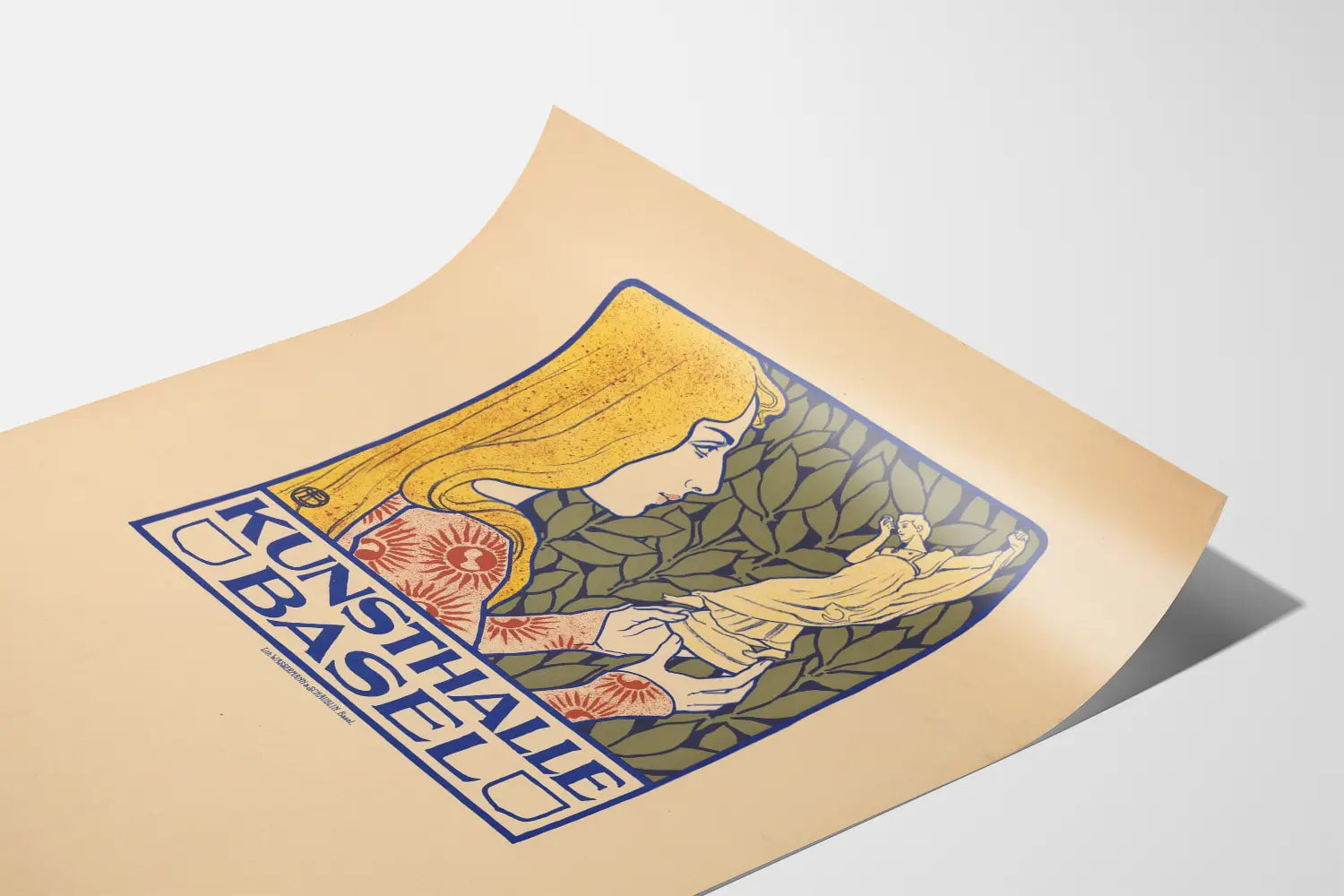 Ta plakat Kunsthalle Basel jest unikalnym dziełem, które upiększy każde wnętrze ścienne swoim charakterystycznym stylem artystycznym. Przedstawia stylizowany rysunek młodej kobiety z blond włosami, ubraną w suknię ozdobioną czerwonymi motywami słonecznymi, delikatnie trzymającą statuetkę. Tło tego obrazu składa się z gęstego listowia, wprowadzając do kompozycji naturalny i subtelny kontrast. Ramka w głębokim odcieniu niebieskiego wokół ilustracji oraz nazwa „Kunsthalle Basel” umieszczona na dole dużymi, niebieskimi literami podkreślają graficzny i elegancki charakter tego plakatu. Dzięki stonowanym tonacjom połączonym z akcentami jaskrawego żółtego i czerwonego, ta reprodukcja jest idealna do wnętrza poszukującego elementu dekoracyjnego zarówno vintage, jak i wyrafinowanego. Doskonale pasuje do salonu, biura czy galerii sztuki, które szukają oryginalnego elementu ściennego. Ten plakat, wydrukowany techniką litograficzną, stanowi piękny przykład wizualnej komunikacji artystycznej, wprowadzając ciepłą i kulturalną atmosferę. Podarowanie lub zakup tego plakatu Kunsthalle Basel to wybór artystycznego elementu dekoracji ściennej o dużym potencjale estetycznym, łatwo wpisującego się w klasyczne lub eklektyczne aranżacje. Elegancki sposób wyrażenia swojego zainteresowania sztuką i designem, jednocześnie dodając charakteru swojemu wnętrzu.