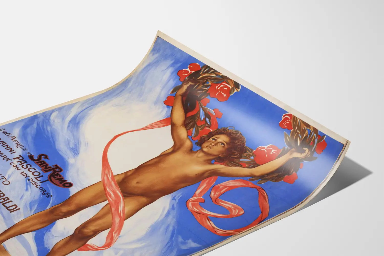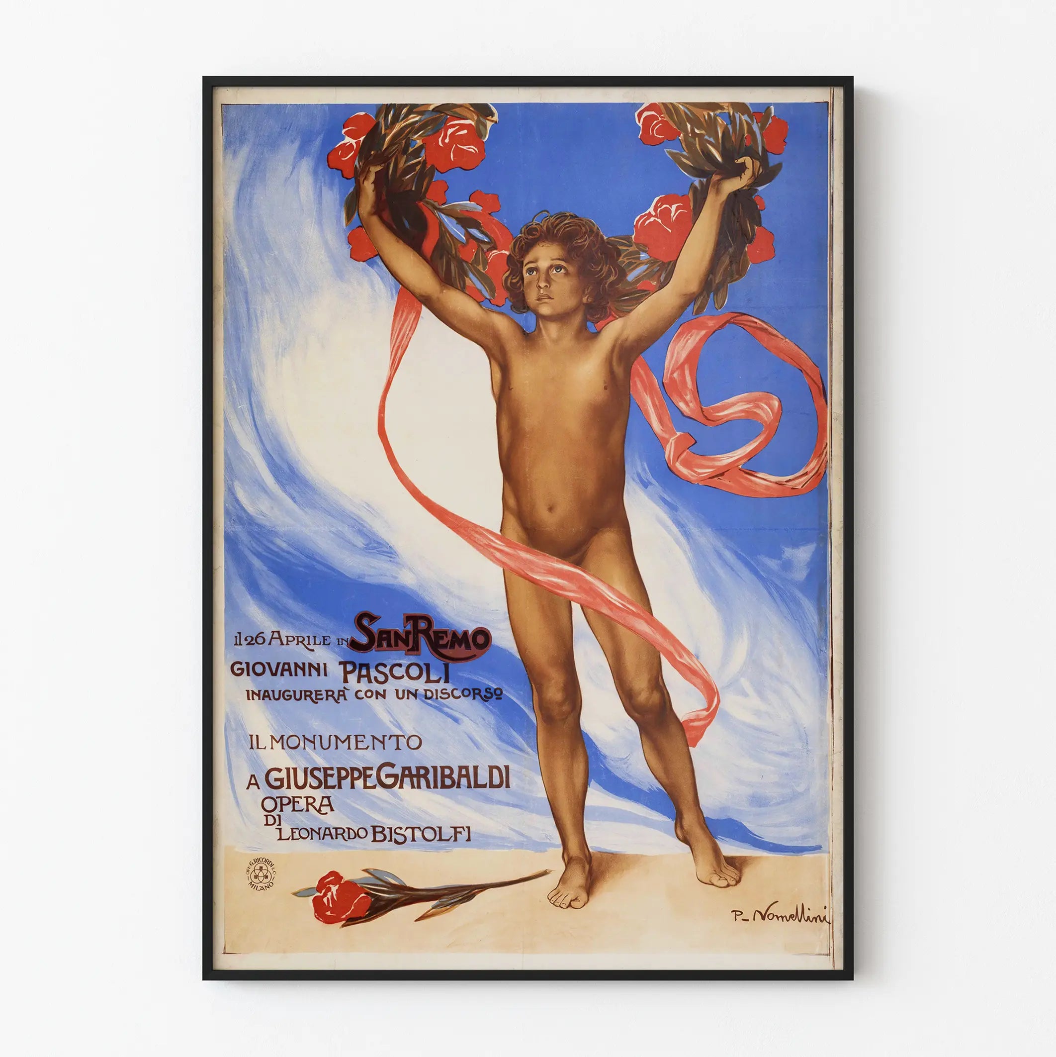 Ta unikalna i wyrazista plakat upamiętnia pomnik poświęcony Giuseppe Garibaldi, ikonie włoskiej historii. W centrum przedstawiona jest postać nagiego dziecka, trzymająca nad głową dużą koronę z czerwonych kwiatów, połączoną z czerwonym wstążkiem unoszącym się, co dodaje kompozycji dynamizmu. Tło w odcieniach niebieskiego i białego tworzy silny kontrast z ciepłymi, naturalnymi barwami postaci i elementów roślinnych, podkreślając ruch i symboliczne znaczenie obrazu. Ta praca zawiera także napisy po włosku wspominające San Remo i Giovanni Pascoli, zapowiadające uroczystość z przemówieniem, co ukazuje jej znaczenie kulturowe i upamiętniające w kontekście historycznym i artystycznym. Podpisana przez P. Novellini, odzwierciedla klasyczną estetykę z nutą symbolizmu i ducha patriotyzmu. Ta sztuka jest idealna do dekoracji ścian, zarówno w nowoczesnych, jak i klasycznych wnętrzach, wnosząc silny wymiar kulturowy i wyrafinowany styl artystyczny. Jako plakat lub afisz, stanowi atrakcyjny element dla tych, którzy chcą podkreślić przestrzeń mocnym obrazem z przesłaniem hołdu i pamięci. Dzięki swojemu designowi i ikonografii, ta dekoracja ścienna wzbogaca zarówno przestrzenie prywatne, jak i miejsca poświęcone kulturze i historii.