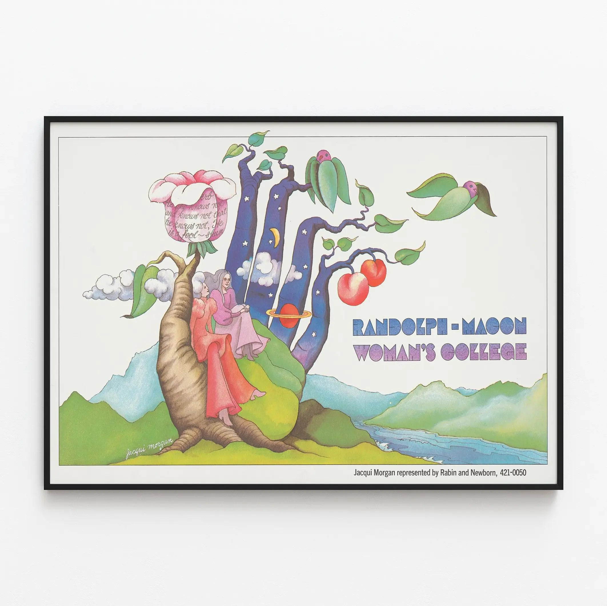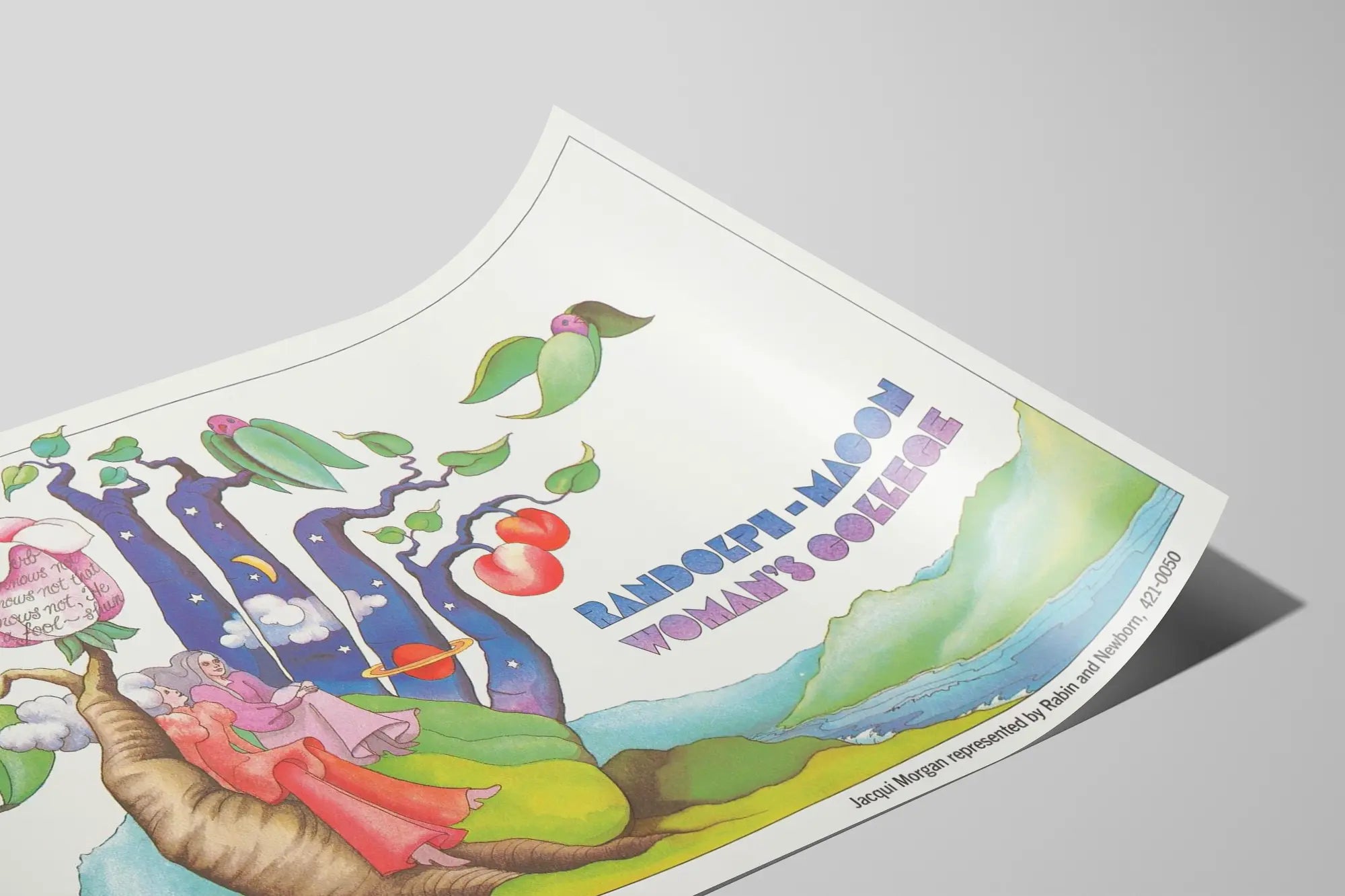 Ta plakatka Randolph-Macon Woman’s College, podpisana przez Jacqui Morgan, to unikalny element dekoracji ściennej, który przyciąga uwagę swoim poetyckim i marzycielskim stylem. Grafika przedstawia dwie kobiece postacie siedzące na korzeniach drzewa o organicznych, kolorowych kształtach. Pień drzewa przechodzi w stylizowane gałęzie z motywami niebiańskimi – gwiazdami, księżycem, chmurami – oraz czerwonymi owocami, co tworzy atmosferę jednocześnie delikatną i tajemniczą. Paleta barw, łącząca łagodne odcienie zieleni, różu i fioletu oraz głębokie odcienie niebieskiego, dodaje wizualnej równowagi i harmonii. Tekst „Randolph-Macon Woman’s College” w geometrycznej typografii, umieszczony po prawej stronie obrazu, dopełnia całość, nadając jej retro i graficzny charakter. Ta plakatka doskonale pasuje jako element dekoracji ściennej w nowoczesnym lub retro wnętrzu, zarówno w salonie, biurze, jak i przestrzeni do nauki. Jest skierowana do miłośników grafiki i plakatów vintage, a także tych, którzy cenią oryginalną dekorację ścienną łączącą elementy naturalne i symboliczne. Niezależnie od tego, czy pasjonujesz się ilustracją, projektowaniem graficznym, czy aranżacją wnętrz, ten plakat podkreśli Twoje ściany, wnosząc nutę wizualnej poezji i niepowtarzalny urok. Podaruj swojemu wnętrzu inspirującą i delikatną atmosferę dzięki tej plakatce Randolph-Macon Woman’s College, prawdziwemu eleganckiemu i wyróżniającemu się obiektowi sztuki dekoracyjnej.