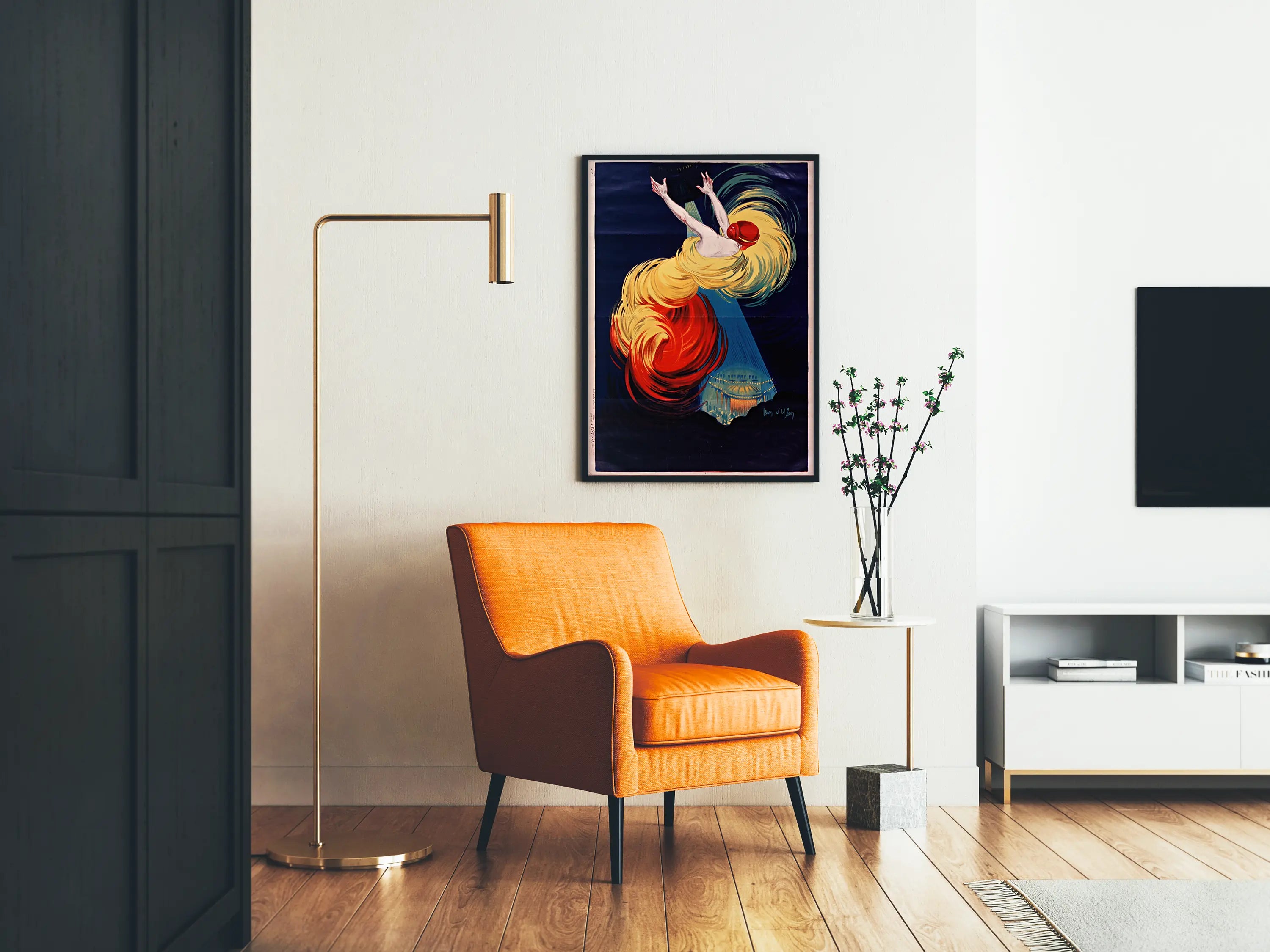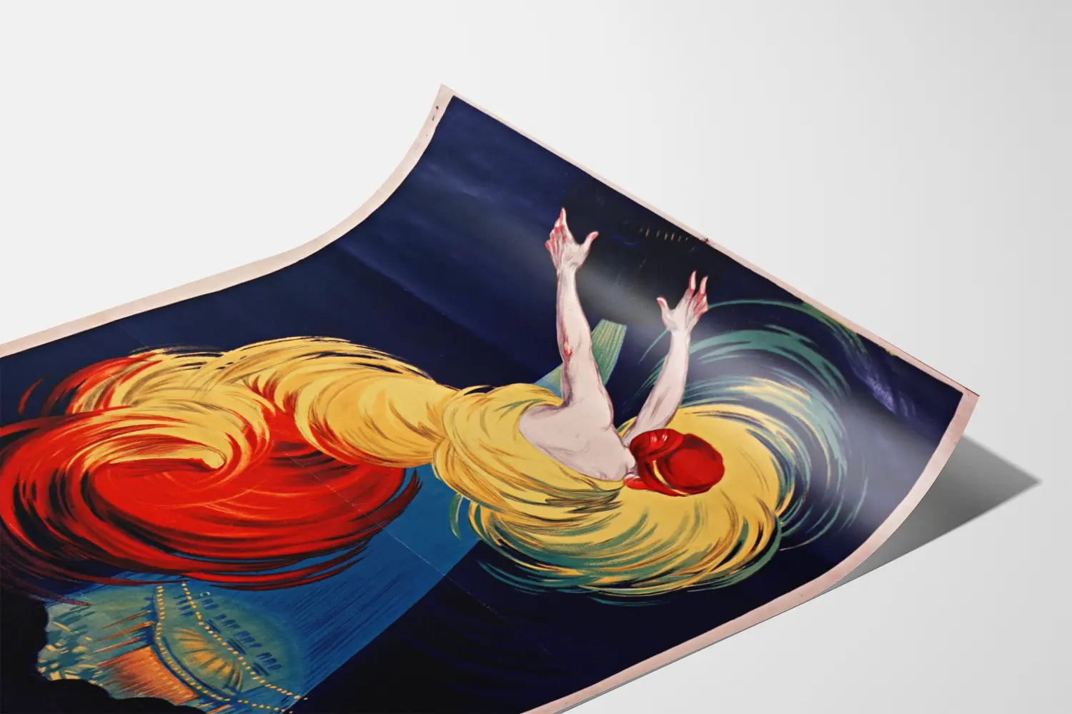 Odkryj tę artystyczną reprodukcję przedstawiającą tancerkę w dynamicznym ruchu, uchwycającą energię i płynność scenicznego występu. Ta dekoracja ścienna podkreśla krzywizny i wiry jaskrawych kolorów, z dominacją jaskrawożółtych i czerwonych odcieni, które kontrastują z głębokim, niebieskim tłem. Postawa tancerki, wyciągnięte ramiona ku górze i odwrócona głowa, przekazują uczucie zapału i gracji, przywołując intensywność spektaklu pod reflektorami. Tło ukazuje rozświetlone miejsce, być może teatr lub sala koncertowa, co wzmacnia świąteczną i artystyczną atmosferę kompozycji. Ta reprodukcja, z nutą retro i wyraźnym stylem graficznym, jest doskonałym wyborem na oryginalną i pełną życia dekorację ścienną. Doda charakteru salonowi, sali tanecznej lub każdemu miejscu poświęconemu sztuce i kulturze. Kontrast kolorów i dynamika rysunku sprawiają, że ten plakat jest wyjątkowym elementem dekoracyjnym, idealnym do ozdobienia ściany z nutą elegancji i ruchu. Ta reprodukcja pasuje do wszystkich miłośników sztuki graficznej, tańca i występów wizualnych, poszukujących wyrazistego elementu do swojego wnętrza. Podsumowując, ten plakat Taniec Moskwy to zaproszenie do emocji i ruchu, prawdziwe współczesne dzieło sztuki, które podkreśli Twoją dekorację ścienną.