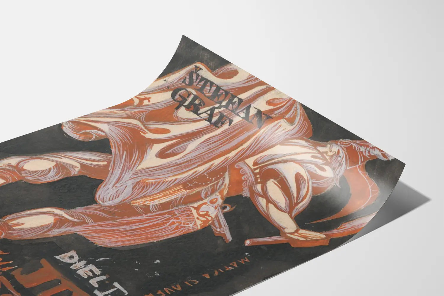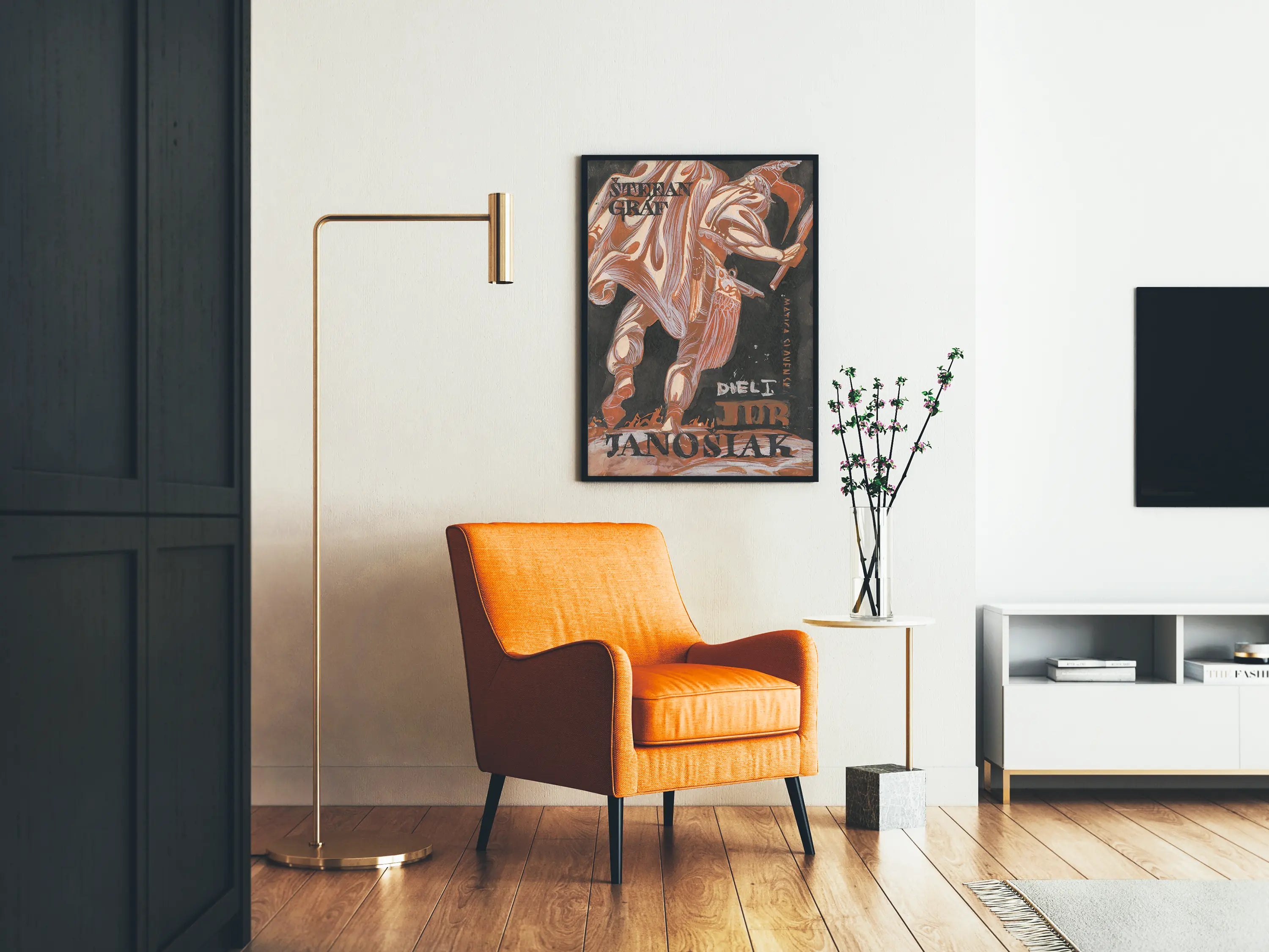 Poznaj tę artystyczną, vintage plakat przedstawiający dynamiczną i wyrazistą ilustrację, podpisaną przez Stefana Grafa. Ta dekoracja ścienna łączy ciepłą paletę barw, zdominowaną przez odcienie spalonej ziemi, z akcentami beżu i głębokim czarnym tłem, co zapewnia silny kontrast i wyrazistą obecność wizualną. Artysta ukazuje postać w ruchu, z wysmukloną muskulaturą i zdobieniami, co nadaje tej kompozycji zarówno staroświecki, jak i dramatyczny urok. Ten plakat doskonale komponuje się zarówno w nowoczesnym wnętrzu, jak i w klasycznym wystroju, dodając autentyczności i charakteru. Wykonany ręcznie, z odważnymi liniami i płynnymi kształtami, ten obraz jest idealny dla miłośników dekoracji ściennych, którzy chcą wyróżnić ścianę mocnym, centralnym elementem. Połączenie solidnych i kaligraficznych krojów pisma dodaje graficznego akcentu, podkreślając tytuł „Jur Janosiak” widoczny na plakacie. Niezależnie od tego, czy w salonie, biurze czy sypialni, ten obraz na ścianę zachęca do ucieczki, przywołując atmosferę epoki i unikalny świat wizualny. Wprowadź na swoje ściany ten vintage plakat artystyczny, zarówno oryginalny, jak i wyrazisty, idealny do wzbogacenia kolekcji unikalnych dekoracji ściennych.
