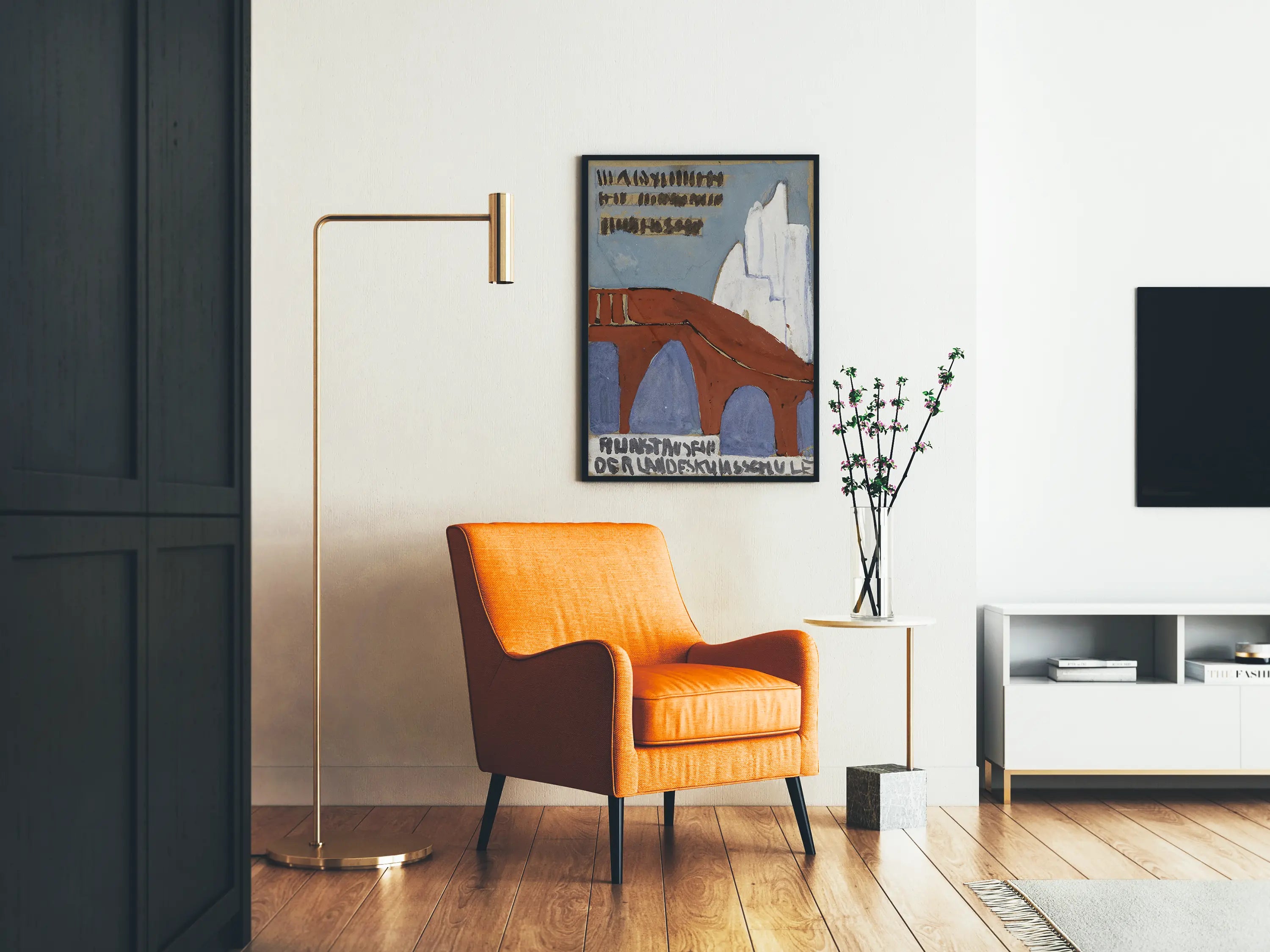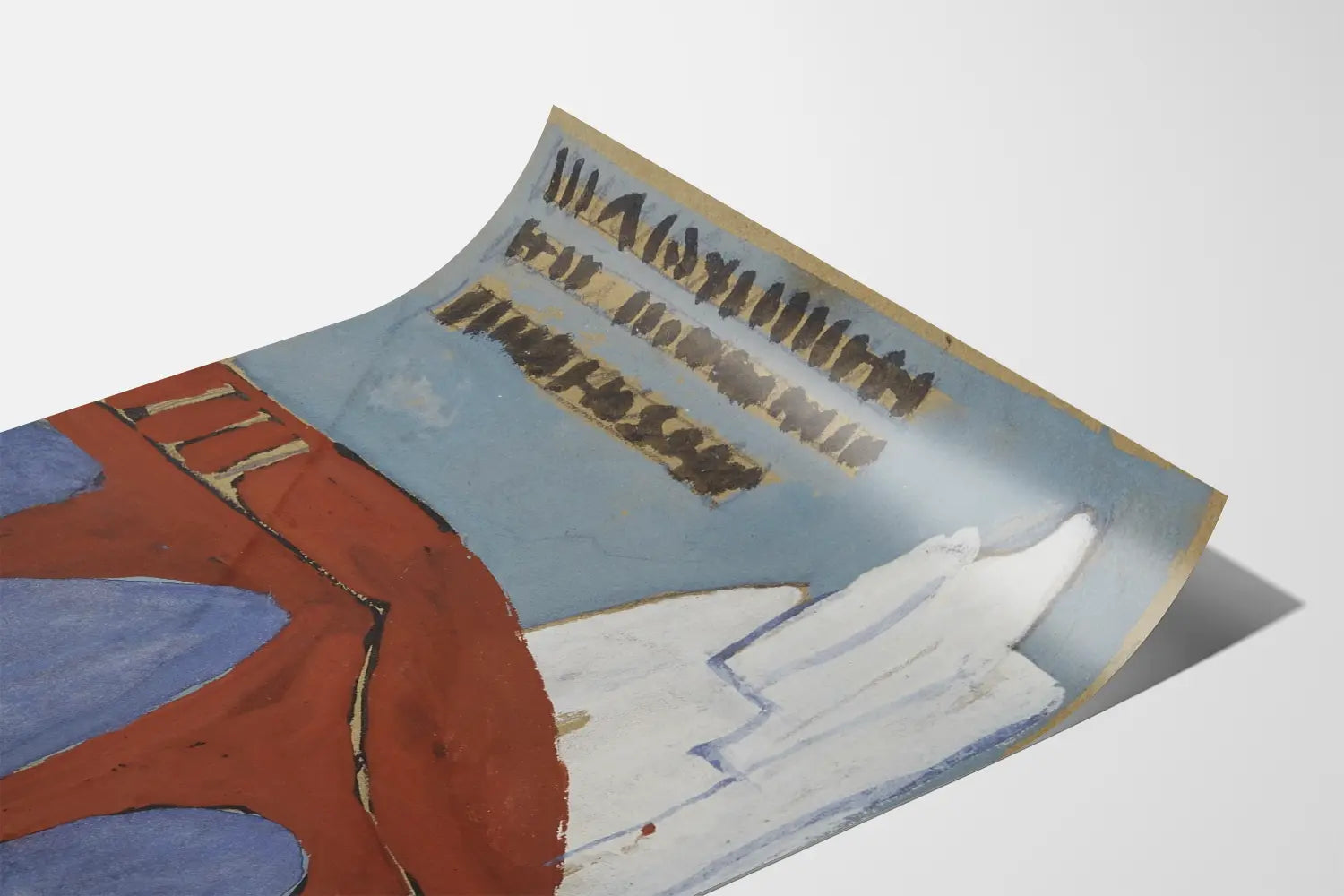 Ta oryginalna plakat przedstawia charakterystyczny projekt graficzny łączący formy architektoniczne i elementy tekstowe. Widać na nim łukowy most pomalowany na brązowo-czerwony kolor, rozciągający się od jednego brzegu do drugiego kompozycji. W tle, zestaw białych form z niebieskimi konturami zdaje się przedstawiać stylizowaną konstrukcję lub pejzaż. Tło w odcieniach niebieskiego i beżu tworzy delikatny kontrast z elementami na pierwszym planie. U góry plakatu, czarne linie tekstu na tle ochrowym, a także na dole, tytuł wielkimi literami sugerują ogłoszenie lub reklamę związaną z "Kunstmuseum der Landeskunstschule". To muralowe dzieło, inspirowane sztuką nowoczesną i abstrakcyjną grafiką, jest idealne jako oryginalna i kulturalna dekoracja ścienna. Plakat doskonały do uzupełnienia nowoczesnego wnętrza lub przestrzeni poświęconej sztuce i historii. Łatwo wpisuje się w styl minimalistyczny, bohemyczny lub przemysłowy. Ten dekoracyjny plakat ścienny zachęca do odkrywania europejskiego dziedzictwa artystycznego, jednocześnie dodając wizualnej elegancji dzięki równowadze między formami geometrycznymi a malowanymi teksturami. Unikalny dodatek dla miłośników sztuki i projektowania graficznego.