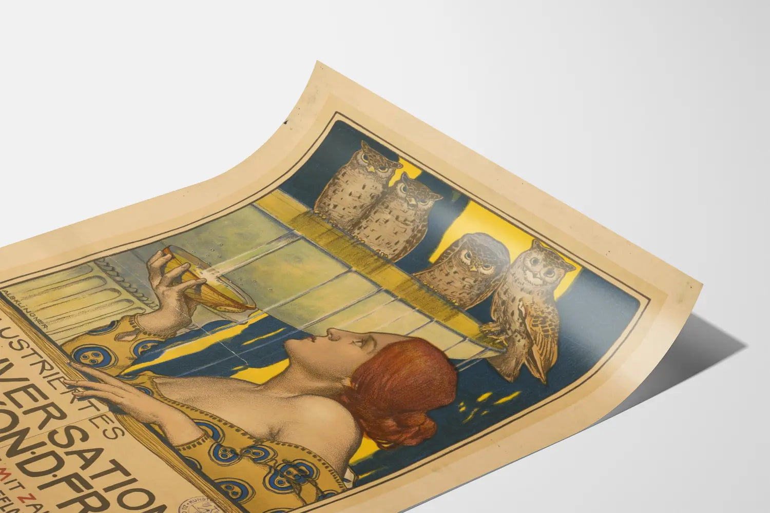 Ta vintage plakat z ilustracją przedstawia oryginalną scenę z kobietą z rudym kokiem, ubraną w elegancką suknię z motywami w odcieniach niebieskiego i żółtego, trzymającą miskę, z której spływa woda. Nad nią cztery sowy siedzą na krawędzi, w tle mieszają się kolory niebieski, żółty i beżowy. Styl graficzny przypomina stare plakaty, z wyraźną ramką i tekstem w języku niemieckim, używającym typografii charakterystycznej dla końca XIX lub początku XX wieku.