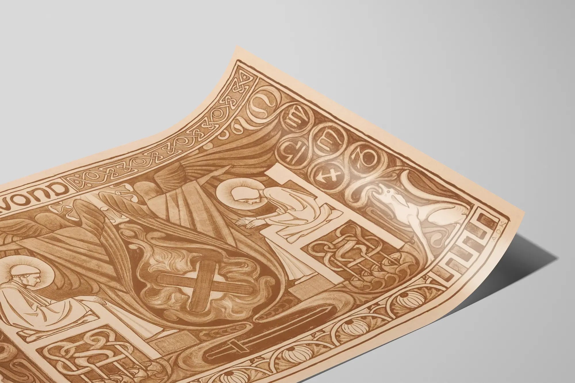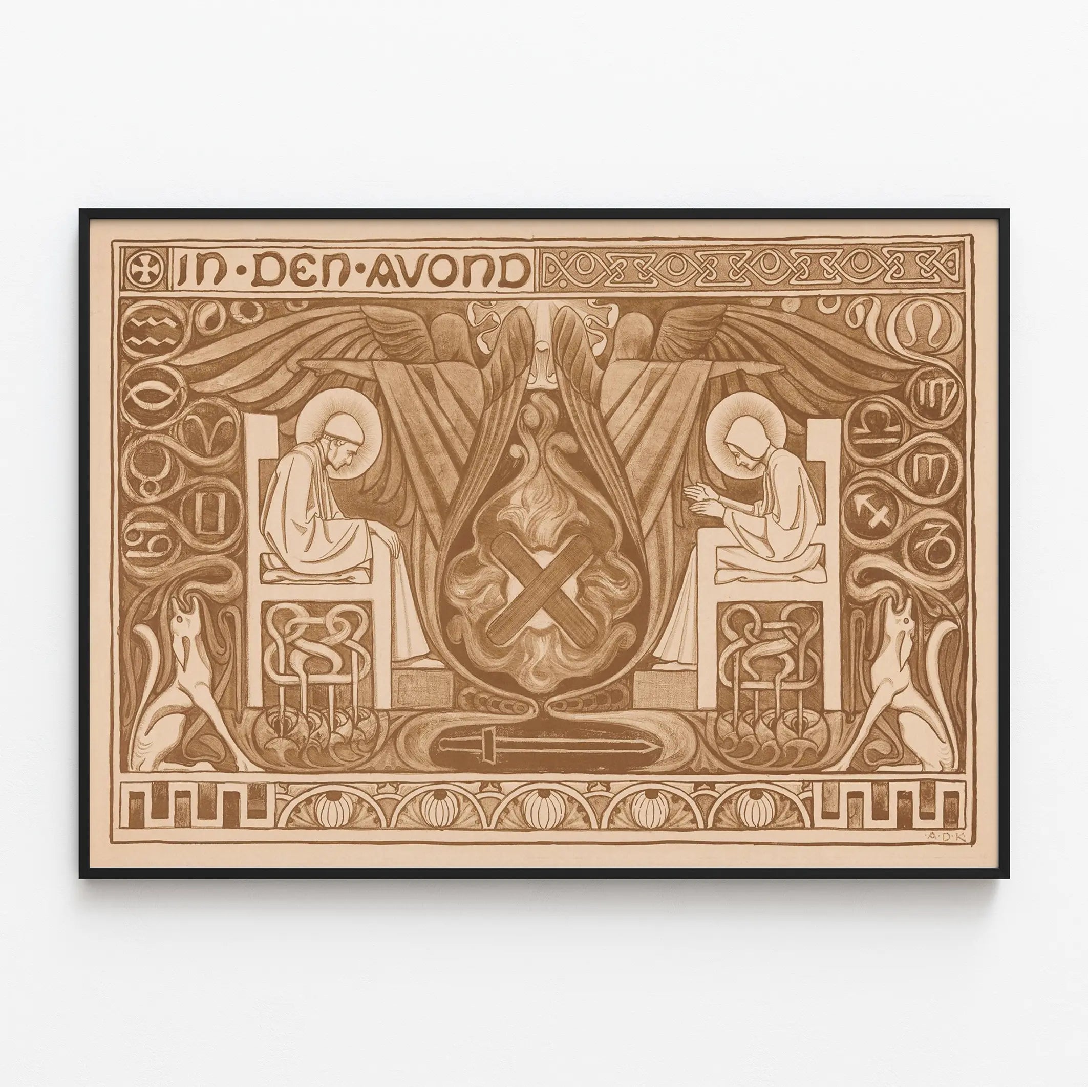 Ta dekoracyjna plakat zatytułowany „In Den Avond” przenosi nas w świat graficzny inspirowany stylem średniowiecznym lub secesyjnym, charakteryzujący się starannie narysowanymi liniami i monochromatyczną paletą sepia. Przedstawia dwie postacie siedzące na kolanach w modlitwie, ozdobione świetlistymi aureolami, co nadaje dziełu poważny i mistyczny nastrój. Otoczone skomplikowanymi motywami geometrycznymi i symbolami okrągłymi nawiązującymi do znaków zodiaku, postacie towarzyszą dwie skrzydlate sylwetki unoszące się w centrum kompozycji. Obecność stylizowanego ognia pośrodku oraz miecz ułożony na dole obrazu podkreślają symboliczne i duchowe znaczenie tej dekoracji ściennej. Bogato zdobiona ramka z wplecionymi wzorami i figurami zwierząt przypomina starożytne iluminacje, nadając plakatowi silny wymiar historyczny i artystyczny. Ten plakat doskonale wpisuje się w wnętrza poszukujące autentyczności i nawiązania do przeszłości, niezależnie od tego, czy jest umieszczony w salonie, bibliotece czy miejscu medytacji. Jego unikalny styl graficzny czyni go eleganckim i pełnym znaczenia wyborem do dekoracji ścian, idealnym dla miłośników sztuki dawnej i symbolizmu. Ta dekoracja to doskonała opcja, by wprowadzić spokojną i kontemplacyjną atmosferę, jednocześnie ozdabiając ściany dziełem pełnym uroku i głębi wizualnej.