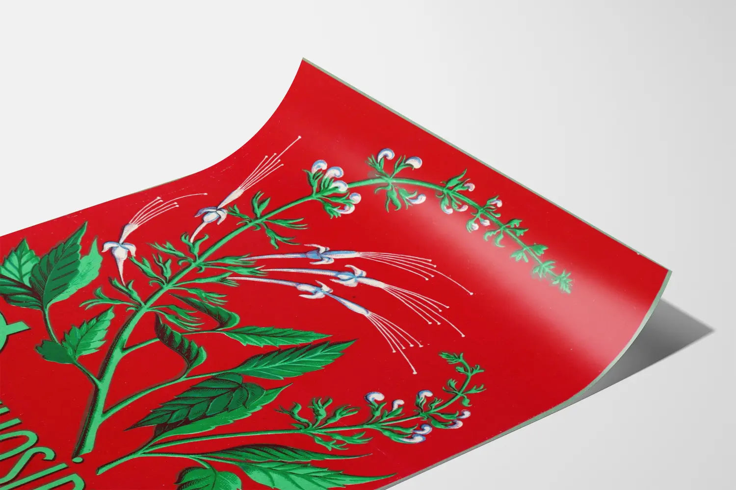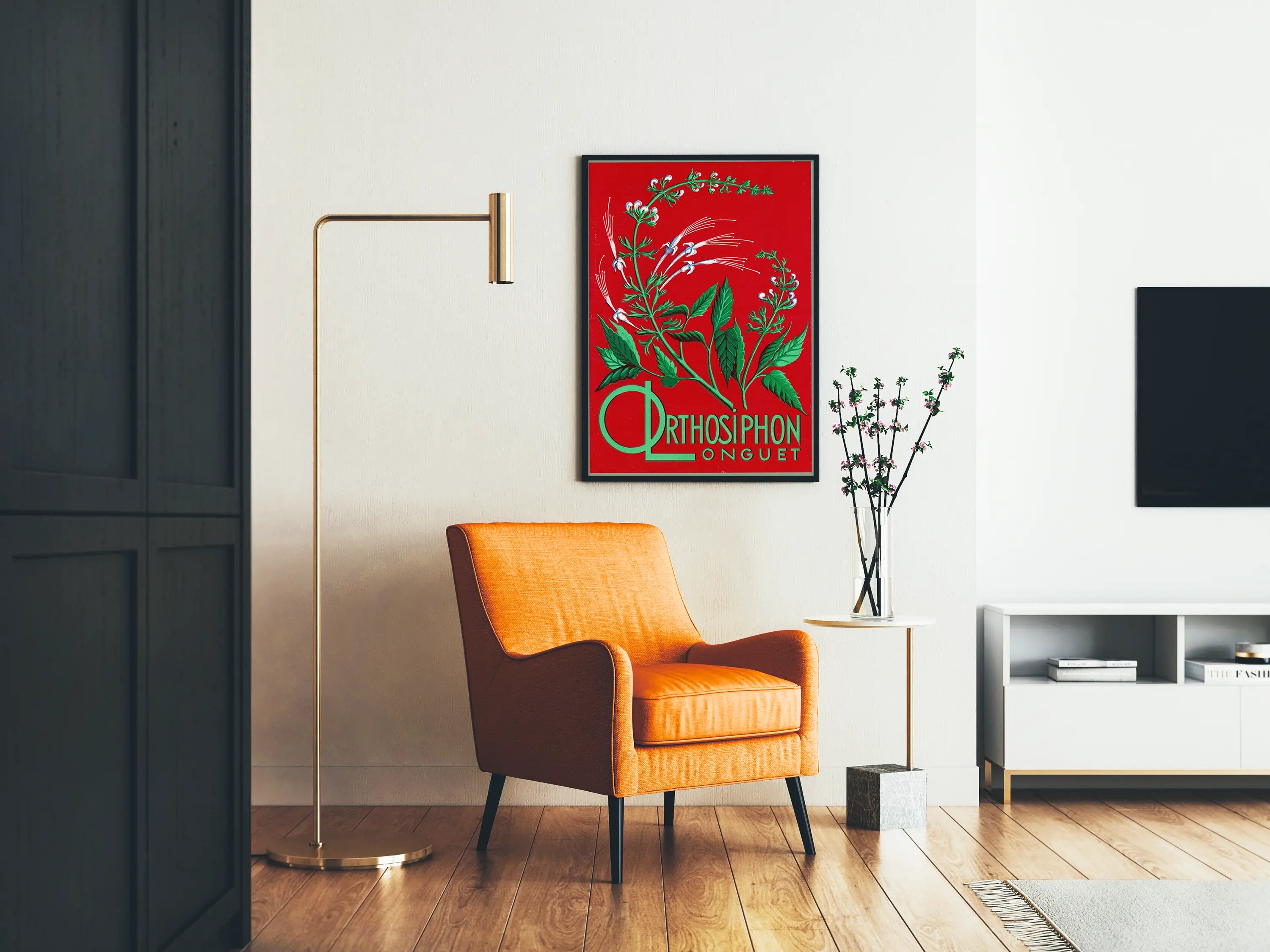 Poznaj tę plakat botaniczny Orthosiphon Longuet, unikalną dekorację ścienną, która wniesie do Twojego wnętrza naturalny i vintage charakter. Ten plakat przedstawia szczegółową i kolorową ilustrację rośliny o nazwie Orthosiphon Longuet, ukazując jej delikatne białe kwiaty i zielone liście na jaskrawoczerwonym tle. Silny efekt wizualny i kontrast kolorów nadają temu plakatowi retro urok, który przypadnie do gustu miłośnikom botaniki i entuzjastom oryginalnej dekoracji ściennej. Idealny do ożywienia ściany w salonie, sypialni lub biurze, ten plakat doskonale komponuje się z różnymi stylami wnętrz, zarówno nowoczesnymi, jak i klasycznymi. Starannie wykonany graficznie nawiązuje do dawnych plansz botanicznych, oferując równowagę między naturalną autentycznością a artystycznym designem. Ten botaniczny plakat zachęca do kontemplacji i poznawania świata roślin, jednocześnie podnosząc atmosferę pomieszczenia swoją żywą estetyką. Niezależnie od tego, czy chcesz wzbogacić kolekcję sztuki ściennej o motywy natury, czy ozdobić przestrzeń życiową kwiatowym akcentem, ten plakat Orthosiphon Longuet stanowi elegancki i ponadczasowy wybór dekoracyjny. Wprowadź odrobinę świeżości i koloru dzięki tej ściennej dekoracji inspirowanej florą, która łączy sztukę z naturą z wyczuciem.