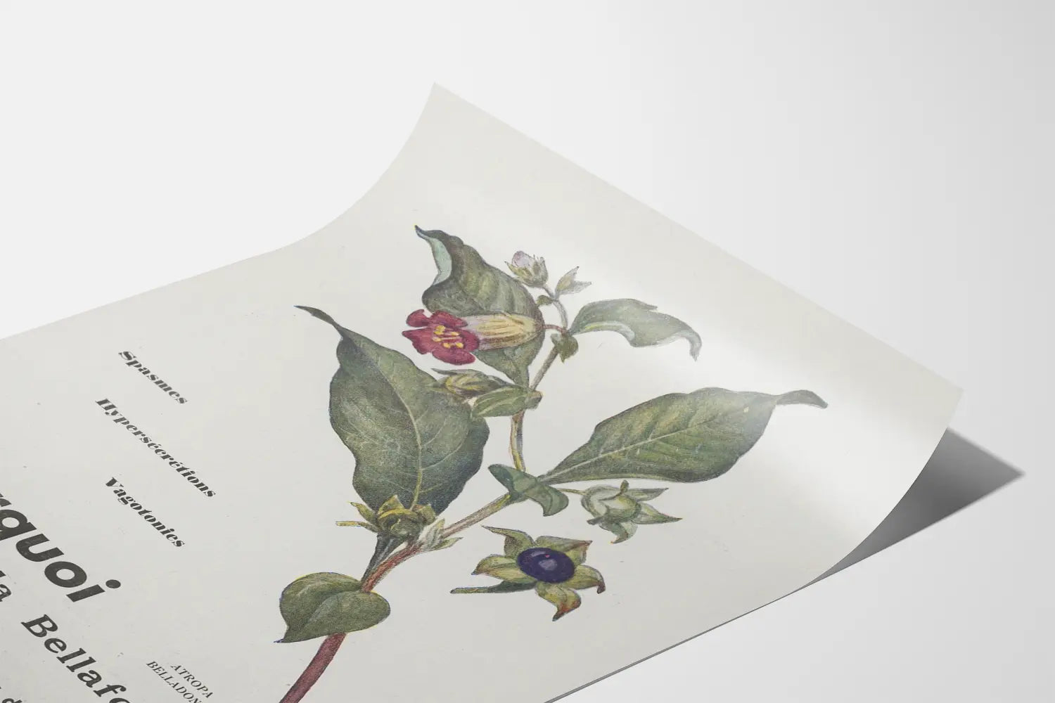 Odkryj ten wspaniały, vintage plakat botaniczny przedstawiający roślinę Atropa Belladonna, znaną również jako Bellafolina. Ten stylizowany plakat z dawnych czasów szczegółowo ilustruje gałąź z liśćmi, kwiatami i owocami charakterystycznymi dla tej rośliny. Urozmaicony jest tekstami wyjaśniającymi niektóre efekty, takie jak skurcze, nadmierne wydzielanie i wagalotonia, a także pytaniem: „Dlaczego Bellafolina jest preferowana nad atropinę i preparaty galenowe belladonki?”