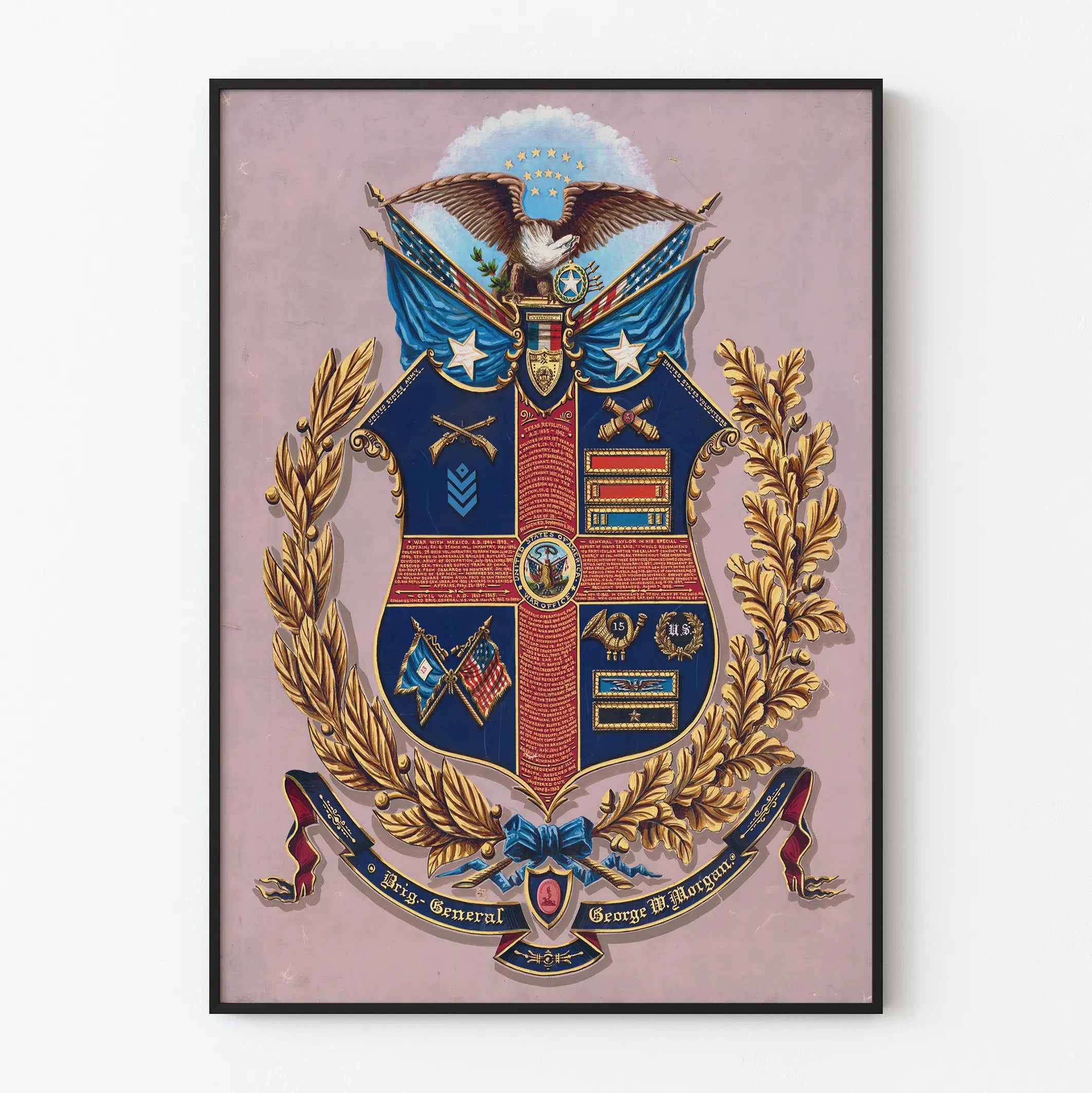 Środek herbu podzielony jest na kilka sekcji, w których widnieją symbole takie jak skrzyżowane karabiny, róg myśliwski, gwiazdy i flagi, reprezentujące różne aspekty kampanii i stopni wojskowych Morgana. U góry, majestatyczny orzeł z rozłożonymi skrzydłami dominuje nad całością, z okręgiem gwiazd przypominającym patriotyczny symbol Stanów Zjednoczonych. Ten obraz jest idealny jako element dekoracji ściennej, wnoszący odrobinę historycznej i wojskowej elegancji do biura, salonu lub biblioteki.
