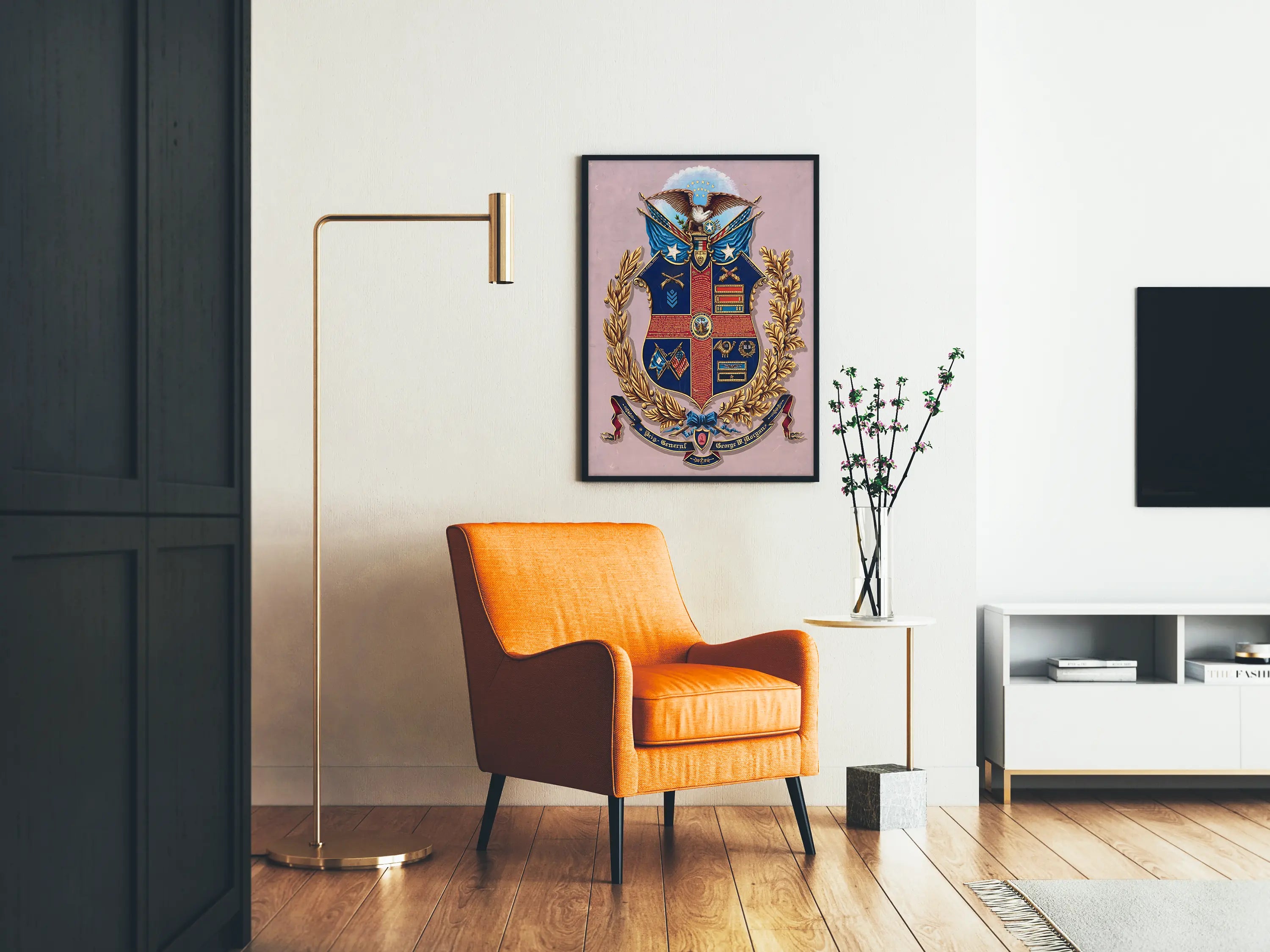 Odkryj tę unikalną reprodukcję przedstawiającą szczegółowy herb generała brygady George'a W. Morgana, element dekoracji ściennej, który przypadnie do gustu miłośnikom historii wojskowej i symboliki heraldycznej. Plakat ukazuje bogato zdobiony herb, ilustrujący istotne elementy kariery wojskowej George'a W. Morgana. Herb jest umieszczony w centrum, otoczony dwoma dużymi gałęziami złotego laurowego wieńca, symbolizującymi zwycięstwo i prestiż, na tle delikatnego pastelowego koloru, który podkreśla szczegółowe, kolorowe i precyzyjne elementy plakatu.