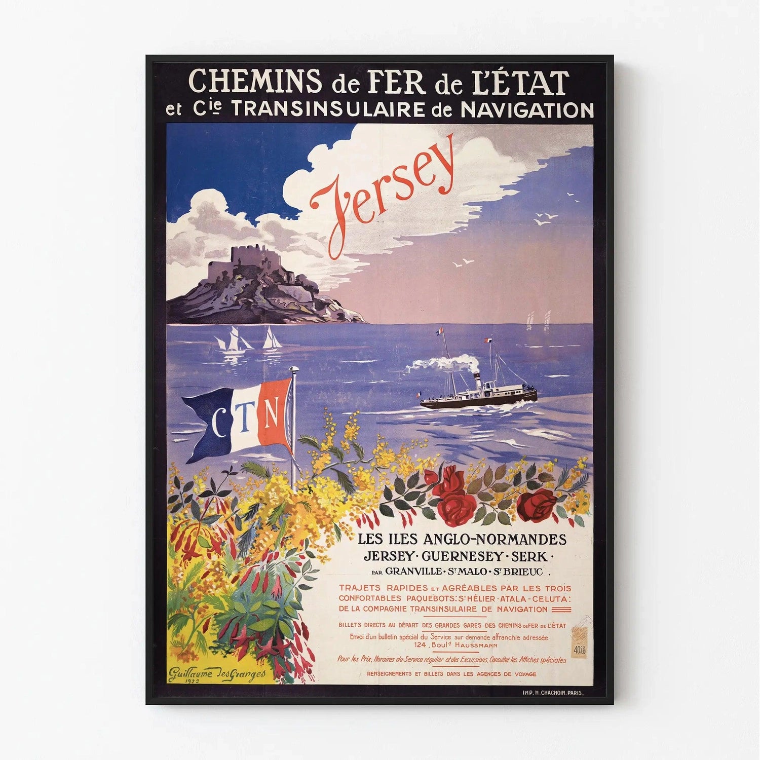 Podaruj sobie powiew ucieczki z tym plakatem Jersey vintage, kolorowym zaproszeniem do podróży między Granville, Saint-Malo a Wyspami Normandzkimi.