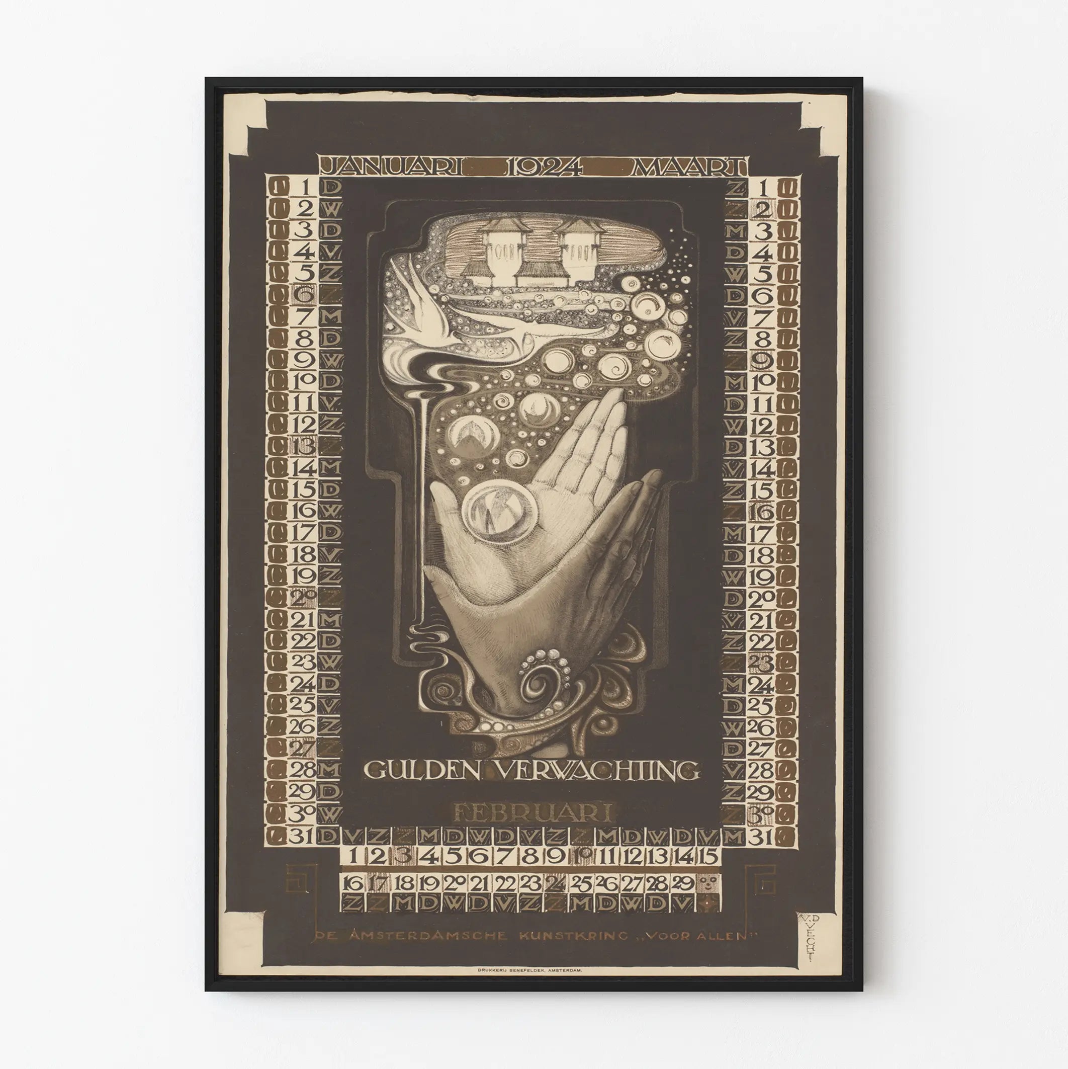 Odkryj tę oryginalną plakatową kalendarzową reprodukcję z 1924 roku, która obejmuje miesiące styczeń, luty i marzec. Ten plakat o stylu retro to doskonały wybór do autentycznej dekoracji ściennej z nutą historii. Kalendarz jest otoczony ozdobną ramką z zaznaczonymi dniami miesiąca, naprzemiennie jasne i ciemne pola, co tworzy elegancki kontrast, wydrukowany w czerni i tonach sepii. Centralne dzieło przedstawia dwie otwarte ręce, z których wydobywają się bańki i motywy niebiańskie, w tle widoczne są stare lampy i sylwetka lecącego ptaka, co tworzy poetycką i tajemniczą atmosferę, idealnie pasującą do każdego wnętrza. Ten obraz na ścianę łączy styl artystyczny vintage z funkcjonalnością dzięki kalendarzowi, co czyni go zarówno estetycznym, jak i praktycznym elementem dekoracyjnym. Paleta neutralnych kolorów z odcieniami beżu, brązu i czerni łatwo komponuje się z różnorodnymi wnętrzami, czy to w biurze, salonie czy pomieszczeniu przeznaczonym na kreatywność. Ta dekoracja ścienna jest atrakcyjna dla miłośników historycznej grafiki artystycznej oraz dla tych, którzy poszukują fascynującego plakatu z charakterystycznym stylem początku XX wieku. Kalendarz zawiera nazwy miesięcy w stylizowanych wielkimi literami, a dni tygodnia są ułożone pionowo po obu stronach. Z jego staroświeckim urokiem i artystycznym wyglądem, ten plakat wnosi elegancką i inspirującą atmosferę do Twojego miejsca zamieszkania lub pracy. Idealny dla pasjonatów vintage’owej dekoracji ściennej, ten plakat kalendarz z 1924 roku to rzadki egzemplarz, który przyciągnie uwagę i ozdobi Twoje ściany oryginalnym stylem.