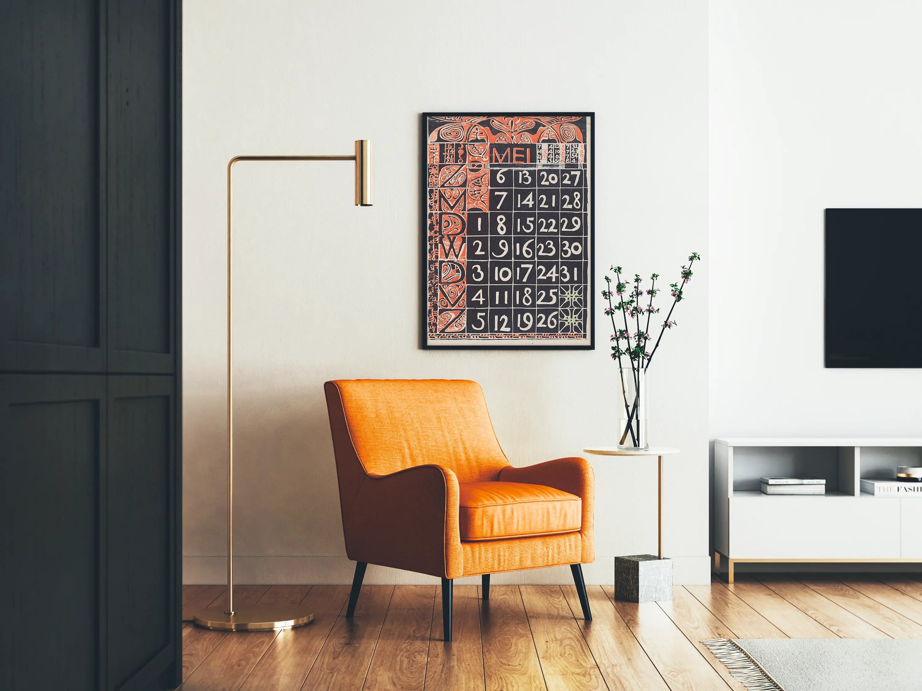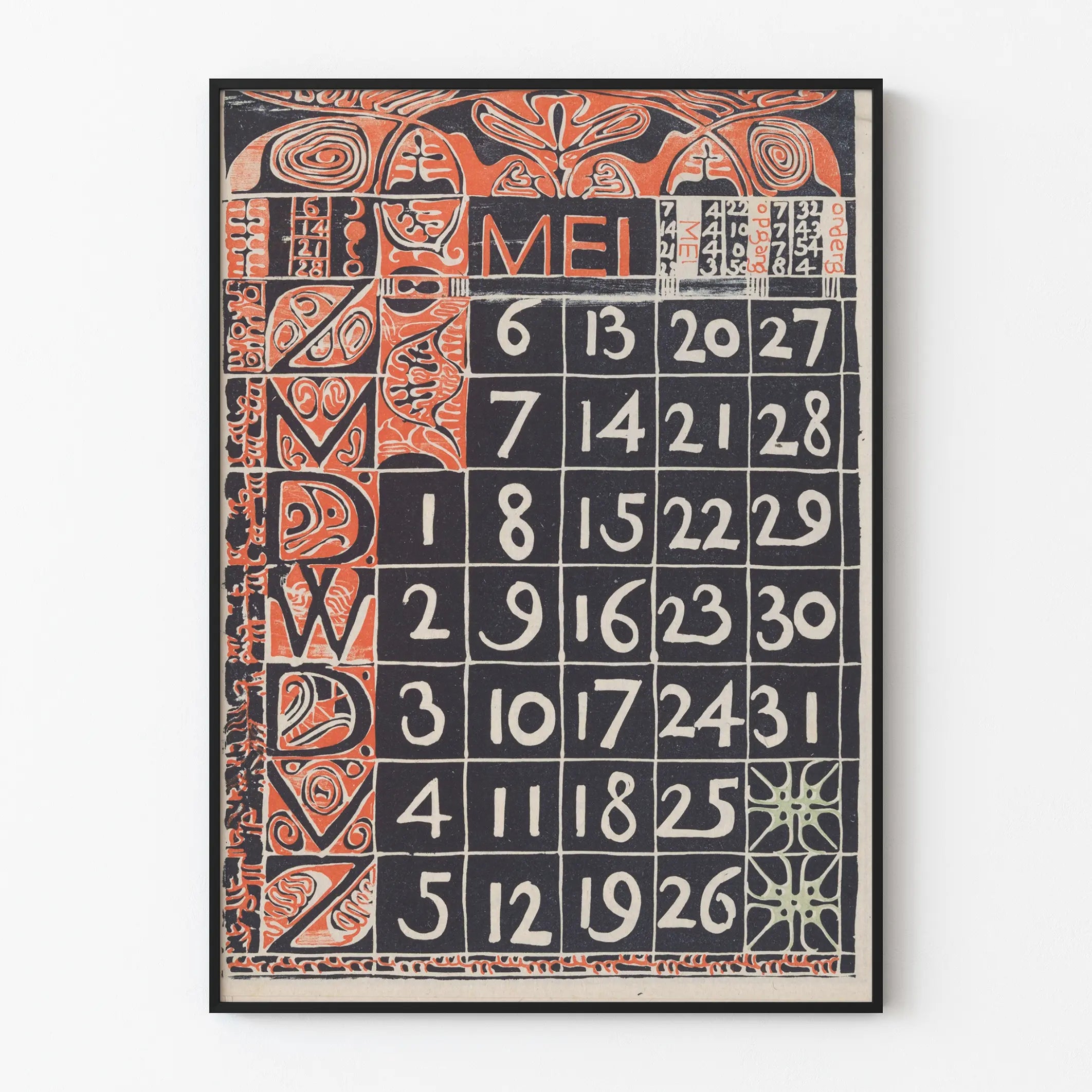 Ramę kompozycji zdobią liniowe i abstrakcyjne motywy, bardzo stylizowane, które otaczają całość i dodają temu kalendarzowi silny charakter artystyczny. Litery tworzące słowo „MEI” (maj po niderlandzku) odgrywają ważną rolę w górnej części, odzwierciedlając graficzny styl i typografię używaną na początku XX wieku. Ten plakat doskonale wpisuje się w klimat retro lub secesji, łącząc funkcjonalność z estetyką.