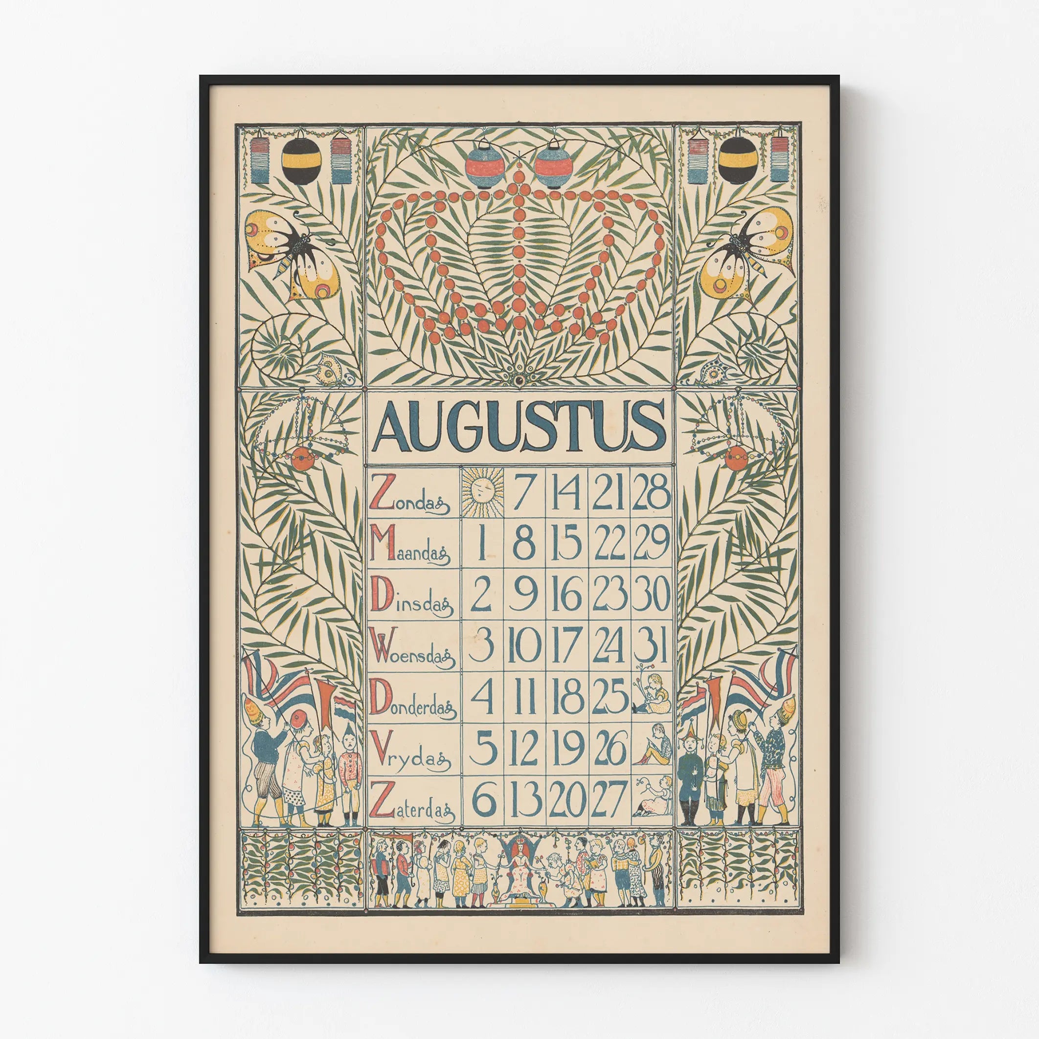 Plakat przedstawia miesiąc sierpień, zatytułowany „Augustus”, w uporządkowanym i artystycznym układzie. Każdy dzień miesiąca jest wyświetlony w przejrzystej siatce, z harmonijnym połączeniem delikatnych i pastelowych kolorów, takich jak błękit, czerwień, żółć i oliwkowa zieleń. Wokół kalendarza znajdują się motywy dekoracyjne inspirowane naturą — liście, jagody i motyle, które podkreślają subtelny i poetycki charakter tego elementu.