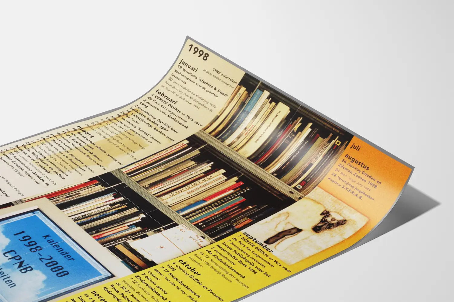 Ta dekoracyjna plakat ścienny przedstawia szczegółowy kalendarz działań CPNB (Collectieve Propaganda van het Nederlandse Boek) na lata 1998–2000. Jest idealny dla miłośników książek, literatury młodzieżowej oraz pasjonatów wydarzeń kulturalnych związanych z książką. Kompozycja wizualna łączy kolumny tekstu drukowanego na jednolitym tle po lewej i prawej stronie, nawiązując do bogatego i zorganizowanego programu działań. Środek plakatu zajmuje fotografia przedstawiająca bibliotekę z książkami poukładanymi na metalowych regałach, zdjęcie zwierzęcia, rysunek dziecka oraz ekran komputera wyświetlający tytuł kalendarza.