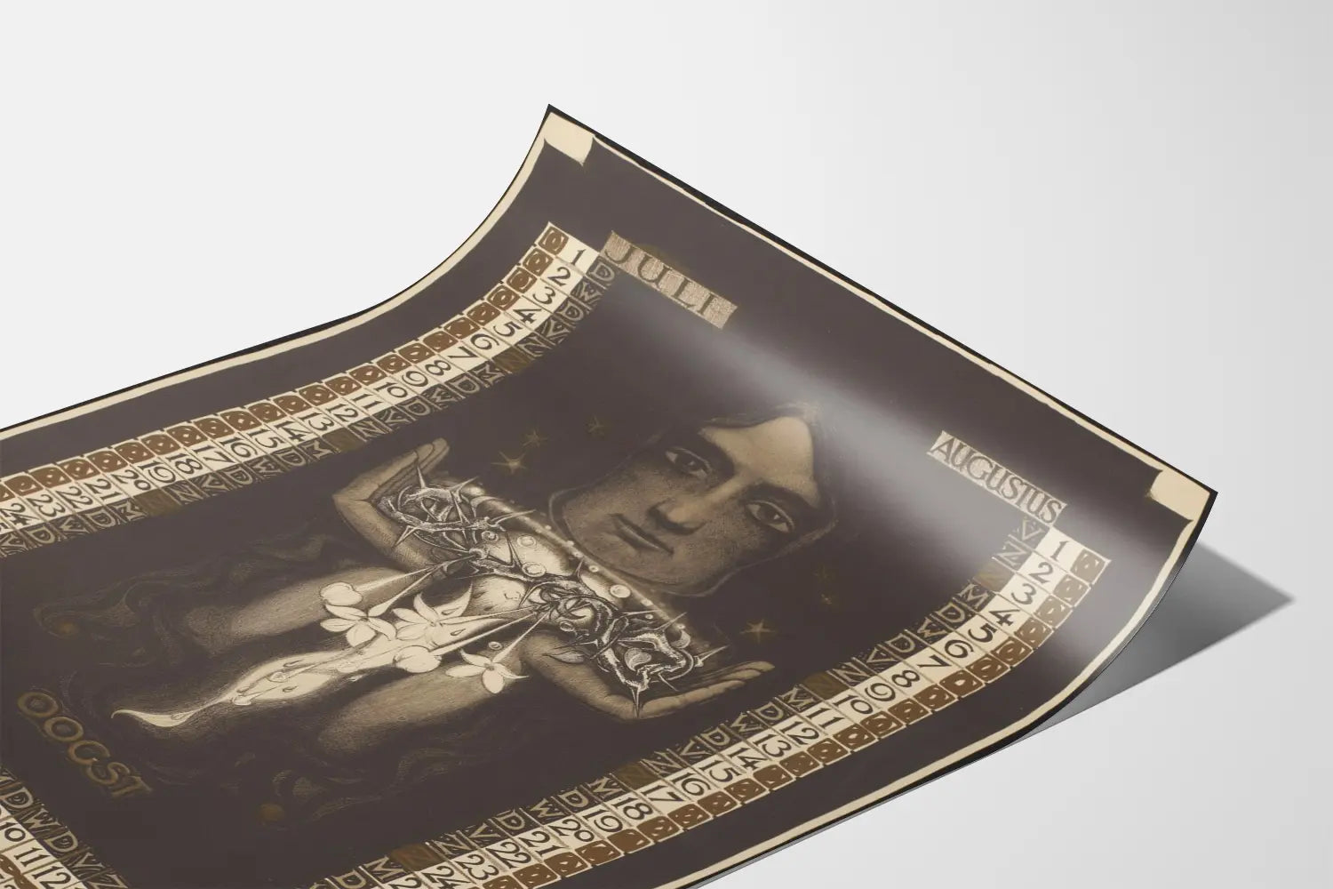 W centrum tej dekoracji ściennej znajduje się silna i symboliczna ilustracja: ludzka twarz o intensywnym spojrzeniu, trzymająca w rękach skomplikowany, mechaniczny wyglądający obiekt, ozdobiony opadającymi kwiatami i kroplami, co wywołuje tajemniczą i poetycką atmosferę. Kompozycja centralna przyciąga wzrok, podkreślając artystyczny i unikalny charakter tego obrazu-kalendarza.