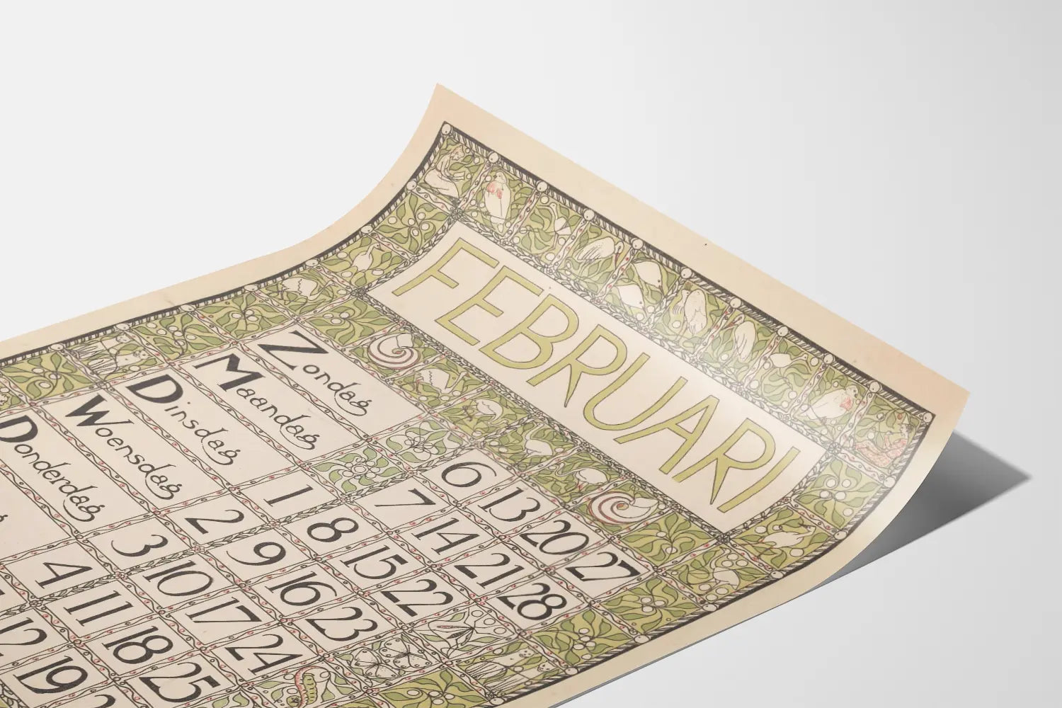 Odkryj ten kalendarz plakatowy na luty 1898 roku, wyjątkowy przykład vintage'owej dekoracji ściennej. Ten plakat wyróżnia się ozdobną ramą, bogatą w motywy kwiatowe i zwierzęce, typowe dla Secesji. Każdy dzień miesiąca jest zapisany w siatce o wyraźnych konturach, z nazwami dni w języku niderlandzkim, wymawianymi w ich tradycyjnej formie: Zondag, Maandag, Dinsdag, Woensdag, Donderdag, Vrydag, Zaterdag.