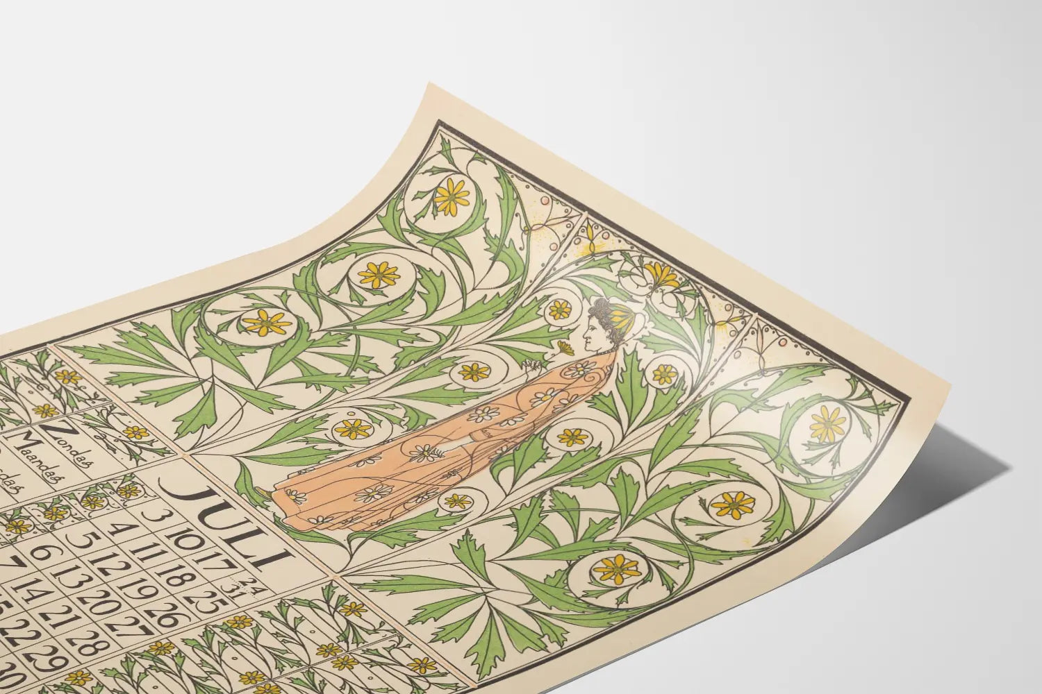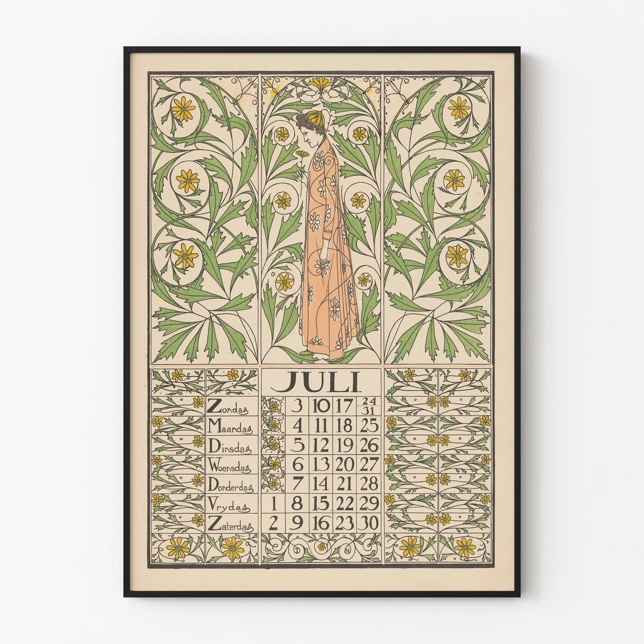Odcienie zieleni i żółci dominują na tym plakacie, wprowadzając świeżość i energię do kompozycji, podczas gdy falujące linie liści i kwiatów tworzą płynny rytm wokół sylwetki. Typografia, jednocześnie czytelna i elegancka, doskonale uzupełnia całość, wyraźnie ukazując dni tygodnia i daty miesiąca lipca. Tekst jest napisany w języku niderlandzkim, dodając tej dekoracji ściennej wymiar historyczny i kulturowy.