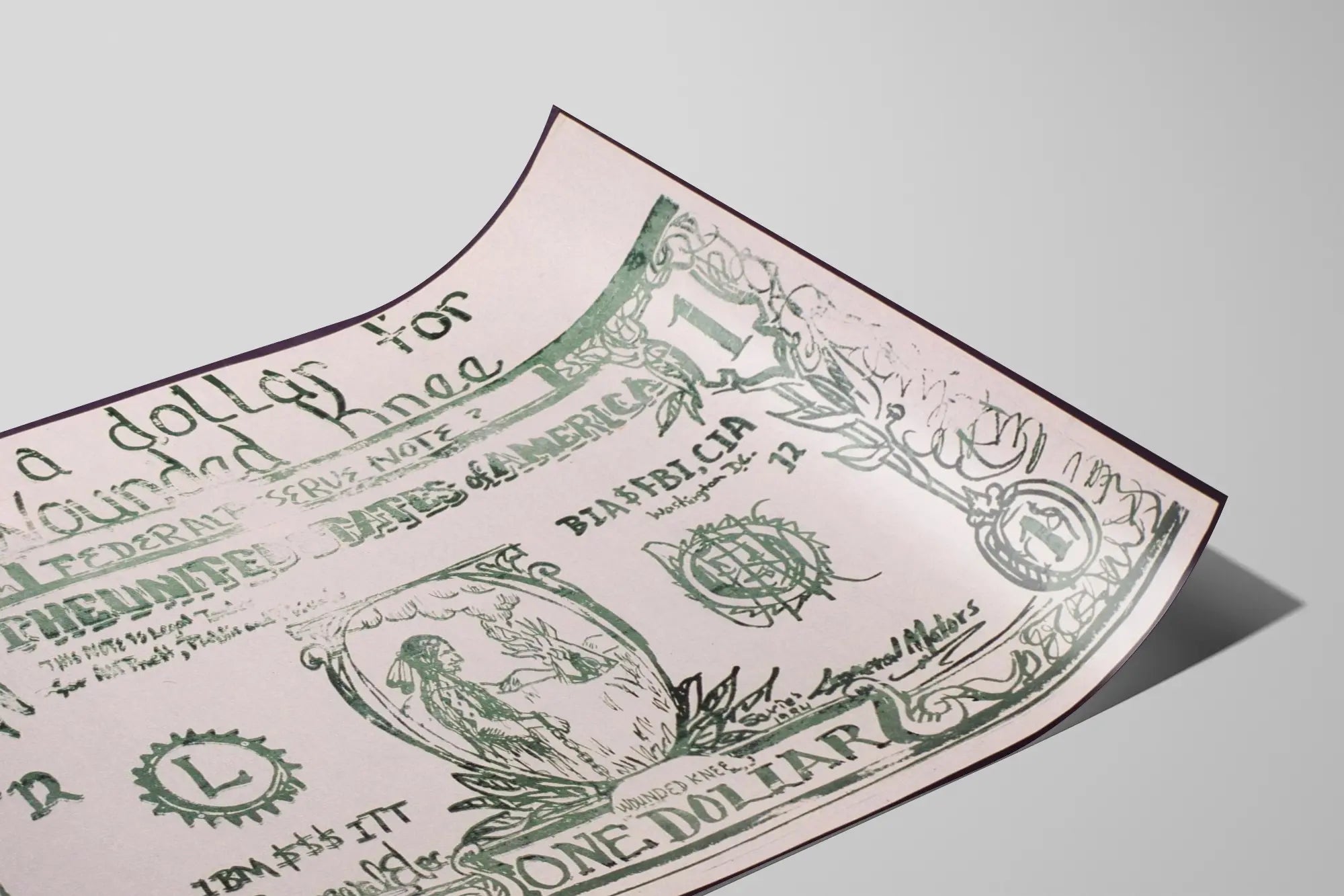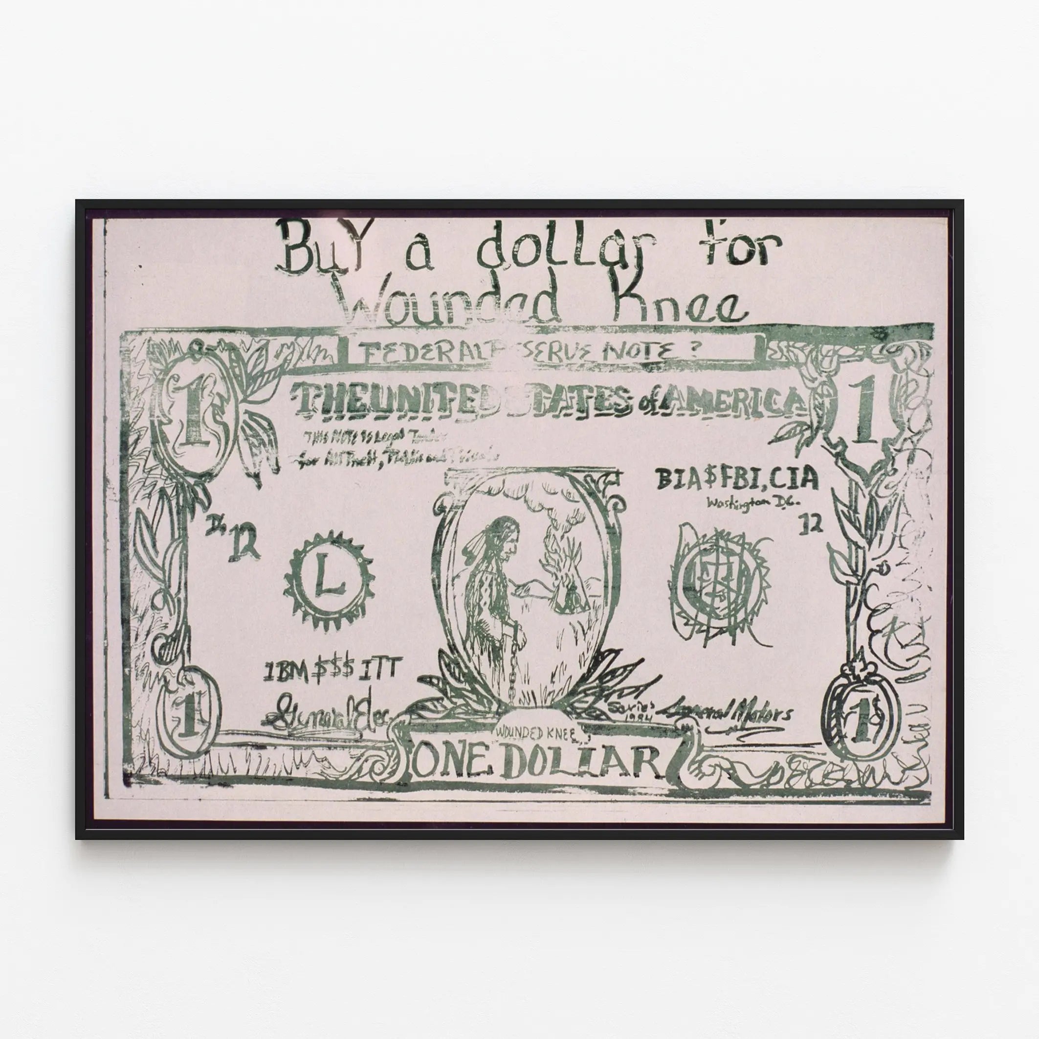 Plakat zatytułowany „Kup Dolara za Wounded Knee” to oryginalne i pełne znaczenia dzieło graficzne, idealne do dekoracji ściennej, która przyciąga uwagę i skłania do refleksji. Odzwierciedlając wygląd amerykańskiego banknotu dolara z notatkami i przekształcając go w symbol protestu, ten plakat podkreśla krytykę społeczną i polityczną. Centralny motyw przedstawia rdzenną postać w kajdankach, podkreślając przesłanie walki i pamięci o historii Wounded Knee, tragicznego wydarzenia związanego z rdzennymi mieszkańcami Ameryki.