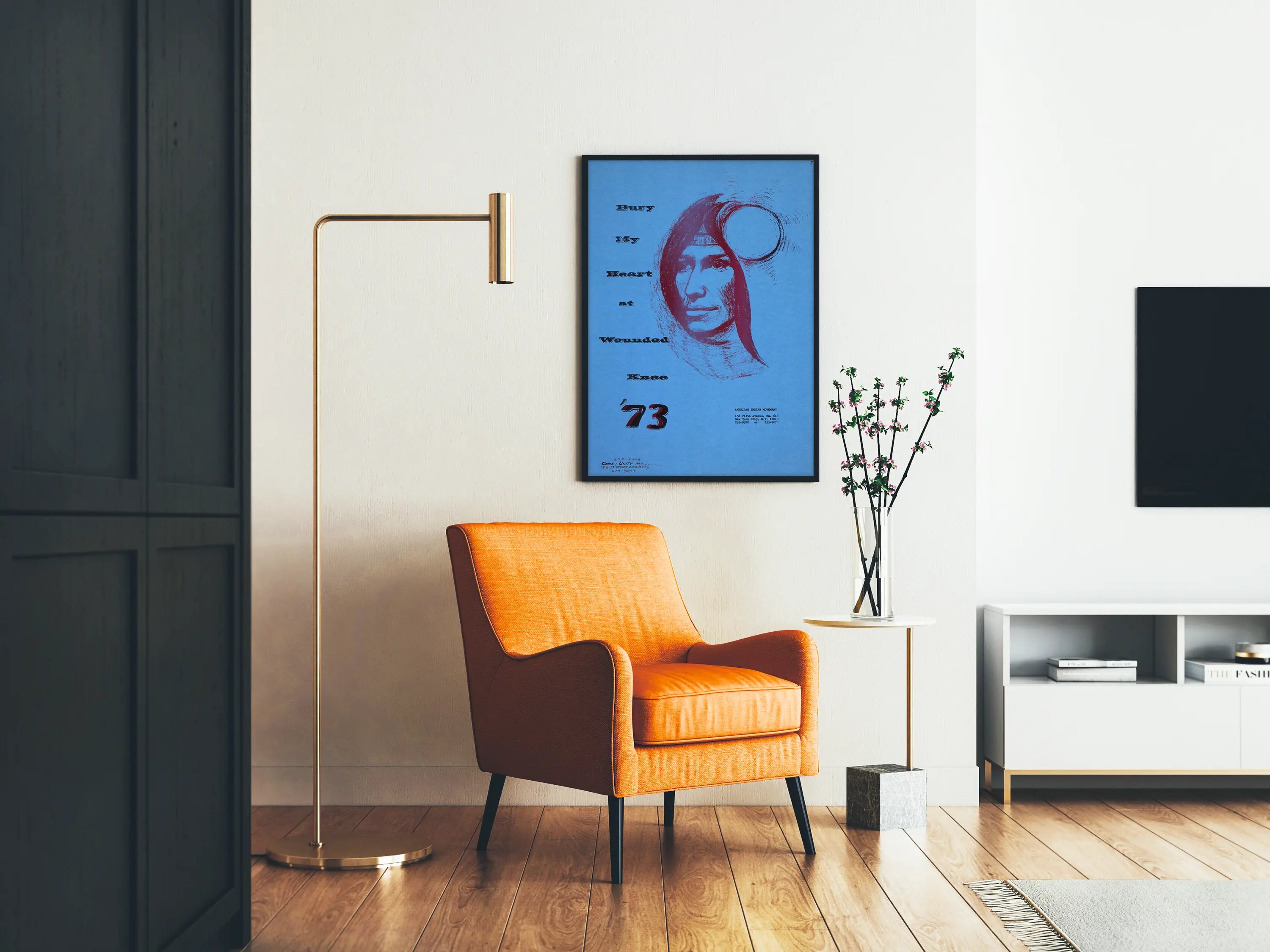 Ta stonowana i potężna plakat zatytułowany „Bury My Heart at Wounded Knee 73” przedstawia stylizowany portret amerykańskiego plemienia, narysowany w odcieniach czerwieni na jednolitym, niebieskim tle. Minimalistyczna kompozycja łączy wyrazisty rysunek mężczyzny z opaską na głowie i symbolicznym kołem po prawej stronie, wywołując atmosferę refleksji i pamięci. Tekst w czarnych literach, ułożony pionowo po lewej stronie, w typografii przypominającej maszynę do pisania, podkreśla historyczny i zaangażowany charakter, jednoznacznie odnosząc się do walki rdzennych mieszkańców Ameryki. Ten plakat jest idealną dekoracją ścienną, która wnosi do wnętrza element kulturowy i artystyczny, jednocześnie odwołując się do głębokiego i symbolicznego tematu. Tego typu plakat doskonale sprawdza się jako oprawiona ozdoba w salonie, biurze lub przestrzeni wystawowej, podkreślając znaczenie pamięci i sprawiedliwości społecznej poprzez grafikę artystyczną. Proste linie i ograniczona paleta barw umożliwiają łatwą integrację z różnymi stylami aranżacji, od minimalistycznego, przez etniczny, po vintage.