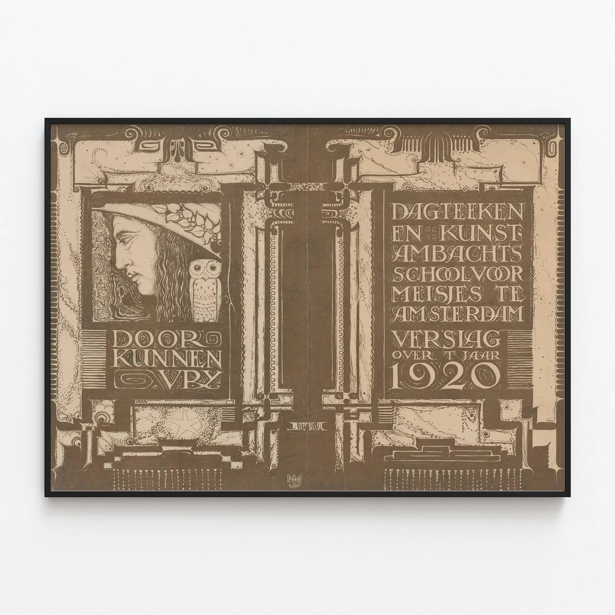 Plakat w stylu secesyjnym wyróżnia się szczegółowym i starannie wykonanym grafiką, typową dla początku XX wieku. Przedstawia profil twarzy ozdobionej kapeluszem, obok stylizowanej sowy, co wywołuje skojarzenia z mądrością i kreatywnością. Odwołuje się do Szkoły Sztuk i Rzemiosł dla Dziewcząt w Amsterdamie i zawiera wzmiankę o rocznym raporcie za rok 1920. Ten dekoracyjny plakat jest idealny dla miłośników sztuki vintage, historycznych szkół artystycznych oraz dekoracji ściennych w stylu retro. Dzięki organicznym liniom i geometrycznym motywom doskonale oddaje ducha ilustracji i projektowania z lat dwudziestych. Używany jako dekoracja ścienna, ten plakat doda elegancji i kultury do wnętrza, niezależnie czy jest ono nowoczesne, czy klasyczne. Doskonały do ekspozycji w salonie, biurze czy bibliotece, będzie unikalnym elementem, przyciągającym uwagę zarówno estetyką, jak i historią wizualną. Ten graficzny obraz zachęca do odkrywania sztuki użytkowej i projektowania z epoki, dodając autentyczności i głębi Twojej przestrzeni. Idealny dla wszystkich, którzy chcą włączyć stylowe dzieło do swojej kolekcji plakatów lub dekoracji ściennych inspirowanych ruchami artystycznymi początku XX wieku.