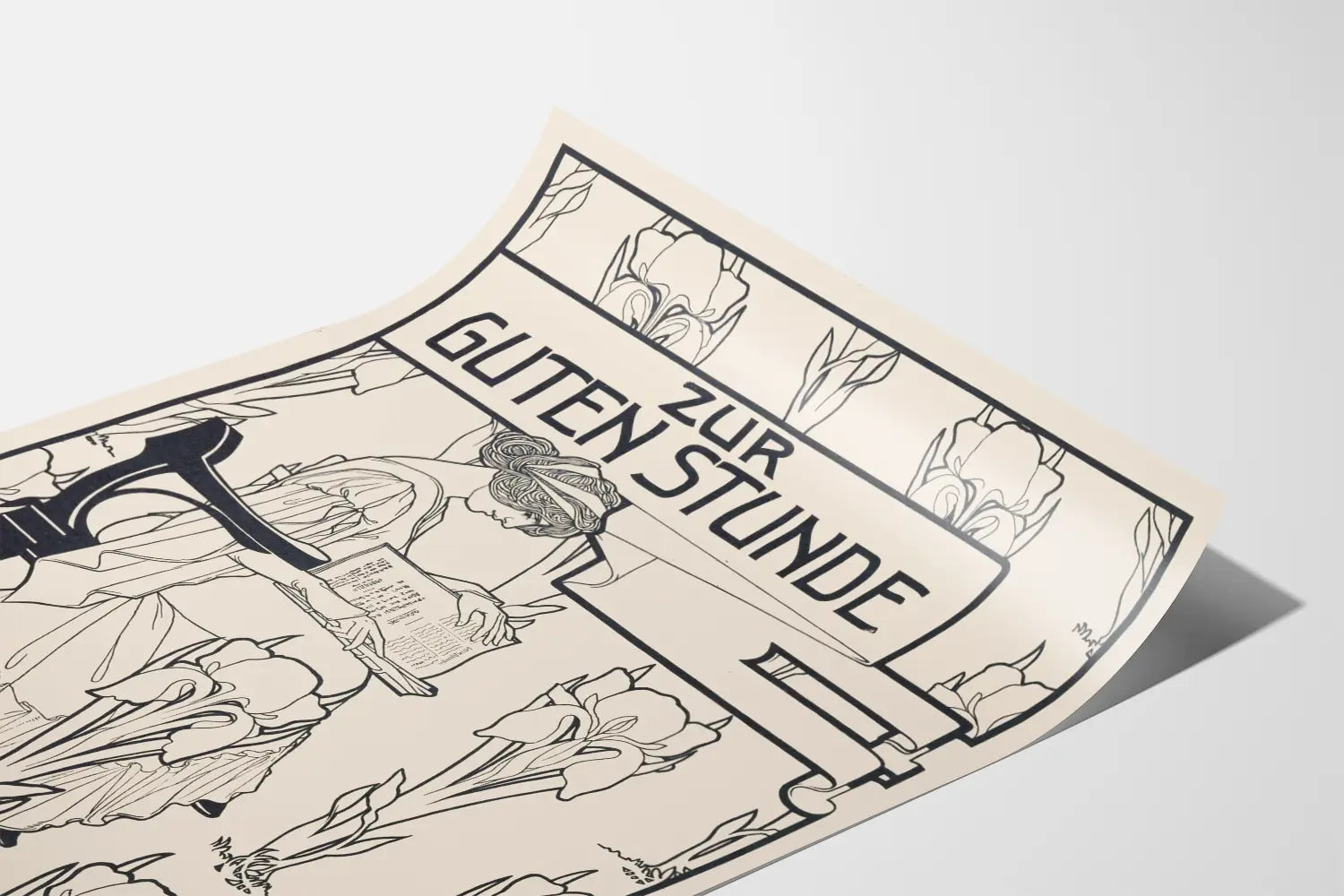 Ten plakat w stylu secesy przedstawia kobietę siedzącą na eleganckim czarnym krześle, zatopioną w czytaniu książki. Rysunek w czerni i bieli ukazuje delikatność w kreskach oraz wyważoną kompozycję, w której stylizowane kwiaty, przypominające irysy, otaczają centralną scenę. Tekst „ZUR GUTEN STUNDE” jest umieszczony u góry plakatu w wielkich literach, podkreślając znaczenie przekazu lub tytułu. Ten dekoracyjny plakat ścienny jest idealny dla miłośników sztuki vintage i estetyki secesyjnej, wnosząc subtelny i wyrafinowany akcent do każdego wnętrza. Niezależnie od tego, czy znajdzie się w salonie, biurze czy bibliotece, ten wydrukowany obraz pozwala stworzyć spokojną i inspirującą atmosferę, łącząc naturę z kulturą w elegancki sposób.