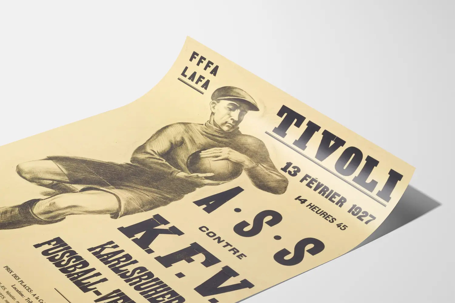 Ta plakat vintage to historyczny element dekoracji ściennej, zapowiadający mecz piłki nożnej, który odbył się 13 lutego 1927 roku na stadionie Tivoli w Strasburgu. Przedstawiający zawodnika w akcji, ten czarno-biały plakat jest doskonałym przykładem sportowej reklamy z tamtej epoki, łączącym dynamiczną ilustrację z wyraźną typografią. Zawodnik, ubrany w tradycyjny strój sportowy, z czapką na głowie i trzymający starą piłkę, doskonale oddaje estetykę lat dwudziestych, wprowadzając nostalgiczną atmosferę do każdego wnętrza. Tekst podkreśla spotkanie lokalnego zespołu A.S.S (Stowarzyszenie Sportowe w Strasburgu) z niemieckim zespołem K.F.V. (Karlsruher Fußball-Verein), co czyni ten obiekt interesującym dla miłośników historycznej piłki nożnej oraz pasjonatów vintage'owej dekoracji. Ten ścienny plakat, będący zarówno przedmiotem kolekcjonerskim, jak i elementem dekoracyjnym, dodaje retro i sportowego charakteru Twojej przestrzeni, niezależnie od tego, czy jest to salon, biuro czy sala gimnastyczna. Jego duży format i wyrazisty styl graficzny czynią z niego główny punkt przyciągający wzrok i pobudzający rozmowę. Idealny do tematycznej dekoracji ściennej związanej ze sportem lub historią, ten wydrukowany obraz będzie wyjątkowym dodatkiem dla tych, którzy cenią autentyczne przedmioty pełne historii. Plakat zawiera także informacje o miejscach sprzedaży biletów oraz warunkach cenowych, co dodaje autentyczności i uroku temu dokumentowi z epoki. Podsumowując, ten stary sportowy plakat to idealna dekoracja ścienna dla miłośników retro sztuki i piłki nożnej, łącząca nostalgię z pasją sportową w unikalnym stylu graficznym.