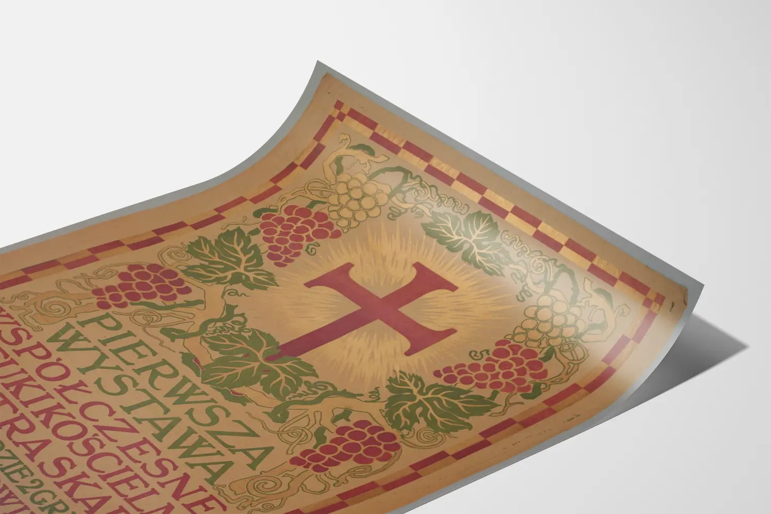Ta stara i dekoracyjna plakat upamiętnia pierwszą wystawę sztuki religijnej współczesnej poświęconą Piotrowi Skardze, która miała miejsce w Krakowie w 1911 roku. Stanowi unikalny element dekoracji ściennej, łączący motywy religijne z stylizowanymi elementami artystycznymi. Rysunek przedstawia centralny krzyż otoczony aureolą światła, symbolizującą boskie światło. Wokół krzyża znajdują się kiście winogron i liście winorośli, które nawiązują do tradycyjnych motywów eucharystii i chrześcijańskiego symbolu wina.