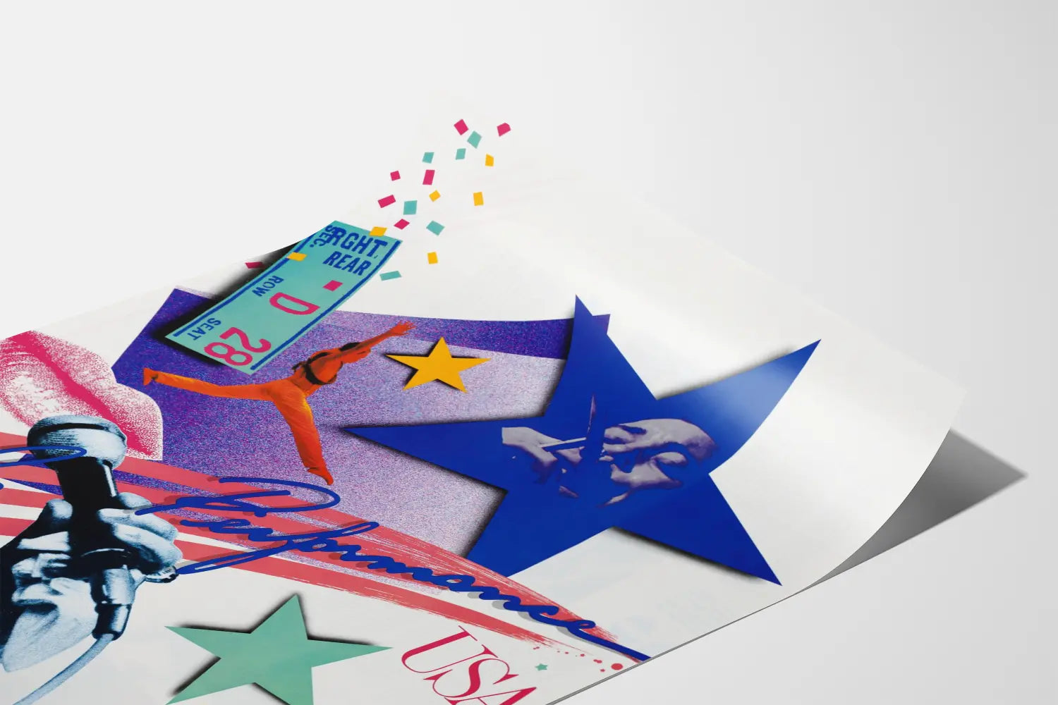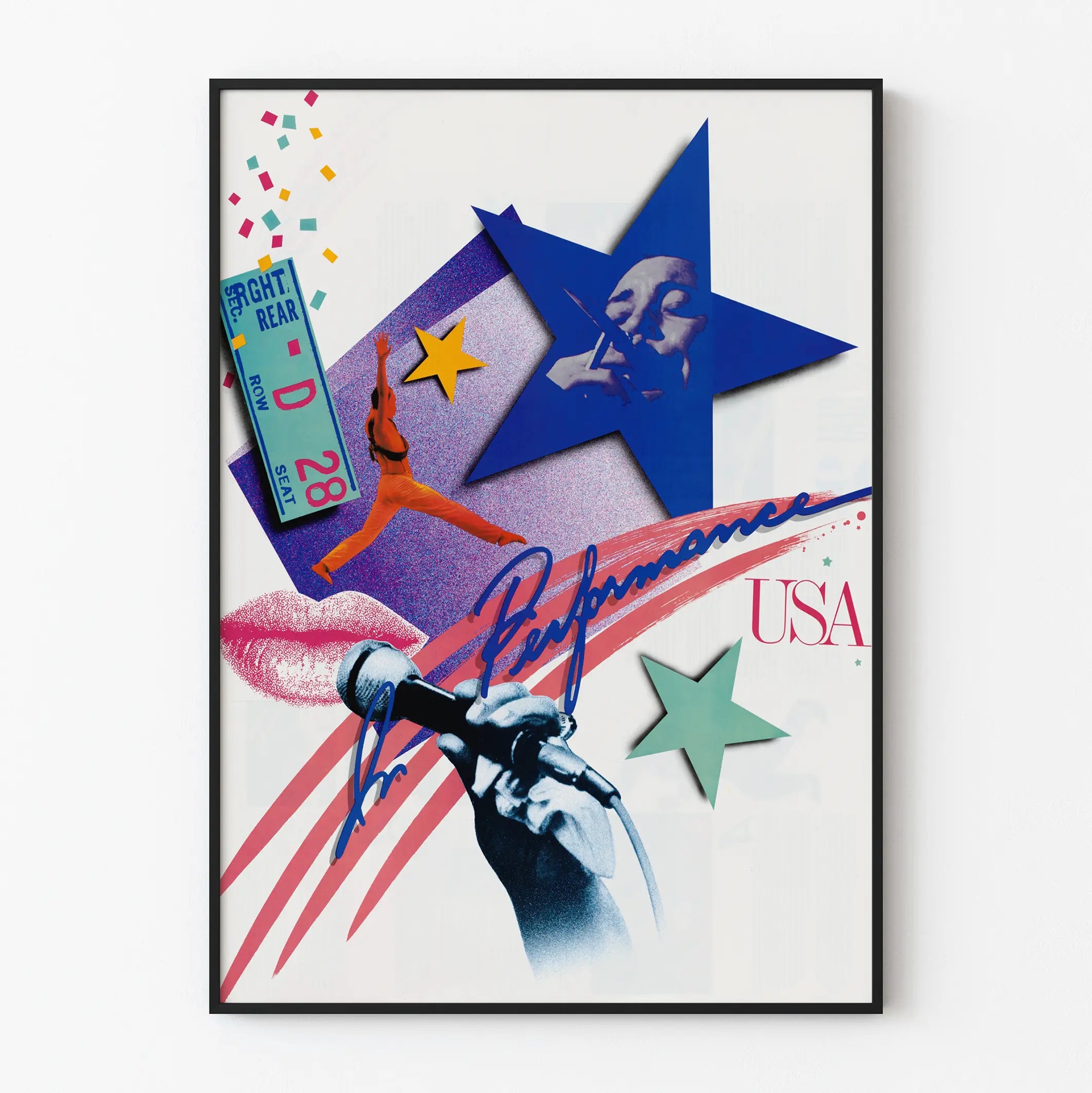 Odkryj ten plakat o nowoczesnym i dynamicznym designie, idealny do wprowadzenia artystycznego i energetycznego akcentu do Twojej dekoracji ściennej. Ten plakat przedstawia bogatą kompozycję wokół tematu występów artystycznych w Stanach Zjednoczonych. Widać na nim starannie skomponowany kolaż, obejmujący dłoń trzymającą mikrofon, będący silnym symbolem sceny muzycznej i widowisk na żywo. Wokół znajdują się kolorowe gwiazdy oraz kobieca postać w pełnym akcji ruchu, co sugeruje różnorodność i intensywność występów artystycznych.