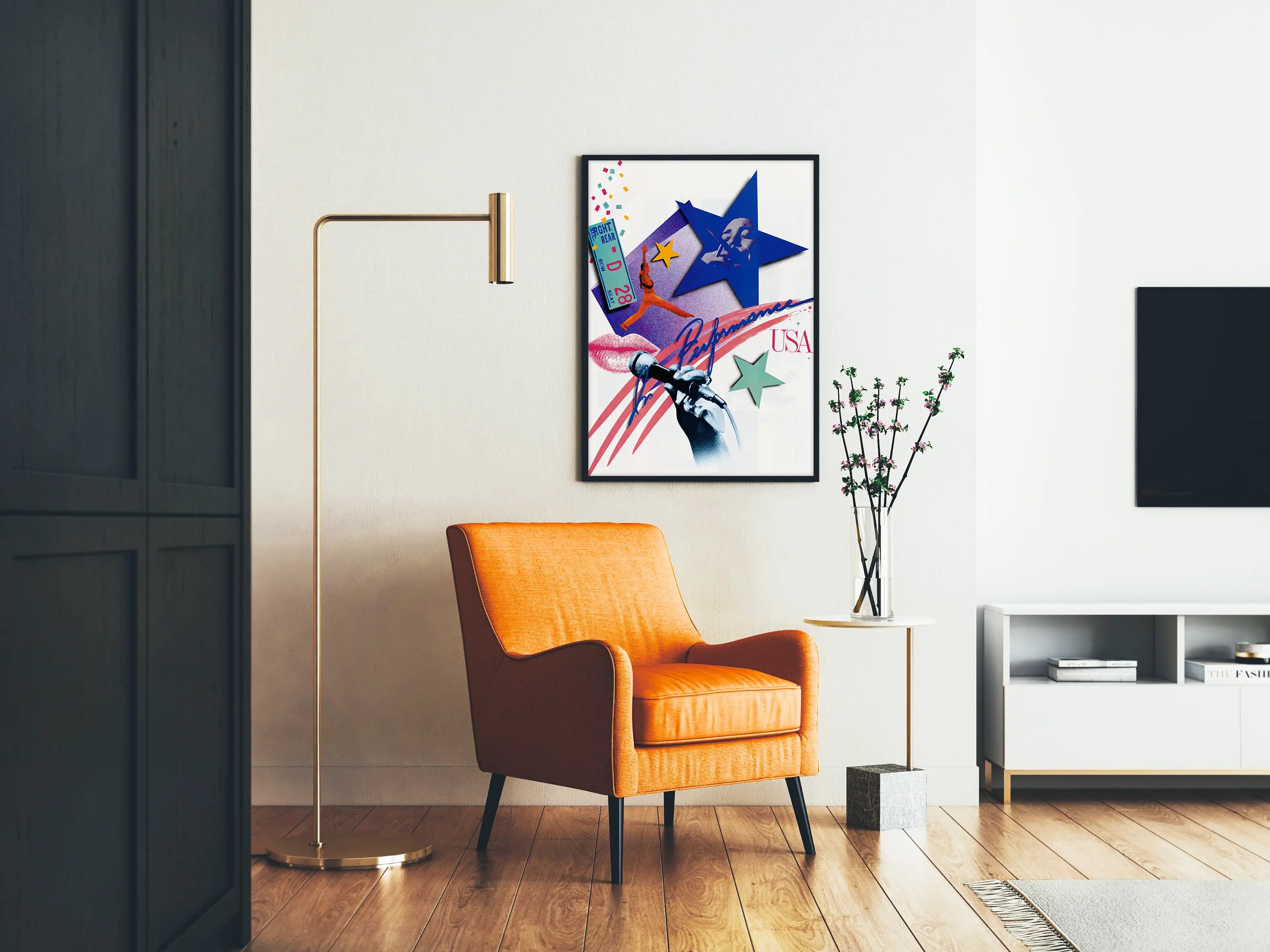 Jako element dekoracji ściennej, ten plakat świetnie komponuje się zarówno z nowoczesnymi wnętrzami, jak i z bardziej eklektycznymi przestrzeniami, gdzie elementy artystyczne są wyeksponowane. Jego grafika symbolizuje pasję do sceny i wyrazu artystycznego w Ameryce, co czyni go trafnym wyborem dla miłośników muzyki, tańca i występów scenicznych.