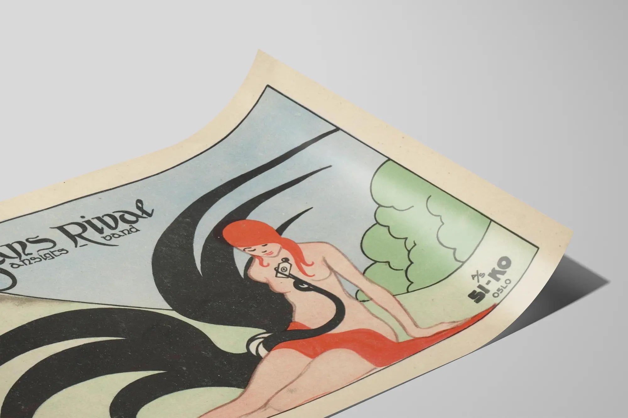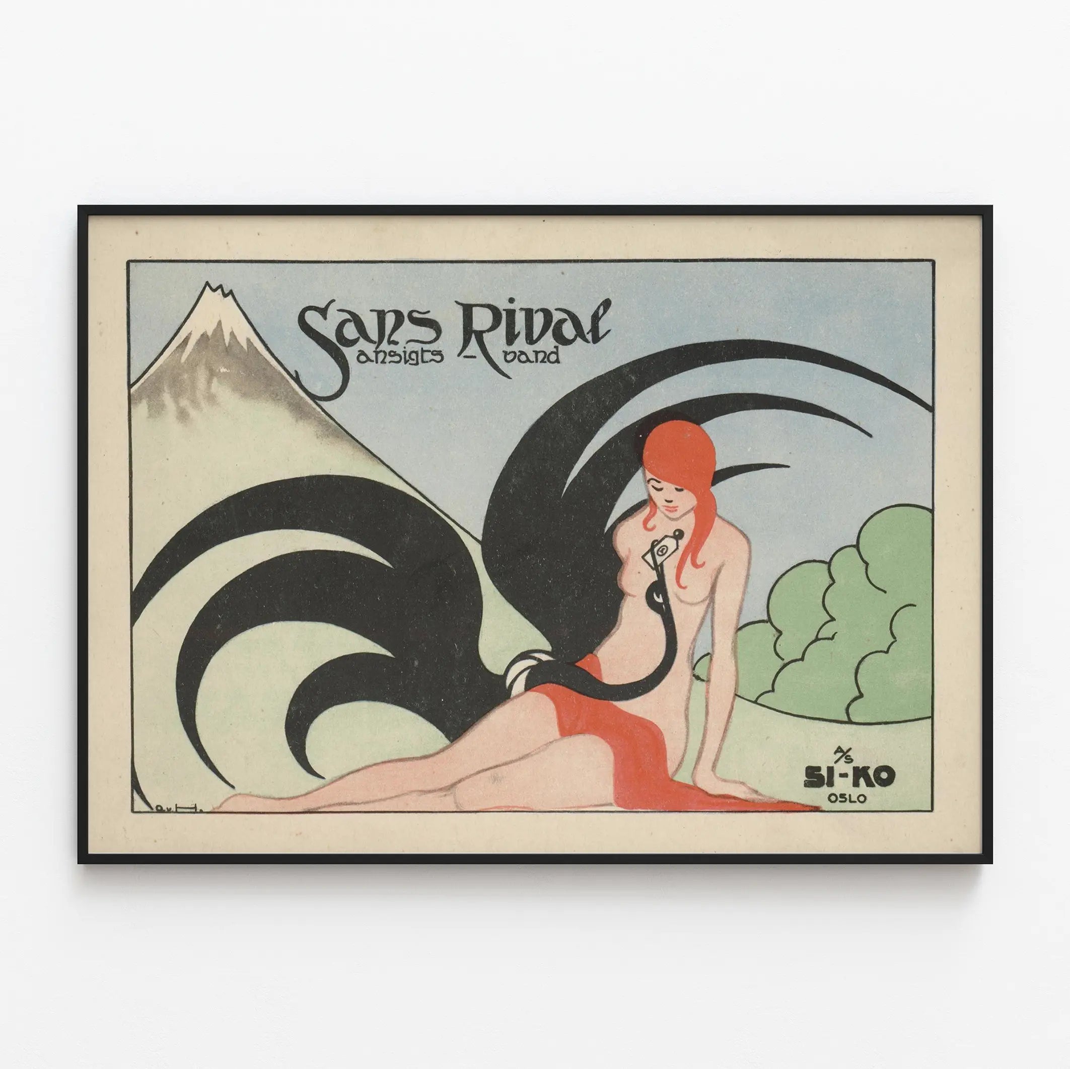 Ta vintage plakat Sans Rival jest ikonicznym elementem dekoracji ściennej inspirowanej stylem Art Déco. Ukazuje stylizowaną kobietę z jaskrawoczerwonymi włosami, siedzącą bokiem z gracją, częściowo okrytą czerwonym materiałem. Za nią rozpościera się duży czarny kogut o uproszczonych kształtach i dynamicznych łukach, które elegancko kontrastują z pastelowymi odcieniami tła. Tło obejmuje ośnieżony szczyt górski po lewej stronie oraz stylizowane zielone liście po prawej, wszystko na jasnoniebieskim niebie, które wprowadza lekką i uspokajającą atmosferę. Kompozycja jest podpisana „A/S SI-KO OSLO”, co wskazuje na norweskie pochodzenie. Ta dekoracja ścienna o minimalistycznej i geometrycznej grafice jest idealna, aby dodać artystyczny, vintage'owy akcent do wnętrza, niezależnie od tego, czy jest to salon, sypialnia czy biuro. Gra między łukami koguta a delikatnością kobiecych form tworzy harmonijną równowagę wizualną, charakterystyczną dla odnowionej estetyki art nouveau. Ten plakat łączy elegancję, prostotę i odrobinę tajemniczości dzięki introspekcyjnej postawie kobiecej postaci. Idealny dla miłośników starych plakatów i sztuki graficznej, ten obraz ścienny doskonale wpasuje się w klimat retro lub eklektyczny. Dodając ten graficzny i poetycki plakat do swojej dekoracji, zyskujesz oryginalny element wizualny, który przyciąga wzrok i wywołuje pewną nostalgię za dawnym designem. Zaprasza do kontemplacji i zanurzenia się w stylizowanym świecie łączącym naturę, kobiecość i dyskretny symbolizm.
