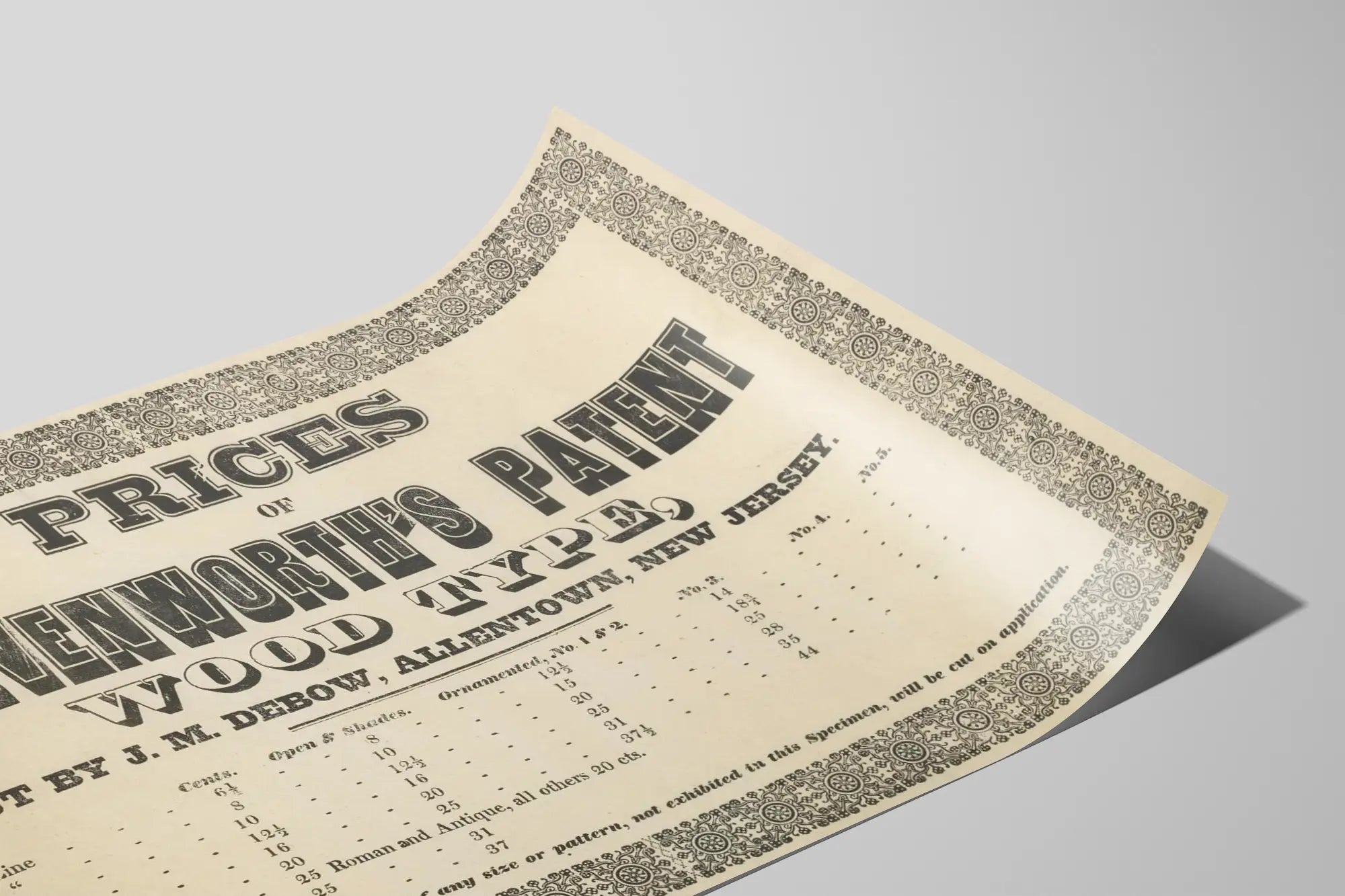 Odkryj tę oryginalną plakat vintage przedstawiający ceny słynnego typu drukarskiego Leavenworth’s Patent Wood Type, wyciętego przez J. M. Debow w Allentown, New Jersey. Ta starożytna forma typograficzna otoczona jest delikatnym ramowaniem z motywami kwiatowymi, typowymi dla wzorów z epoki, co czyni ją estetycznym i pełnym historii elementem dekoracji ściennej. Ten rzadki plakat ukazuje różnorodność stylów i rozmiarów drewnianych liter używanych do druku, z precyzyjnymi wskazaniami cen w zależności od szerokości i zdobień, od prostego, gładkiego drewna po wersje dekoracyjne. Ilustruje zarówno specyfikę narzędzi drukarskich, jak i graficzny aspekt epoki, co czyni go idealnym do wnętrz poświęconych typografii, historii druku lub vintage'owemu designowi. Ten obraz na ścianę doskonale wpasuje się w biuro, bibliotekę lub przestrzeń twórczą, dodając charakteru i inspiracji. Jeśli chodzi o dekorację, plakat nawiązuje do stylu retro, z tłem w kolorze kremowym, lekko postarzałym, oraz czarnymi literami w różnych typografiach, które przyciągają wzrok. Starożytna typografia i ozdobna ramka podkreślają jego autentyczność i klasyczny urok. Ten typograficzny plakat to unikalny element dla miłośników historii druku i grafiki, oferujący oryginalny i edukacyjny akcent dekoracyjny. Niezależnie od tego, czy oprawiony, czy po prostu wywieszony, ten vintage'owy dekoracyjny element ścienny wyróżnia się jako wyjątkowy przedmiot designu, który warto z dumą eksponować.