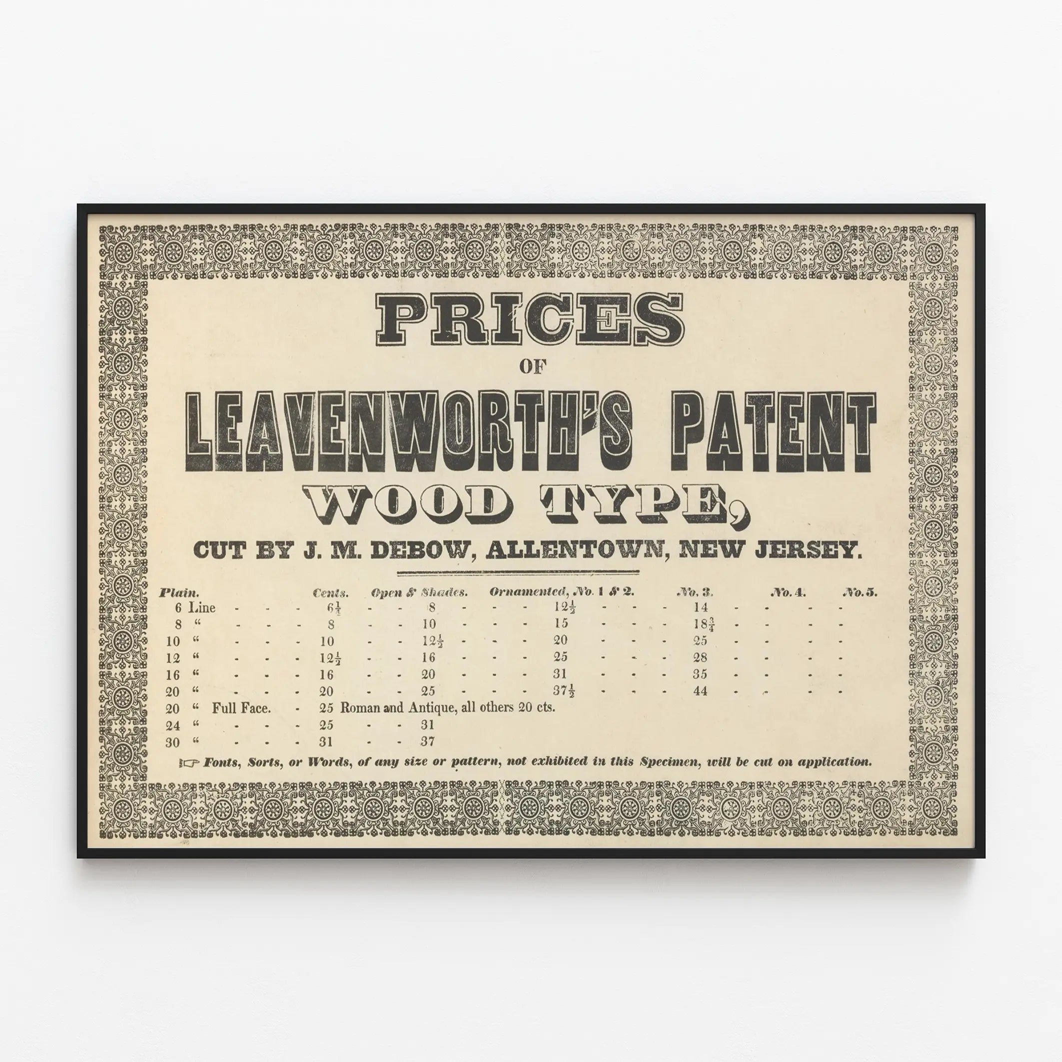 Plakat vintage cena drewno do druku Patent Wood Type Leavenworth