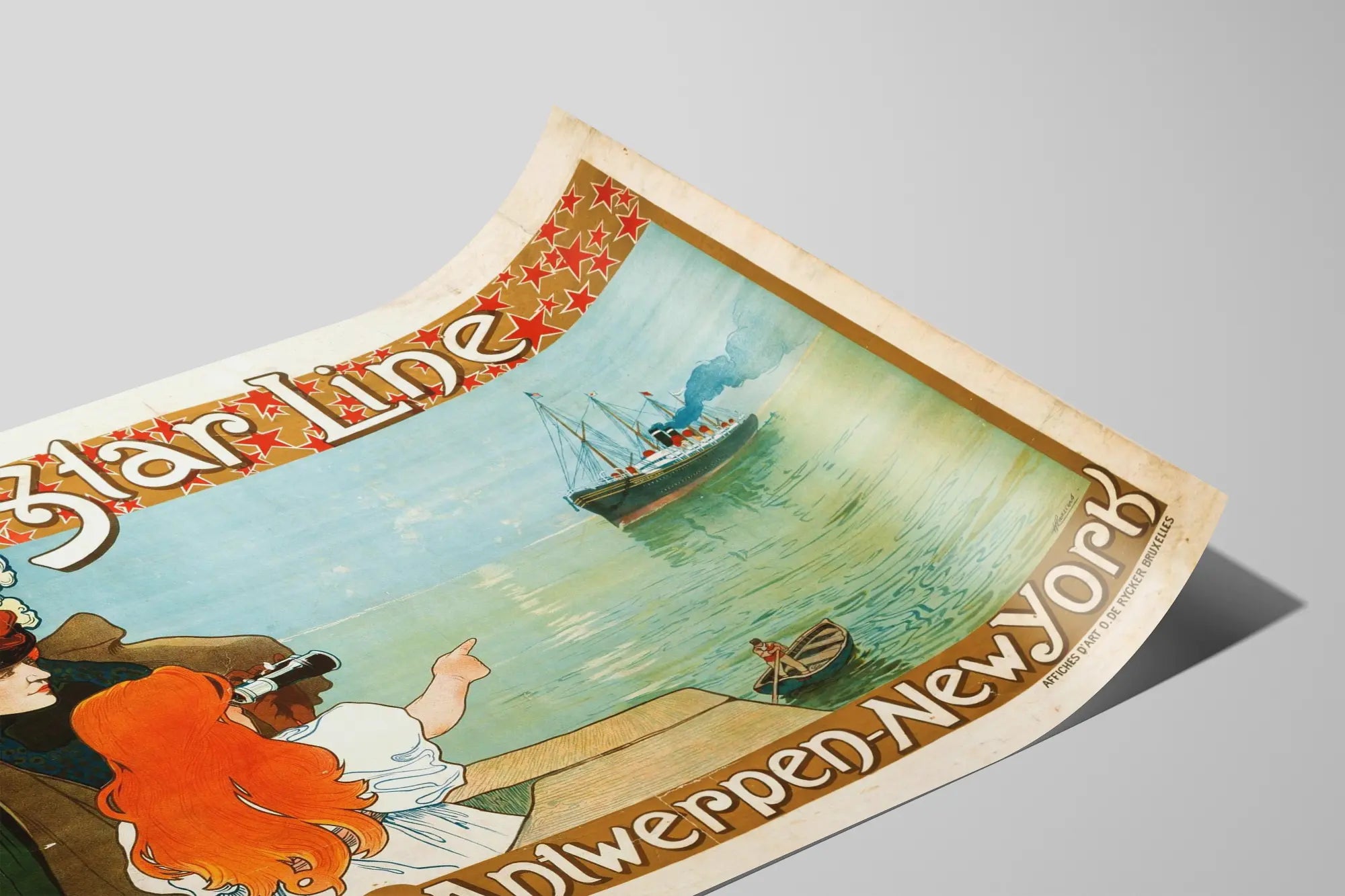 Ta plakat vintage Red Star Line Antwerpen-New York to wyjątkowy element, który wzbogaci Twoją dekorację ścienną o nutę historii i maritimej nostalgii. Przedstawia scenę, na której elegancka kobieta, u której głowę zdobi kapelusz ozdobiony piórami, oraz młoda dziewczyna z rudymi włosami, patrzą w dal na statek pasażerski opuszczający port, symbolizując transatlantycką podróż między Antwerpią a Nowym Jorkiem. Dziewczyna używa lornetki i wskazuje palcem na statek, podkreślając wrażenie odjazdu i przygody. Statek, szczegółowo odwzorowany z dymiącymi kominami i masztami, delikatnie odbija się na spokojnym morzu pod łagodnym, niebieskim niebem. Czerwone gwiazdy u góry plakatu oraz vintage’owa typografia z napisem „Red Star Line” oraz nazwami miejsc docelowych „Antwerpen-New York” podkreślają retro estetykę i styl secesyjny początku XX wieku. Ta plakat jest zarówno świadectwem historycznym, jak i wyjątkowym przedmiotem dekoracyjnym, idealnym do ozdoby ścian w salonie, biurze lub przestrzeni tematycznej poświęconej podróżom lub dziedzictwu morskiemu. Kompozycja łączy finezję w detalach postaci i statku z harmonijną paletą ciepłych i morskich barw, zapewniając przyjemną równowagę wizualną. Niezależnie od tego, czy jesteś miłośnikiem starych plakatów, podróżniczych afiszy, czy po prostu chcesz dodać wnętrzu vintage’owego i eleganckiego charakteru, ta plakat Red Star Line jest idealna do stworzenia unikalnej, pełnej uroku atmosfery. Łatwo wkomponuje się w każdy styl dekoracji, czy to klasyczny, retro, czy nawet nowoczesny, dzięki minimalistycznej grafice i naturalnym odcieniom. Uczyń ten plakat centralnym punktem swojej dekoracji ściennej, aby stworzyć atmosferę sprzyjającą podróżom, marzeniom i odkrywaniu.