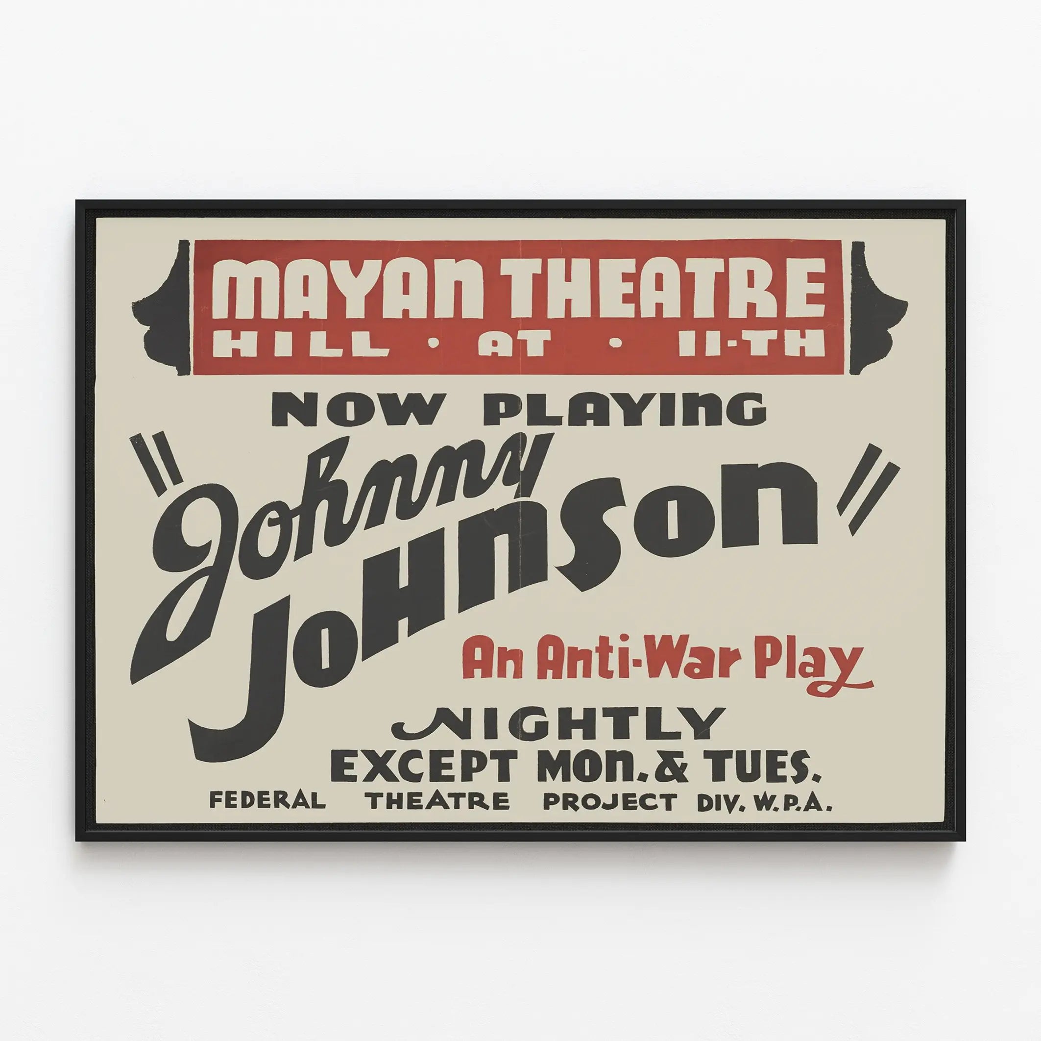 Ta vintage plakat teatralny promuje sztukę "Johnny Johnson", dzieło antywojenne wystawione w Teatrze Mayan. Jego minimalistyczny design opiera się na silnych kontrastach między jasnym tłem a czarnym i czerwonym tekstem, tworząc mocny efekt wizualny. Główny napis "Johnny Johnson" jest ułożony na ukos, podkreślając dynamikę i natychmiast przyciągając uwagę. Plakat charakteryzuje się typografią typową dla teatru, z pogrubionymi i stylizowanymi literami, które nawiązują do estetyki starych plakatów, co czyni go idealnym elementem dekoracji ściennej w stylu retro.
