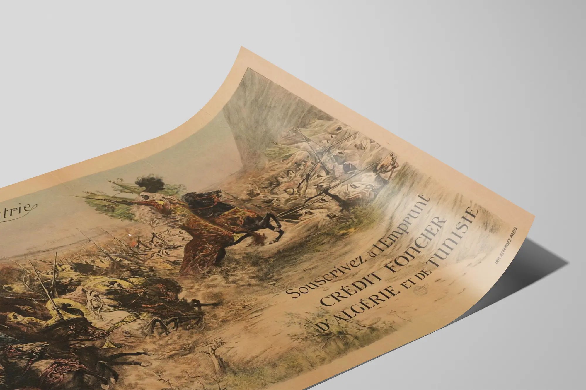 Ta plakat vintage zatytułowany „Na rzecz Ojczyzny” jest ikonicznym elementem dekoracji ściennej inspirowanej historią. Promuje subskrypcję pożyczki Kredytu Hipotecznego Algierii i Tunezji, ukazując scenę rycerskiej bitwy pełnej ruchu i napięcia. Ten plakat odzwierciedla zaangażowanie i patriotyzm związany z obroną francuskich terytoriów kolonialnych w Algierii i Tunezji. Na tej dekoracji ściennej wiele konnych jeźdźców w tradycyjnych strojach rusza do ataku, z wyróżniającym się mężczyzną na koniu trzymającym karabin, symbolem odwagi i determinacji. Widoczne flagi dodają dziełu patriotycznego i historycznego wymiaru. Wykonany techniką litografii, wyróżnia się odcieniami sepii i ochry, które nadają mu staroświecki i autentyczny urok, idealny do retro atmosfery w Twoim wnętrzu. Ten plakat doskonale wpisuje się w wystrój miłośników historycznych plakatów, pasjonatów historii wojskowej lub kolekcjonerów pamiątek kolonialnych. Wiszący w salonie, biurze czy bibliotece, ten obraz wnosi odrobinę historii i autentyczności, będąc jednocześnie dekoracją ścienną przyciągającą wzrok. Jego panoramiczny format podkreśla każdy szczegół walki i zachęca do kontemplacji broni, tłumów w ruchu oraz otaczającego krajobrazu. Taki plakat to zaproszenie do refleksji nad przeszłością, jednocześnie podkreślając styl klasyczny i dokumentalny. Niezależnie od tego, czy jest to element tematycznego wystroju ścian, czy sposób na wzbogacenie kolekcji starych plakatów, ten obraz mocno ukazuje moment patriotycznej propagandy, ożywiany przez dynamiczne postacie i jasny przekaz. To wybór plakatu, który dobrze komponuje się z drewnianymi meblami i ciepłymi klimatami, wnosząc historyczny akcent do starannie udekorowanego wnętrza.
