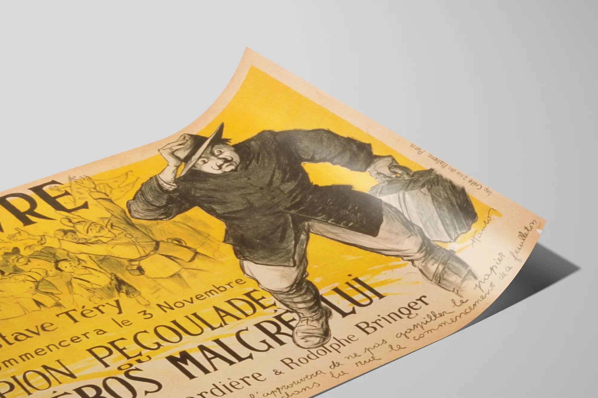 Ta oryginalna, vintage plakat przedstawia reklamę "L'Œuvre" Gustave'a Téry'ego, zapowiadającą rozpoczęcie dzieła zatytułowanego "Scipion Pégoulade albo bohater mimo wszystko" od 3 listopada. Ta grafika stanowi element dekoracji ściennej w stylu retro, łącząc rysunek konturowy z dominującymi żółtymi barwami, które dodają całości ciepła i dynamizmu. Plakat ukazuje główną postać w ruchu, ubraną w kapelusz, z wyrazistym wyrazem twarzy i zaskoczonym lub zdeterminowanym wyrazem, trzymającą walizkę, podczas gdy w tle radosna i entuzjastyczna grupa świętuje wydarzenie. Kontrast między postacią na pierwszym planie a tłumem w tle tworzy piękną głębię wizualną, która natychmiast przyciąga uwagę. Idealny jako dekoracja ścienna w wnętrzu w stylu vintage, ten plakat jest doskonały dla miłośników grafiki i starych ilustracji inspirowanych francuską prasą i kulturą popularną. Dzieło, podpisane odręcznie, odzwierciedla urok reklam z początku XX wieku, z ręcznie pisanym i starannie typograficznym tekstem, który dodaje plakatowi dodatkowej autentyczności. Ten obraz na ścianę można użyć do ozdobienia ściany w biurze, salonie lub przestrzeni do czytania, wprowadzając unikalną atmosferę artystyczną i kulturalną. Wybierając ten plakat jako dekorację ścienną, zapraszasz historię i styl artystyczny minionej epoki, aby upiększyć swoją przestrzeń życiową, jednocześnie podkreślając drukowane dzieło, które nawiązuje do literatury i teatru francuskiego sprzed lat.