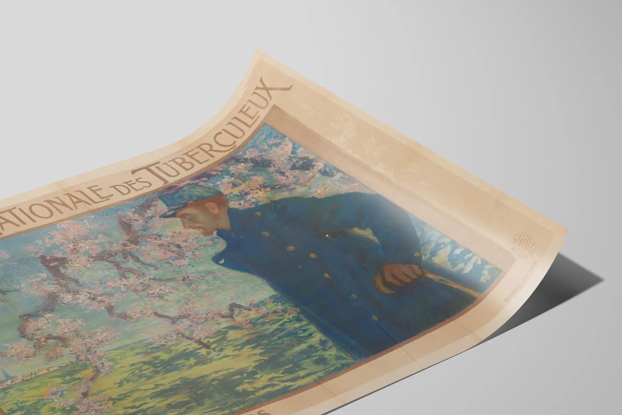 Poznaj tę starą i rzadką plakat zatytułowany „Dzień Narodowy byłych wojskowych chorych na gruźlicę”, unikalny element dekoracji ściennej, który wnosi do Twojego wnętrza odrobinę historii i pamięci. Na tym plakacie przedstawiony jest były żołnierz, ukazany na świeżym powietrzu pod kwitnącym drzewem, symbolem odnowy i nadziei. Postać ubrana jest w ciemnoniebieski wojskowy płaszcz i trzyma laskę, podkreślając swój status i przeszłe walki. Tło wypełnia jasny krajobraz wiejski, z akcentami zieleni i różu, co nadaje tej grafice spokojną i nostalgiczną atmosferę.