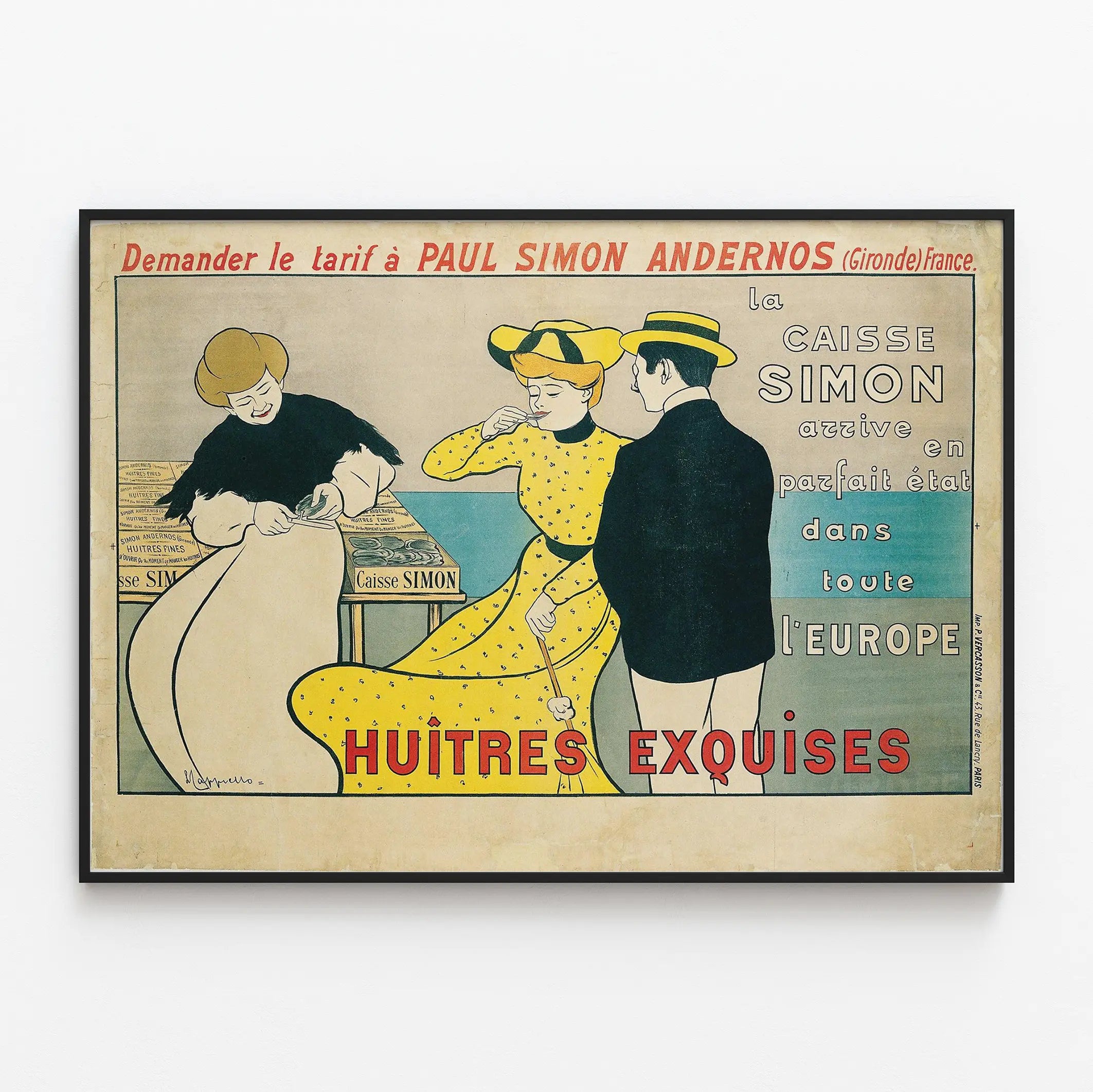 Ta vintage plakat zatytułowany „Caisse Simon” przedstawia reklamę na temat delikatnych i wyśmienitych ostryg. Ukazuje trzech elegancko ubranych bohaterów w stylu dawnym: kobietę w żółtej sukni degustującą ostrygę, mężczyznę w czarnej marynarce i kapeluszu oraz inną kobietę, która otwiera ostrygę nożem. W tle widoczne są kilka skrzyń z napisem „Caisse Simon”, podkreślając wysoką jakość i świeżość oferowanych ostryg.