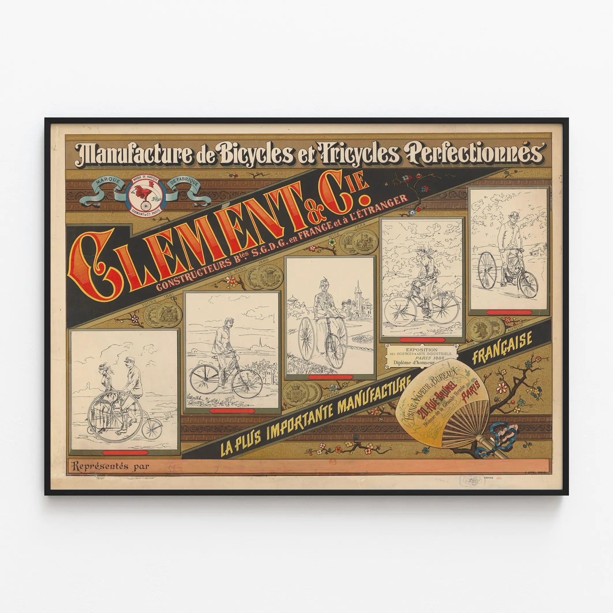 Ta vintage plakat przedstawia Fabrykę Doskonalszych Rowerów i Trójkołowców Clément & Cie, renomowaną francuską pracownię słynącą z opatentowanych konstrukcji S.G.D.G. we Francji i za granicą. Ten stylowy plakat z dawnych czasów podkreśla doskonałość i renomę marki Clément & Cie, z typowym dla końca XIX wieku projektem graficznym. Na ozdobnym i dekoracyjnym tle tekst jest wyeksponowany za pomocą jaskrawych czerwonych i żółtych liter, kontrastujących z czarnym i brązowym tłem. Plakat ozdobiony jest medalami i odznaczeniami, przypominającymi o wyróżnieniach zdobytych przez fabrykę na różnych wystawach regionalnych i krajowych, w tym na wystawie nauk i przemysłowych sztuk w Paryżu w 1886 roku, gdzie otrzymała dyplom honorowy.
