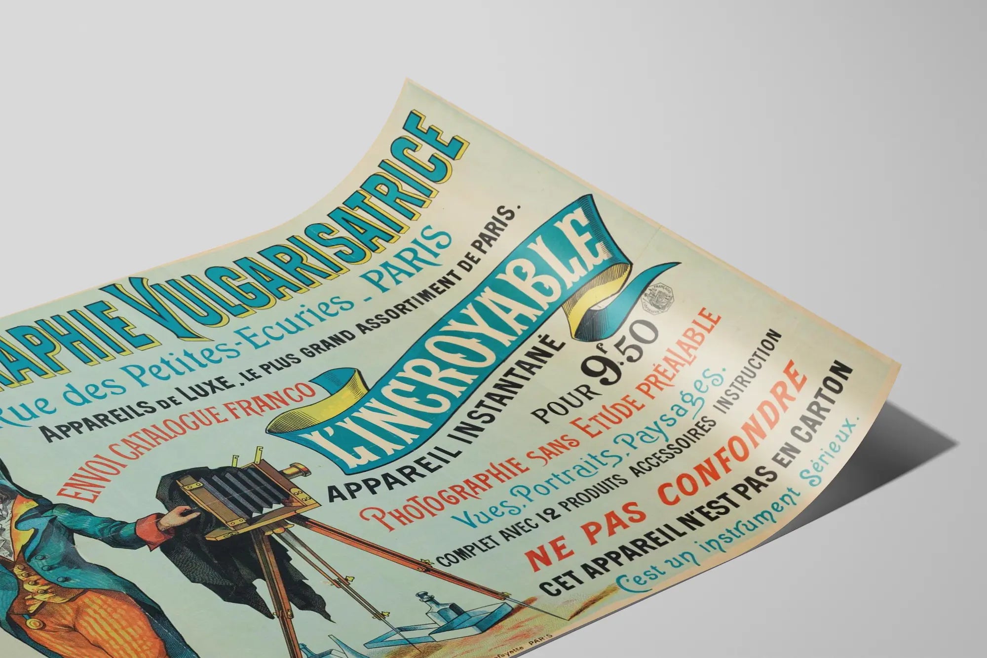 Ta plakat vintage zatytułowany „Fotografia Vulgarisatrice” to dekoracja ścienna pełna uroku, idealna dla miłośników historii fotografii i stylu retro. Wydrukowana w żywych kolorach, przedstawia starożytne urządzenie fotograficzne na statywie oraz postać w stroju z epoki, odzwierciedlając styl reklam z początku XX wieku. Tekst na plakacie wspomina o „aparatcie instant” o nazwie „niewiarygodny”, podkreślając jego oryginalność za pomocą różnorodnej, kolorowej typografii, która natychmiast przyciąga uwagę.