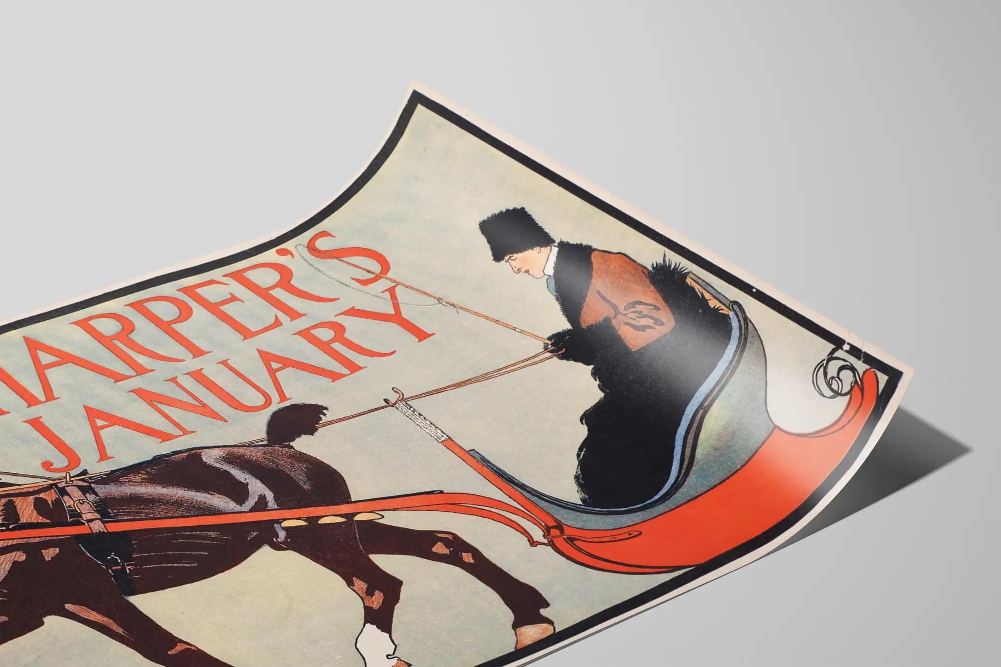Plakat vintage Harper's styczeń z koniem i saniami