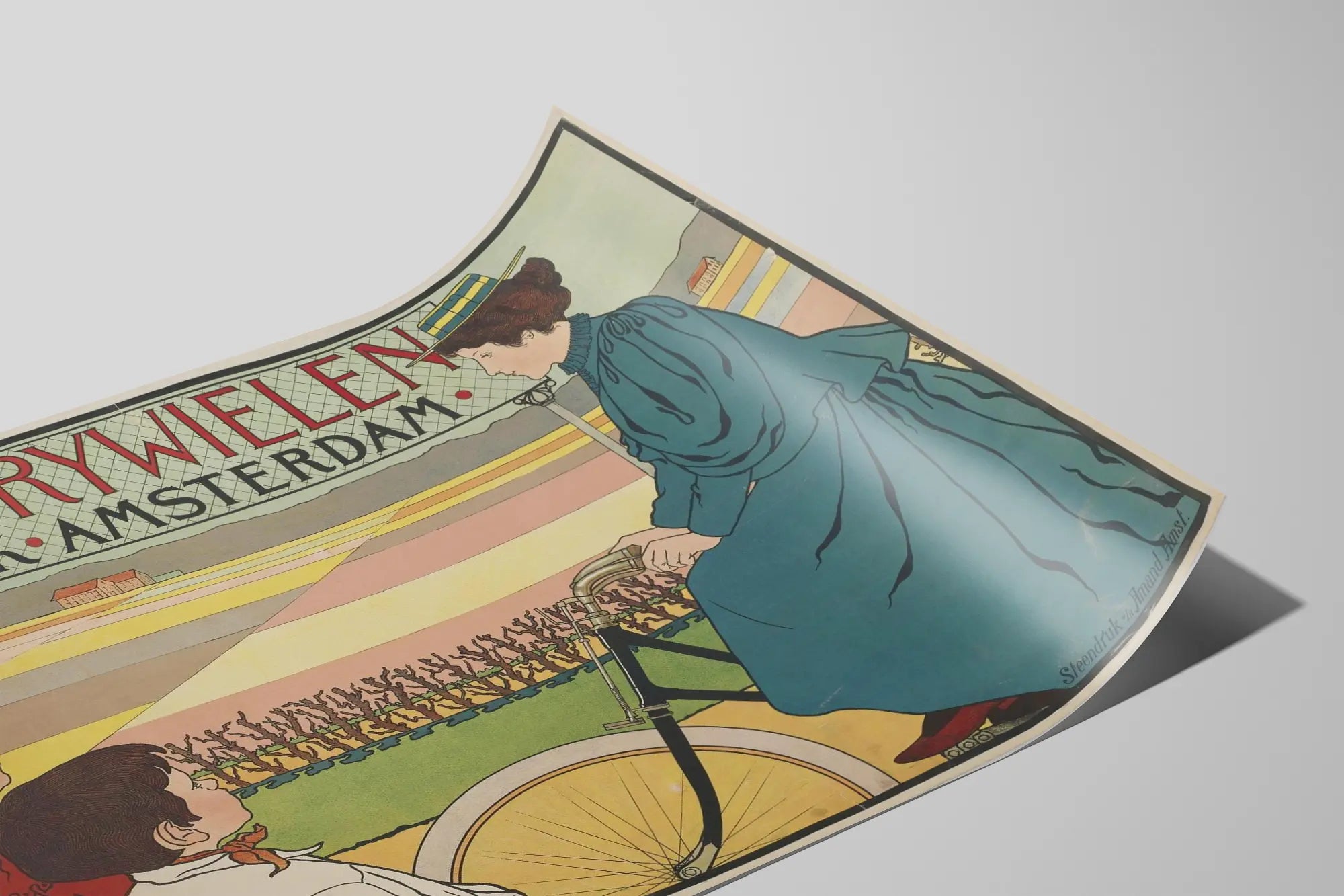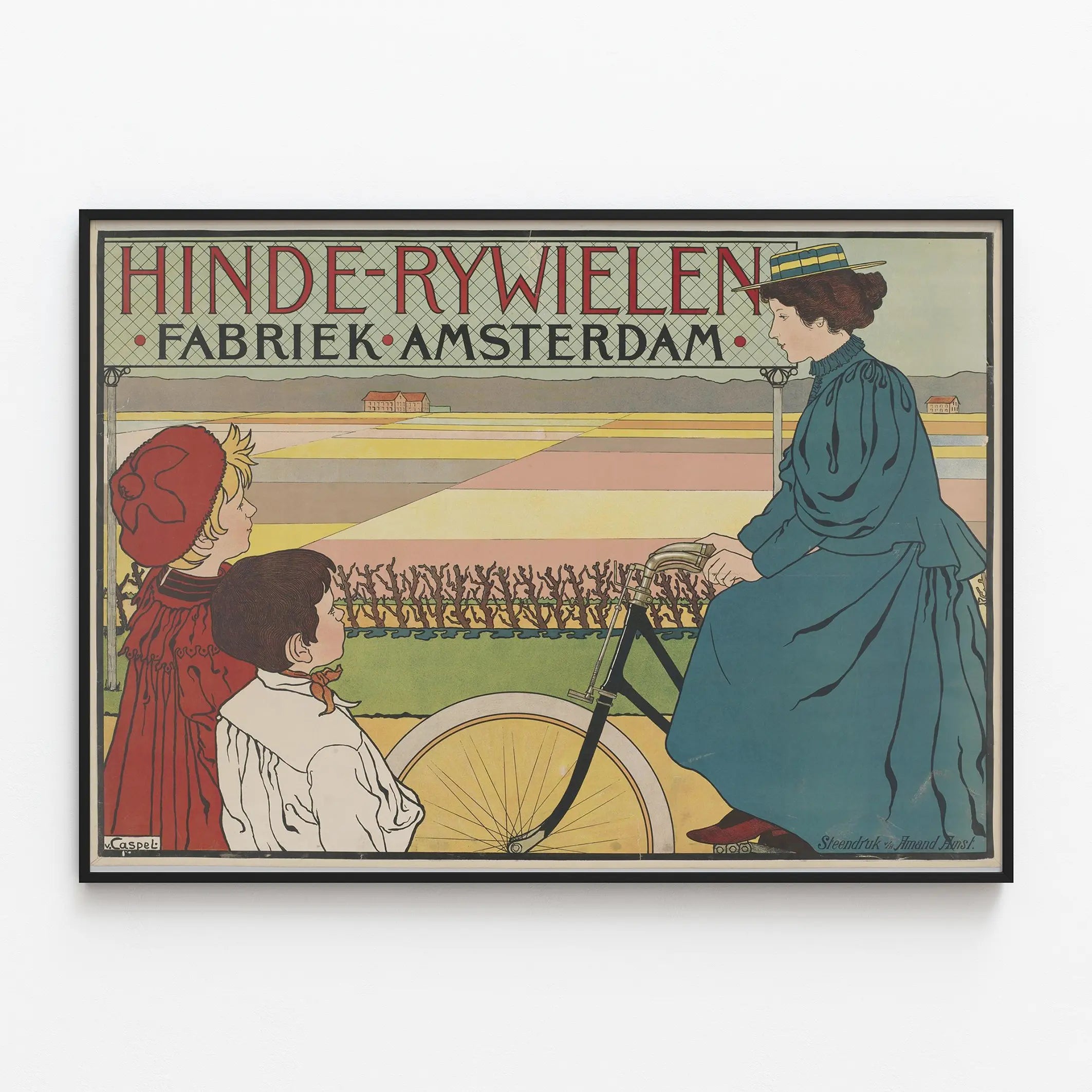 Ta vintage'owa plakat zatytułowana „Hinde Rywielen Fabriek Amsterdam” to wyjątkowy element dekoracji ściennej, który doda wnętrzu nutę retro i artystycznego wyrafinowania. Przedstawiając scenę z dawnych czasów, ta ilustracja ukazuje elegancką damę w strojnej sukni, siedzącą na starym rowerze, obserwowaną przez dwójkę dzieci. Styl graficzny, z precyzyjnie narysowanymi liniami i delikatnymi kolorami, doskonale oddaje sztukę reklamy z przeszłości i ukazuje autentyczny, nostalgiczy urok. Tekst u góry plakatu, w czerwonych i czarnych wielkich literach, wyraźnie wskazuje pochodzenie i temat tej reklamy: fabrykę rowerów z Amsterdamu. Ta plakat jest idealny dla miłośników vintage'owych dekoracji ściennych, starych plakatów reklamowych lub do każdego wnętrza, które pragnie wprowadzić retro atmosferę z europejskim akcentem. Jego poziomy format i pastelowe odcienie, połączone z wyraźnymi elementami graficznymi, tworzą harmonijną równowagę wizualną, doskonałą do ozdoby salonu, biura czy sklepu specjalistycznego. Niezależnie od tego, czy pasjonujesz się rowerami, sztuką graficzną, czy po prostu szukasz oryginalnego plakatu, ten wydruk przywołuje epokę, w której rower był już symbolem mobilności i elegancji. Ten vintage'owy plakat jest hołdem dla przemysłu i designu Amsterdamu, odzwierciedlając bogatą historię lokalną i ponadczasową estetykę, idealną do autentycznej i wyrafinowanej dekoracji ściennej.
