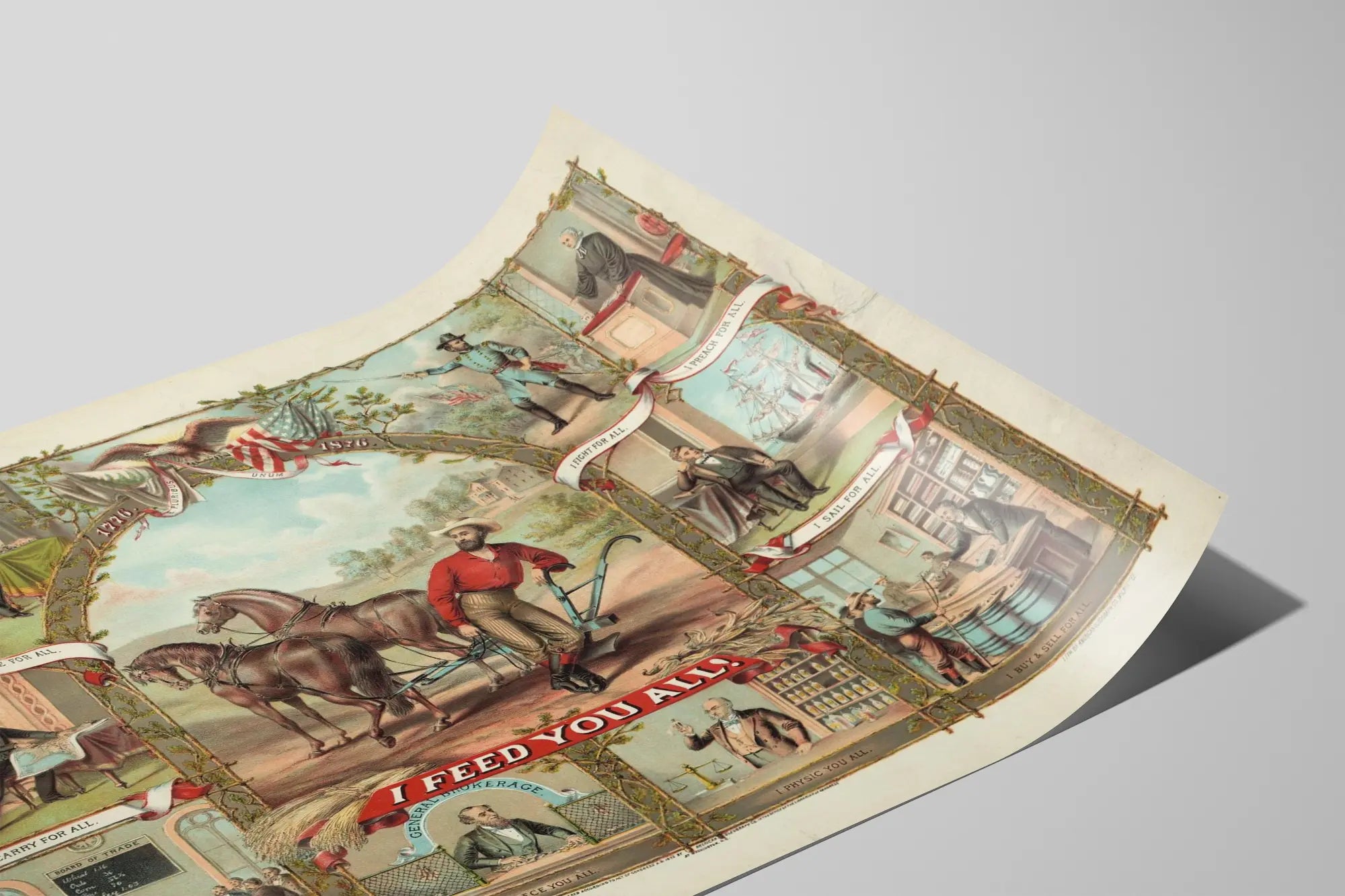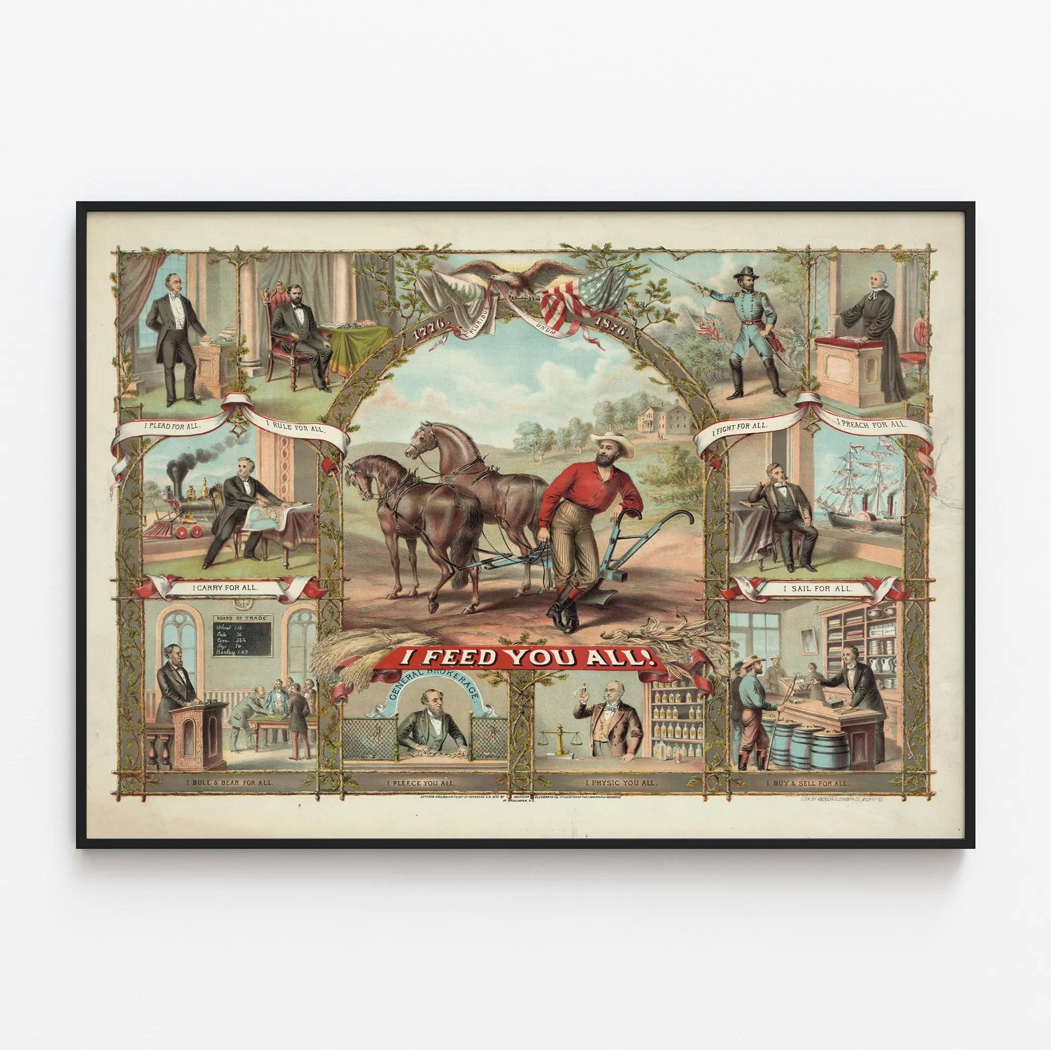 Ta plakat vintage zatytułowany „I Feed You All” przedstawia bogatą i szczegółową kompozycję symbolizującą różne zawody i role w amerykańskim społeczeństwie, podkreślając różnorodność działań niezbędnych dla życia zbiorowego. W centrum znajduje się rolnik z dwoma końmi zaprzężonymi do pługa, co ilustruje znaczenie rolnictwa dla wyżywienia ludności. Ta scena centralna jest otoczona przez kilka miniatur ukazujących inne profesje i działania.