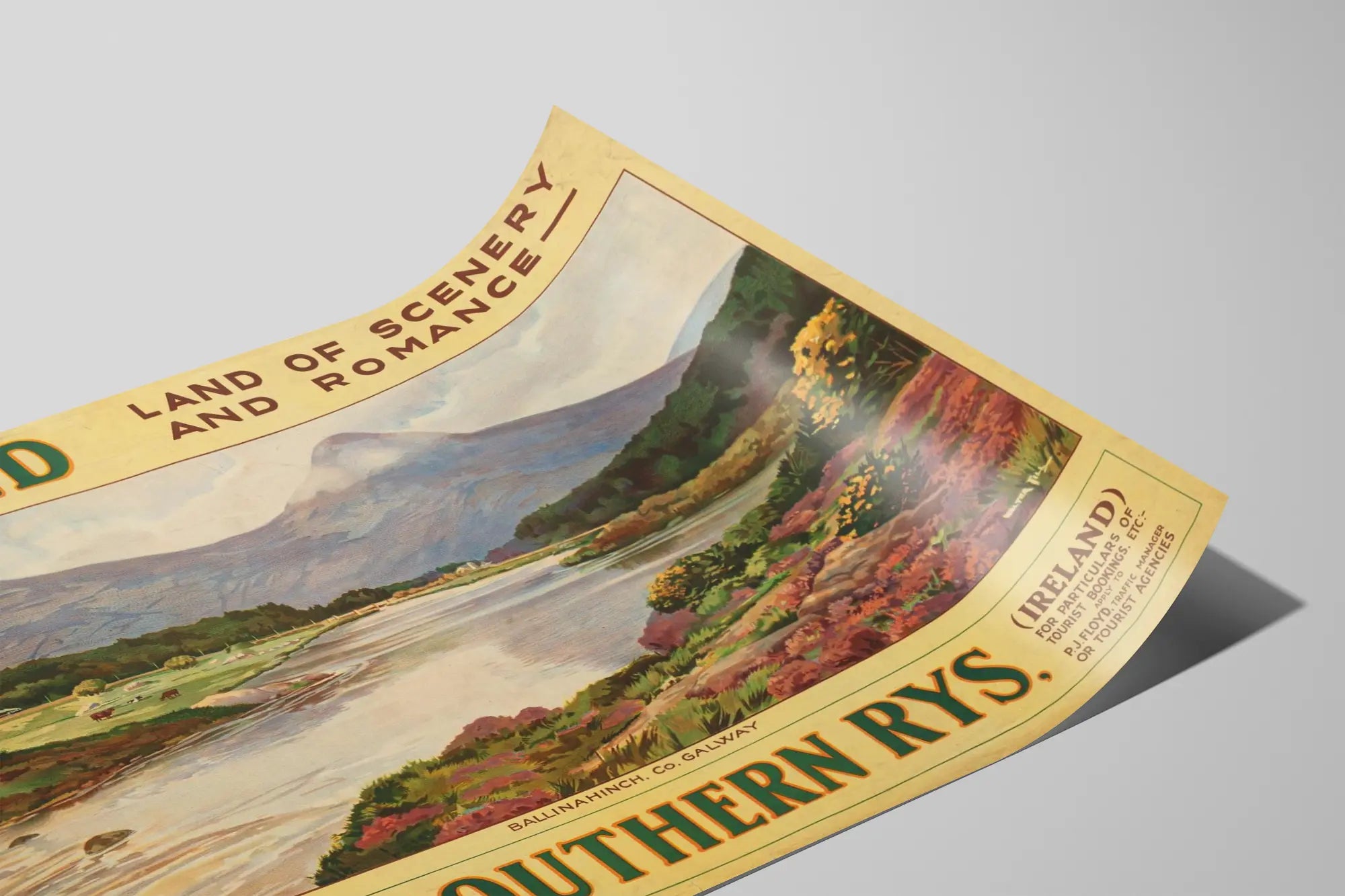 Ta plakat vintage przedstawia przepiękny pejzaż naturalny Irlandii, dokładniej w Ballinahinch w hrabstwie Galway. Ukazuje spokojny i romantyczny krajobraz, podkreślając zielone wzgórza, rzekę o łagodnych refleksach oraz bujną naturę z kwitnącymi krzewami i kamieniami. Plakat dumnie nosi napisy „IRELAND”, „Land of Scenery and Romance” oraz „Great Southern Rys”, które zachęcają do podróży w serce irlandzkich krajobrazów.